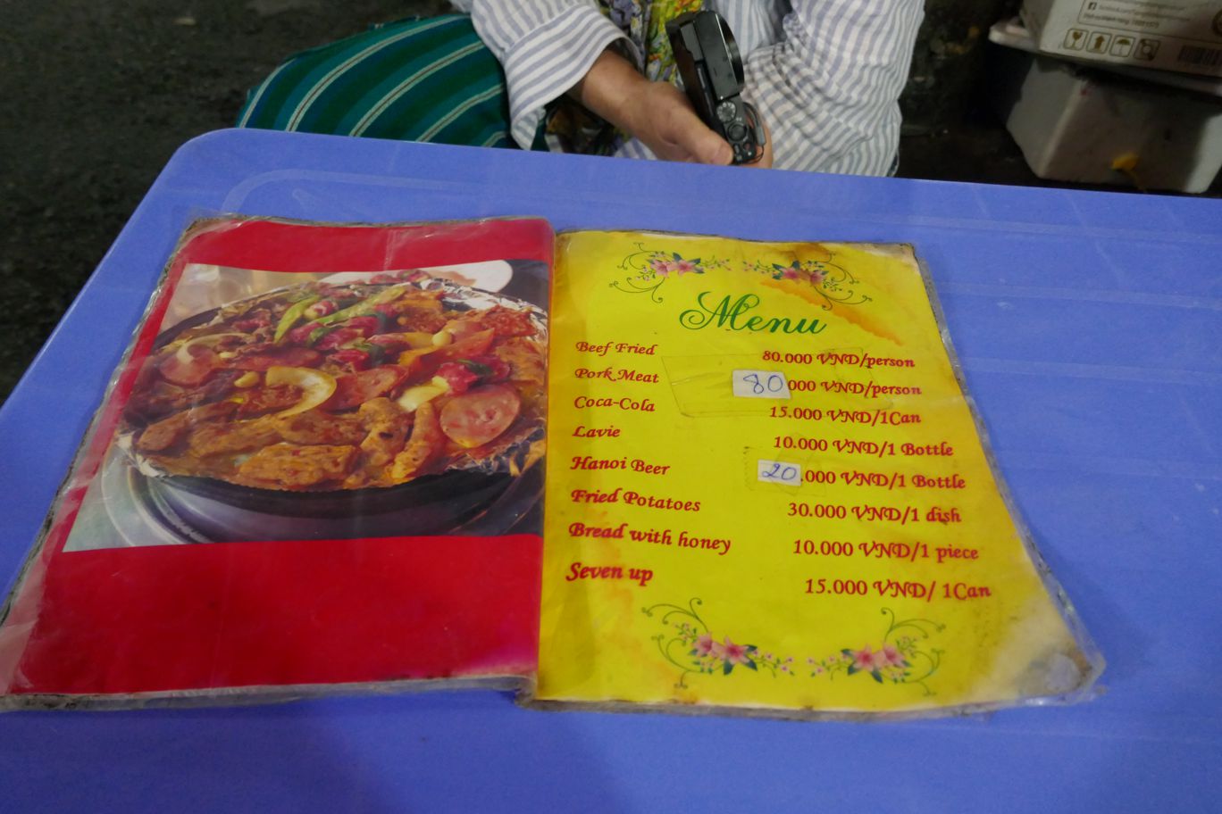 An einem Tischchen neben zwei jungen Frauen finden wir Platz. Die Speisekarte ist eher abenteuerlich, nicht sehr vielfältig, aber den vielen Flecken und abgenutzten Ecken nach gut in Gebrauch.