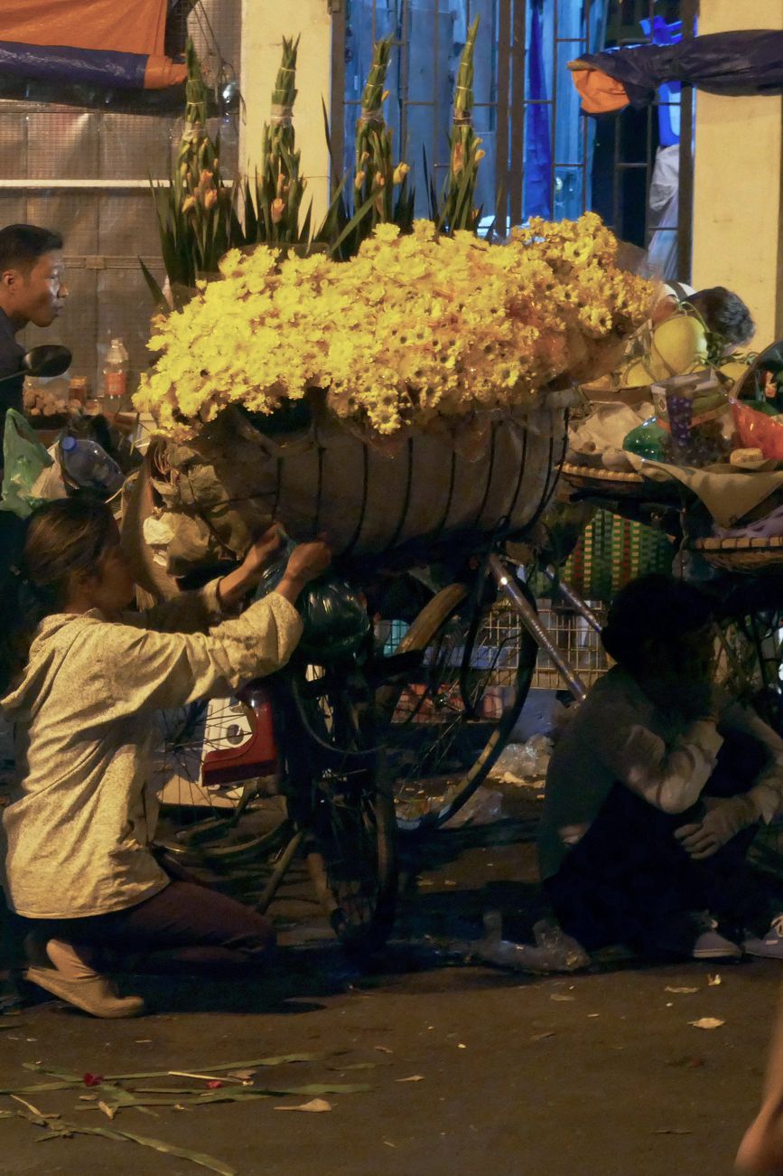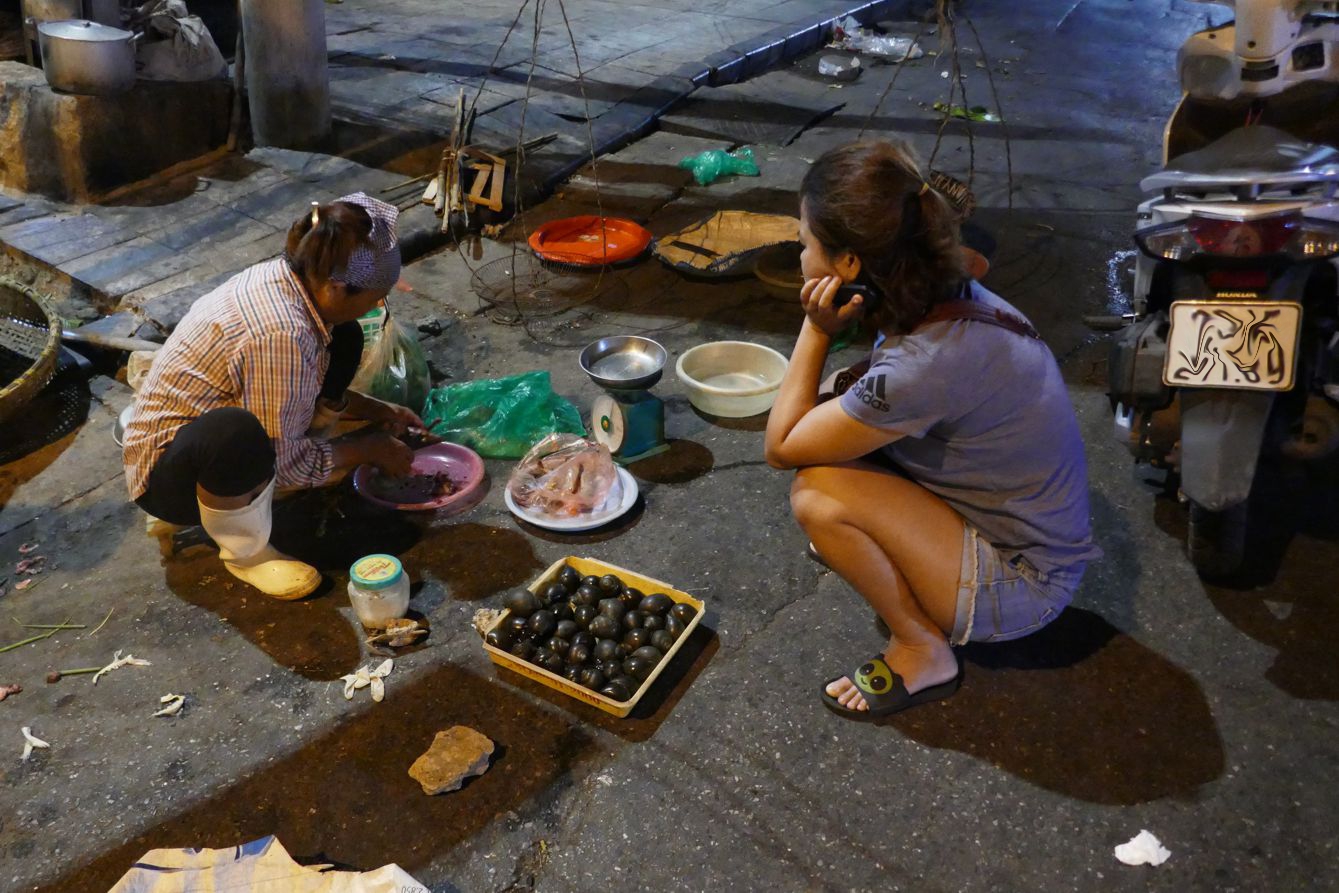 Auf dem Nachtmarkt wird noch rege verkauft, Gemüse, Obst, Eier, Fleisch. An einigen Ständen wedeln die Verkäuferinnen heftig mit Zeitungen – die Mücken sind zu verscheuchen. Der Blumenmarkt befindet sich langsam in Auflösung.