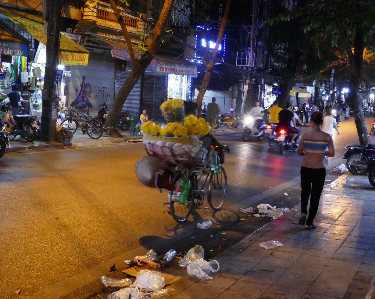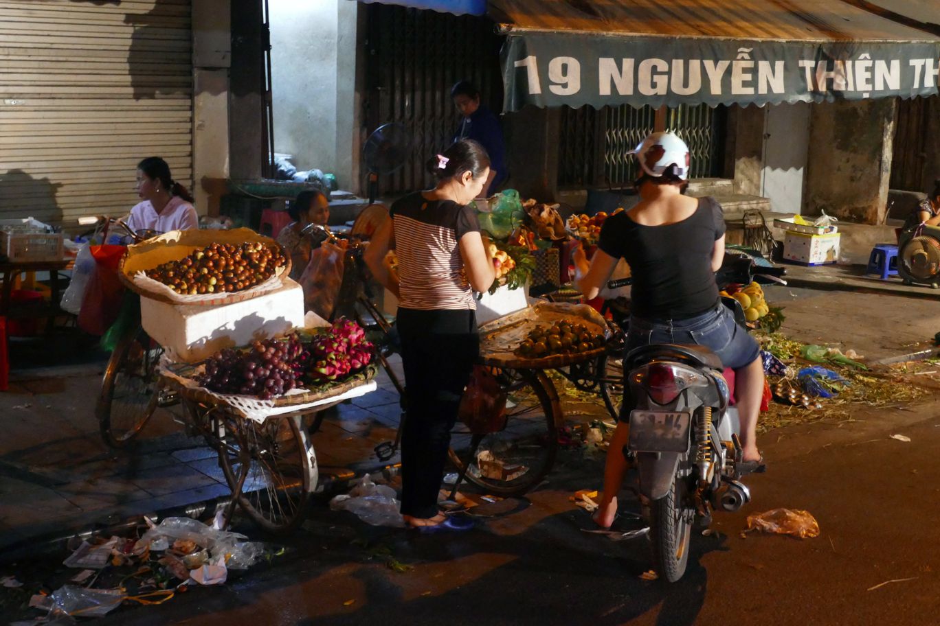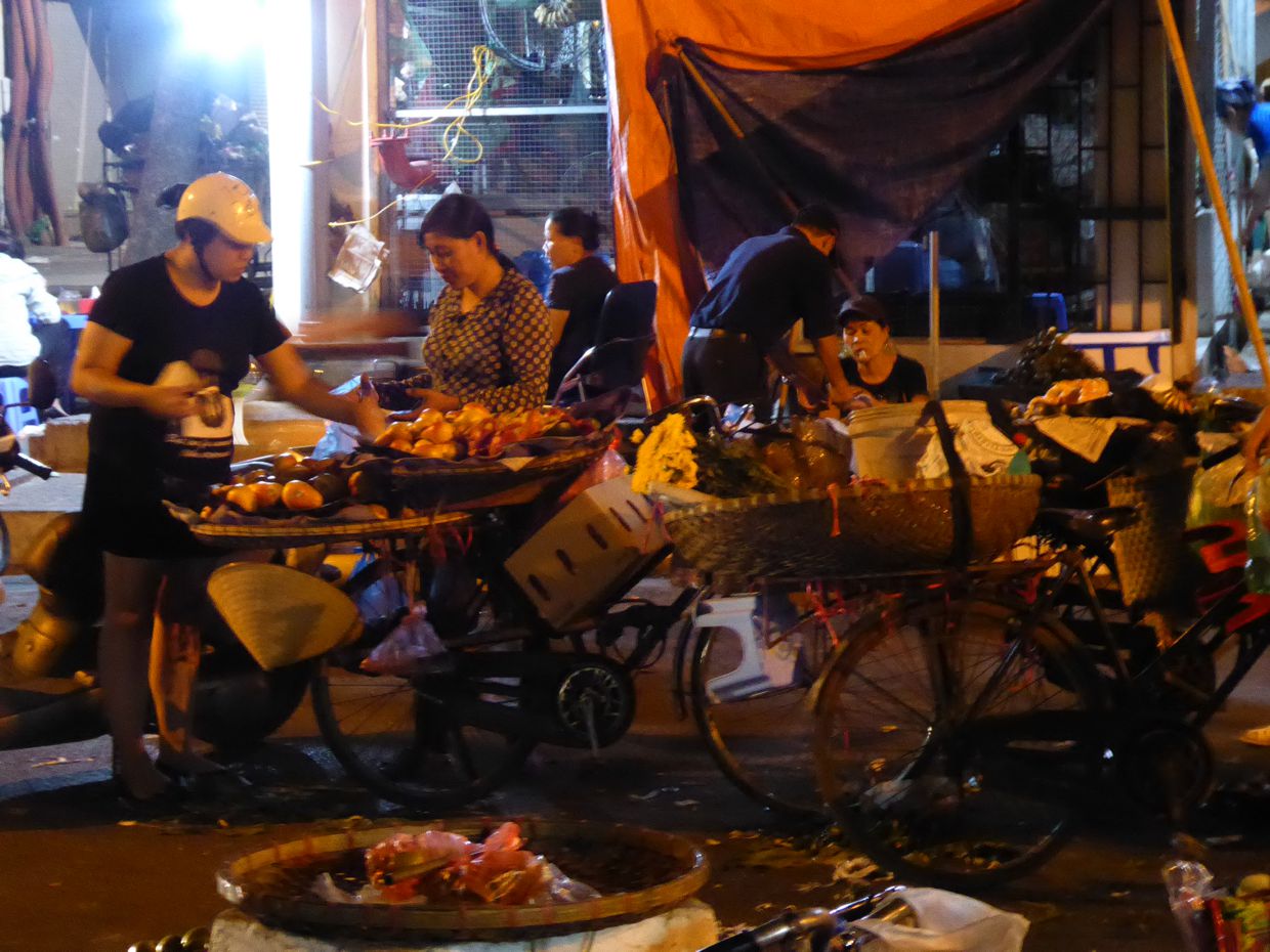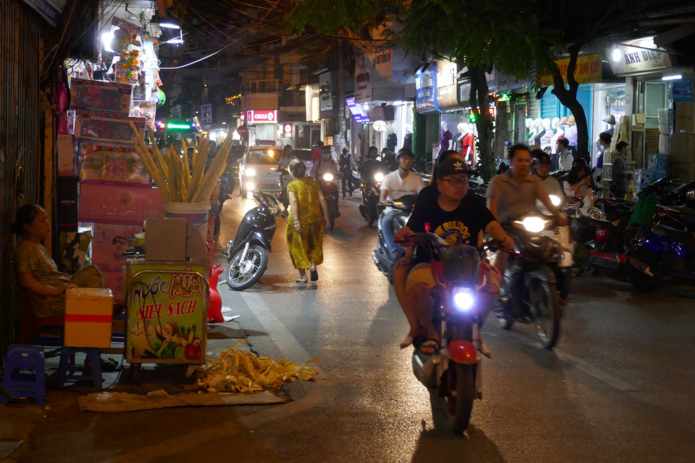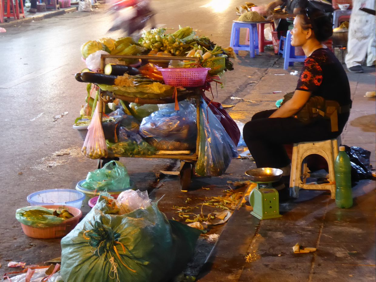 Die Stadt zeigt sich am Abend noch mehr als eine nächtliche, aber doch bunte Mischung des Alltagslebens. Viele Menschen sind unterwegs, stehen zusammen, unterhalten sich, kaufen ein, essen. Garküchen, kleine Restaurants, Blumenläden, Apotheken, Elektrogeschäfte, Lebensmittelhändler – alles geöffnet und gut durchmischt in den Straßen zu sehen und zu erleben. Auf den Gehsteigen wird verkauft – Obst, Gemüse, Fleisch, Eier oder was auch immer; in einigen Straßen ist richtiger Straßenmarkt. Und überall ist dichtes Gewusel – Menschen, Moped, Fahrräder, Rikschas, Autos.