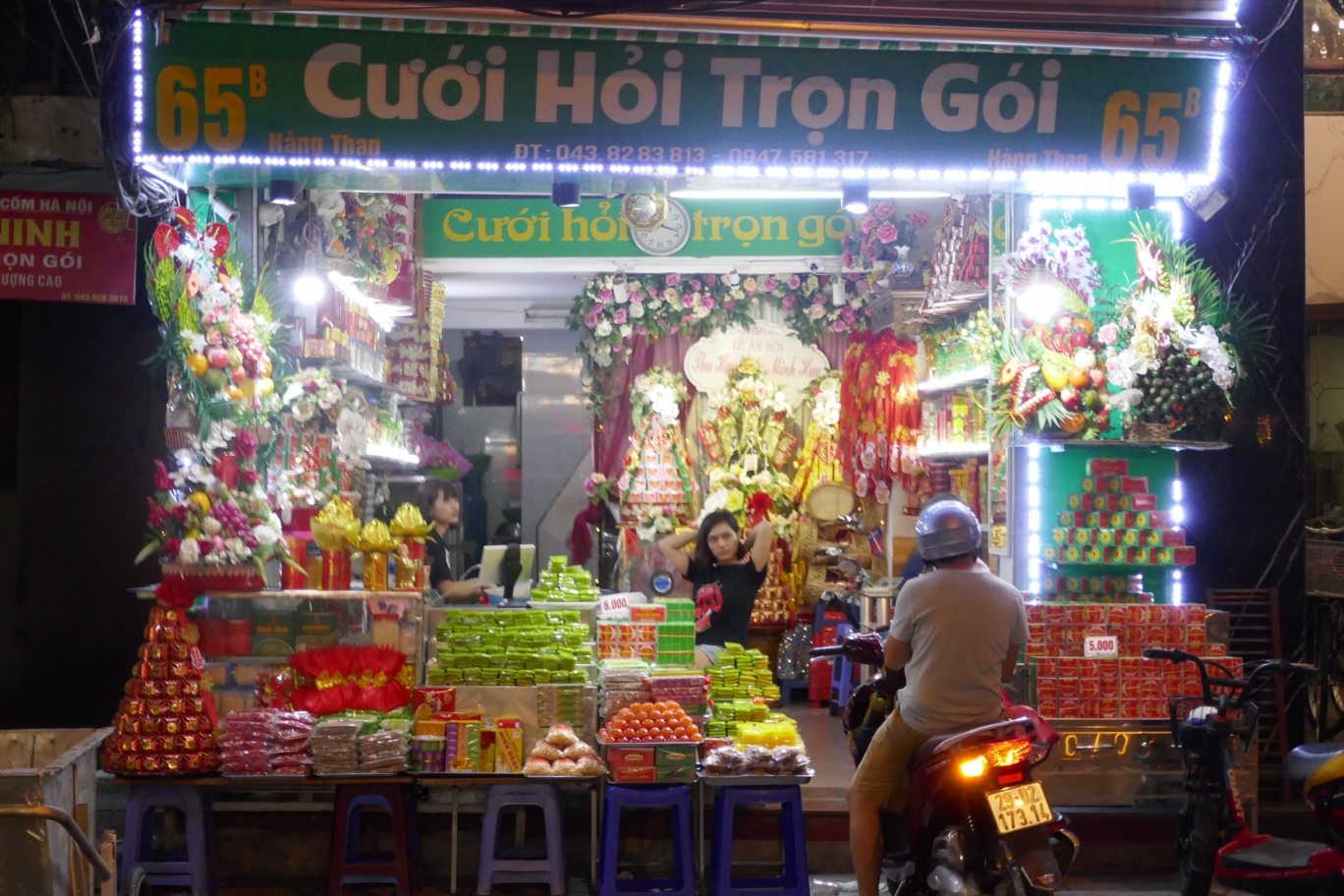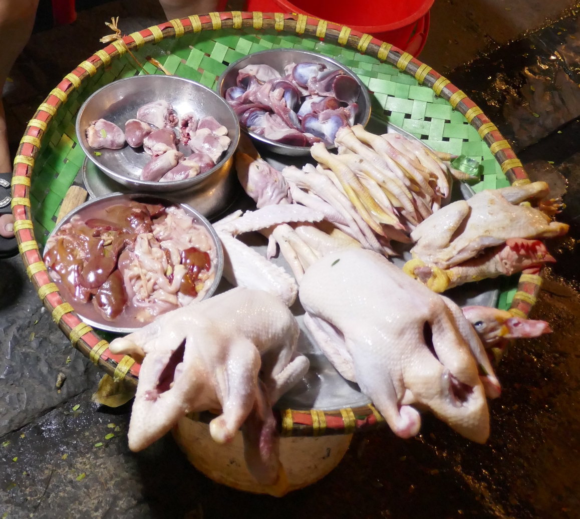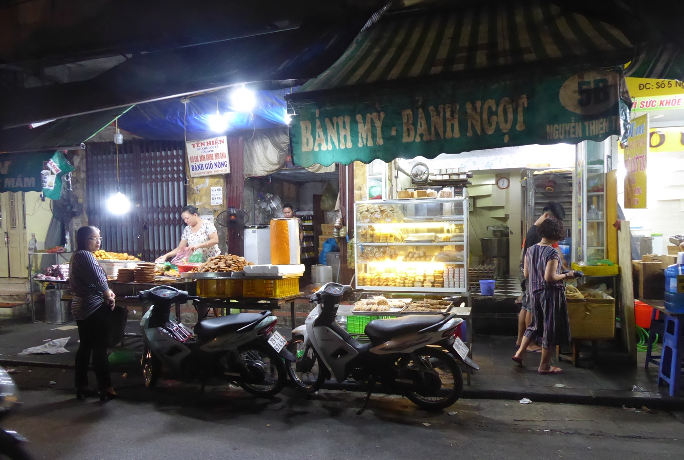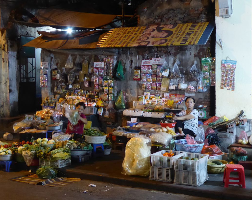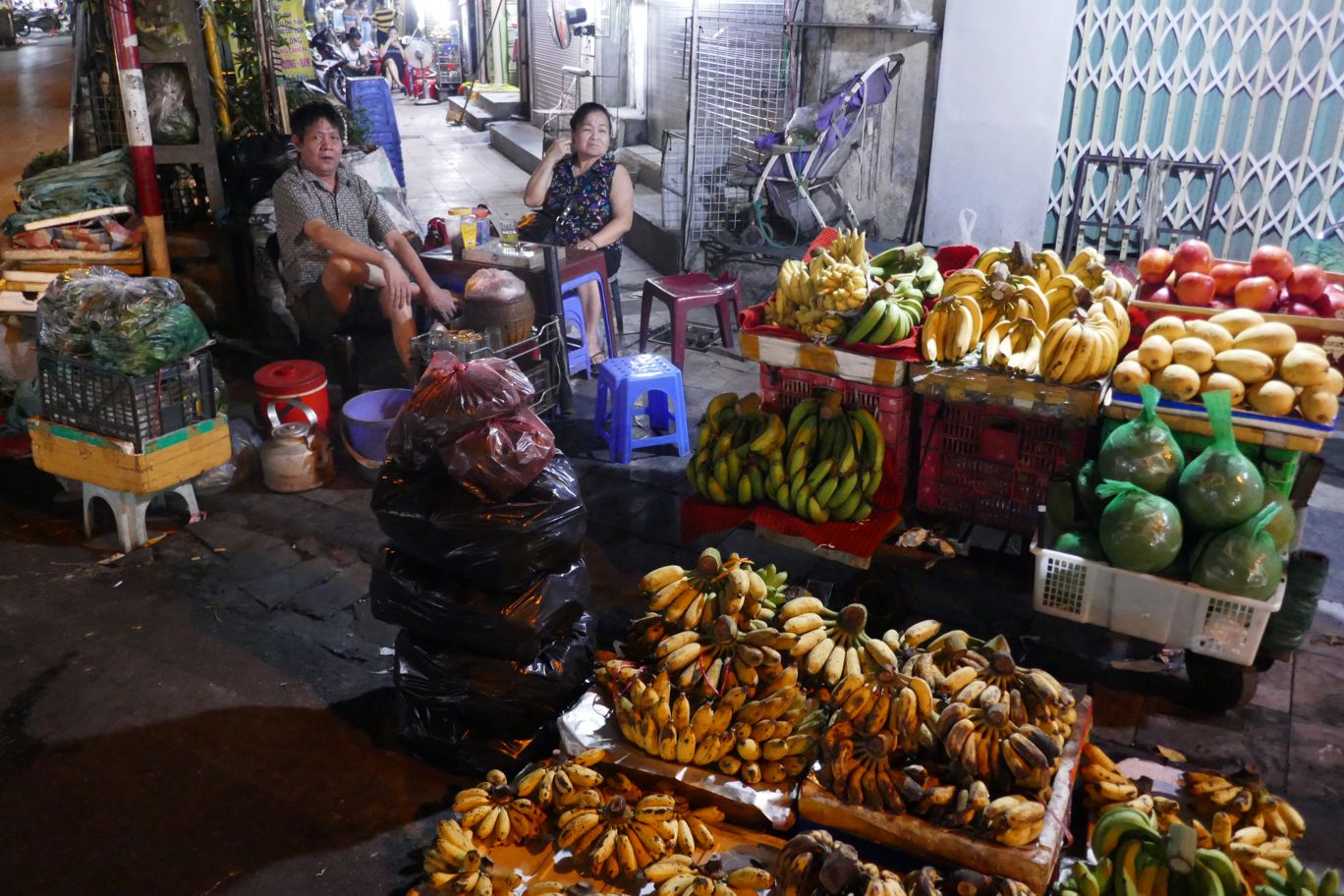 Die Stadt zeigt sich am Abend noch mehr als eine nächtliche, aber doch bunte Mischung des Alltagslebens. Viele Menschen sind unterwegs, stehen zusammen, unterhalten sich, kaufen ein, essen. Garküchen, kleine Restaurants, Blumenläden, Apotheken, Elektrogeschäfte, Lebensmittelhändler – alles geöffnet und gut durchmischt in den Straßen zu sehen und zu erleben. Auf den Gehsteigen wird verkauft – Obst, Gemüse, Fleisch, Eier oder was auch immer; in einigen Straßen ist richtiger Straßenmarkt. Und überall ist dichtes Gewusel – Menschen, Moped, Fahrräder, Rikschas, Autos.