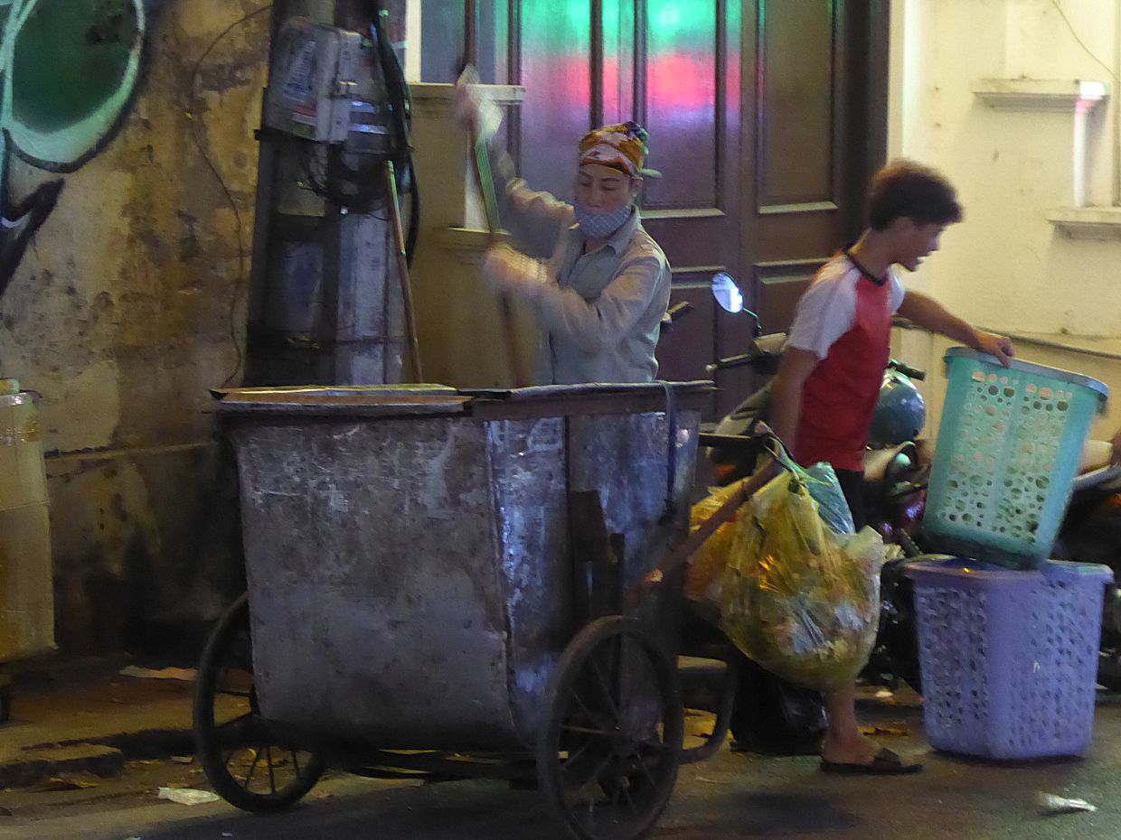 Aber auch an diesem Abend holt uns die Vergangenheit Vietnams wieder ein. Ein Bettler, dem eine Mine beide Füße weggerissen hat, bewegt sich die Straße entlang und verkauft Papiertaschentücher. Er hat ein kleines Brett mit kleinen Aufsatzfüßen dabei, auf dem er mit dem beinlosen Unterkörper sitzt. Um sich fortzubewegen, hangelt er sich mit den Armen nach vorne, zieht das Brettchen nach und setzt sich darauf. Man muss diesen Mann bewundern, der sein Schicksal so beherzt angeht, und den dieser Schicksalsschlag zwingt, sich so durch die Stadt zu bewegen auf der Suche nach Essen, um zu Überleben. Es sind nur kleine Scheine, die er erhält – aber fast jeder gibt etwas, und nirgendwo hat man den Eindruck, dass er als lästig wahrgenommen wird; ihm wird geholfen. Es ist ungewöhnlich, aber trotz des Bettlers verändert sich die Atmosphäre nicht, und die Menschen sind allesamt freundlich, winken, lächeln, freuen sich.