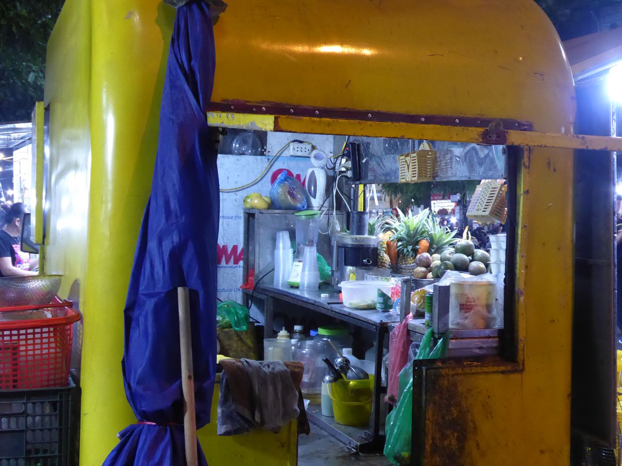 Überall gibt es Kleinigkeiten zum Essen, gekocht, gedämpft, frittiert. Einiges kommt bekannt vor, anderes eher fremd. Frühlingsrollen frisch oder frittiert kennt man; was aber in den ebenso zubereiteten Bällchen drin ist, kann man nicht einmal erraten, ob Fisch, Fleisch, Tofu, Gemüse oder was auch immer. Sehr ungewöhnlich sehen einige der Getränke aus, die da ausgeschenkt werden; mal klare, mal milchig-trübe Flüssigkeit, und drin schwimmen mal weißer oder schwarzer oder auch schrill-farbiger Glibber und ein paar Bohnen.