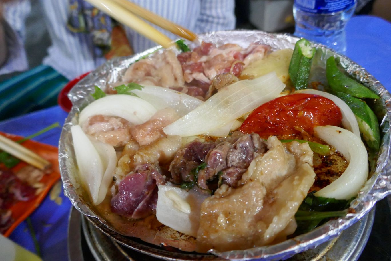 Aber nun zu unserem Abendessen. Wir entdecken in einer Seitenstraße im Halbdunkel so etwas wie eine Mischung von Garküche und Minirestaurant, soweit man die rundherum aufgestellten Hocker und Tischchen so zusammenfasst. Die Plätze sind ziemlich voll belegt, vor allem junge Leute sitzen hier und essen. Alle sind in Ausgehkleidung, nur Einheimische, soweit wir das erkennen können.