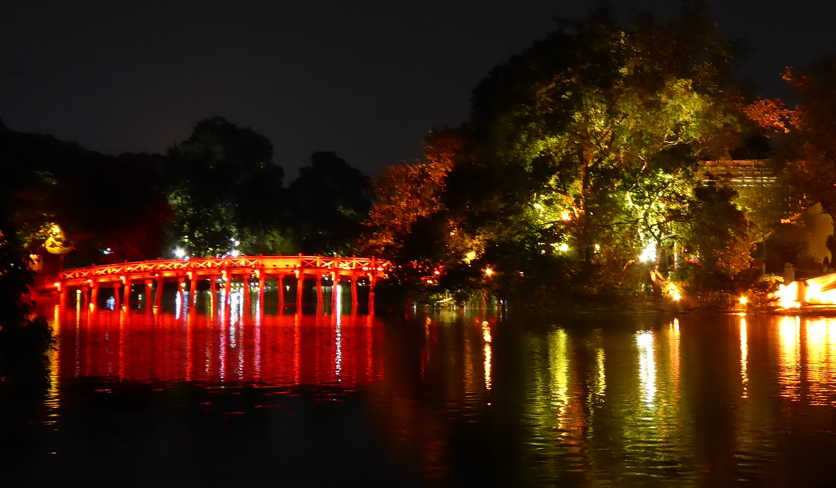 Es ist spät geworden, als die Veranstaltung im Wasserpuppentheater zu Ende ist. Gleich beim Ausgang sehen wir die rote Brücke The Huc, nun bei Nacht, jetzt auch strahlend rot beleuchtet. Draußen ist es bereits richtig dunkel. Auf der Straße, in den Geschäften und den kleinen Restaurants entlang der Straße ist fast noch mehr los wie tagsüber.