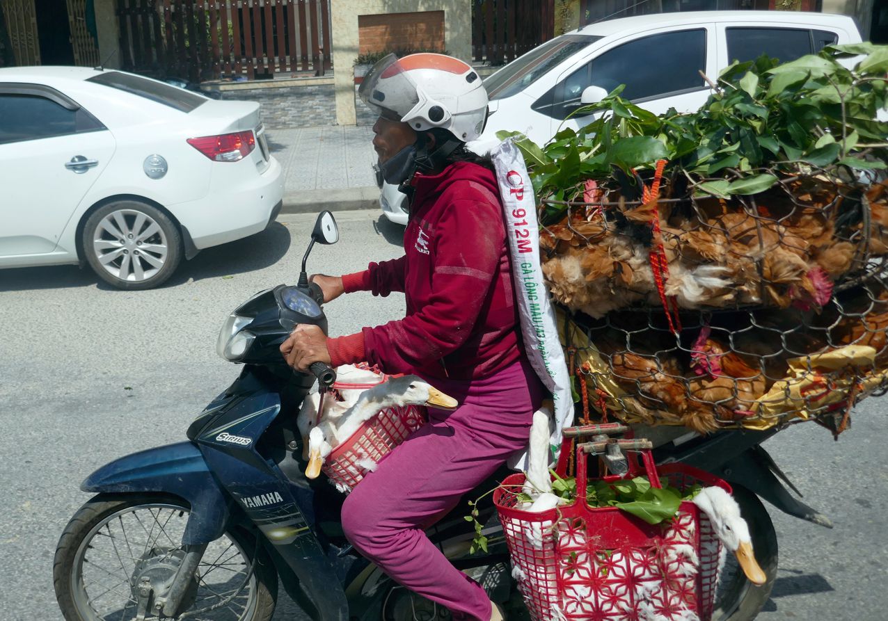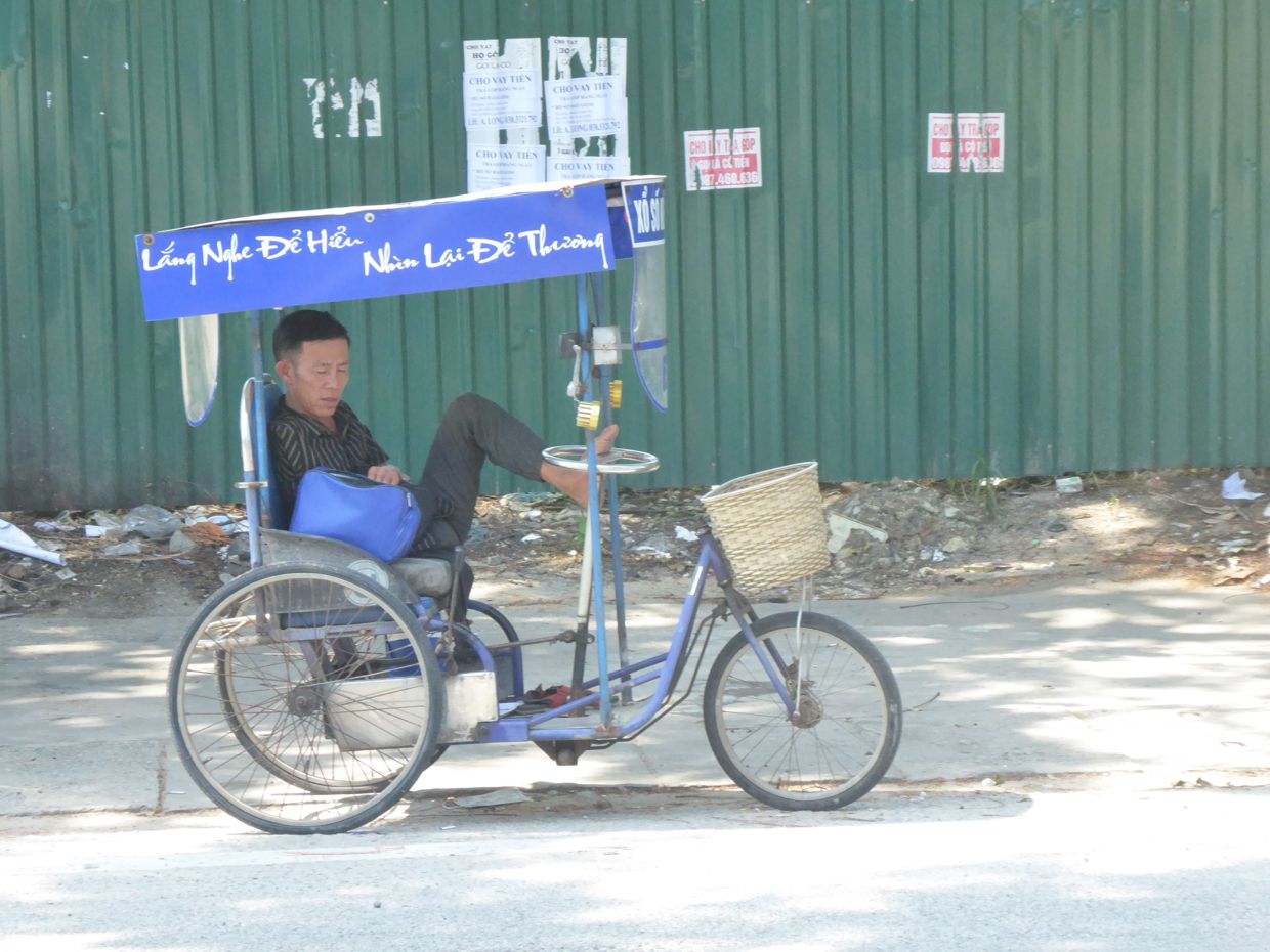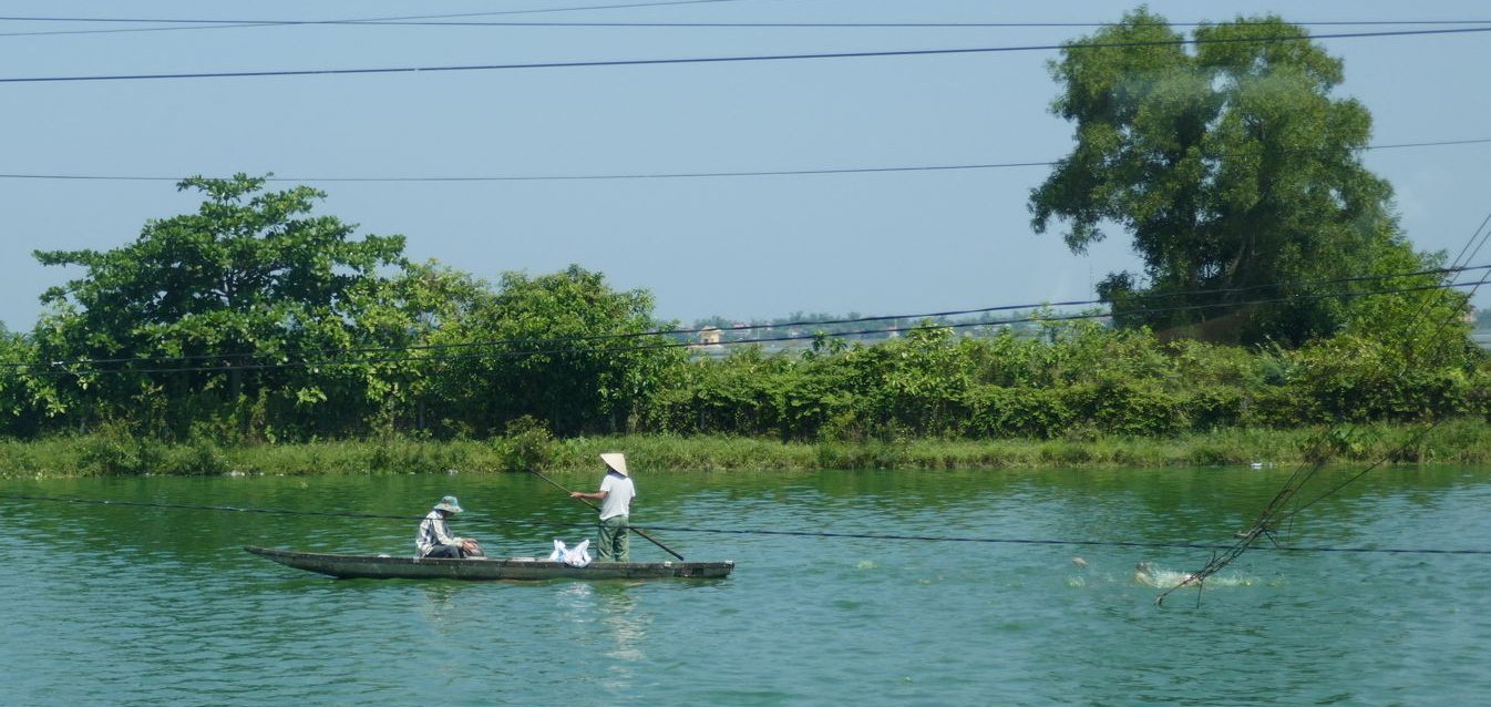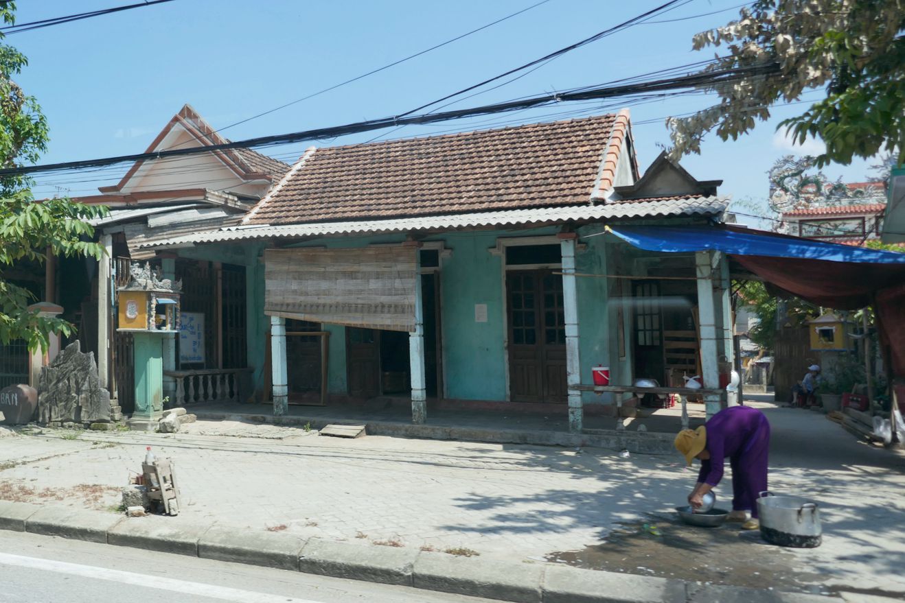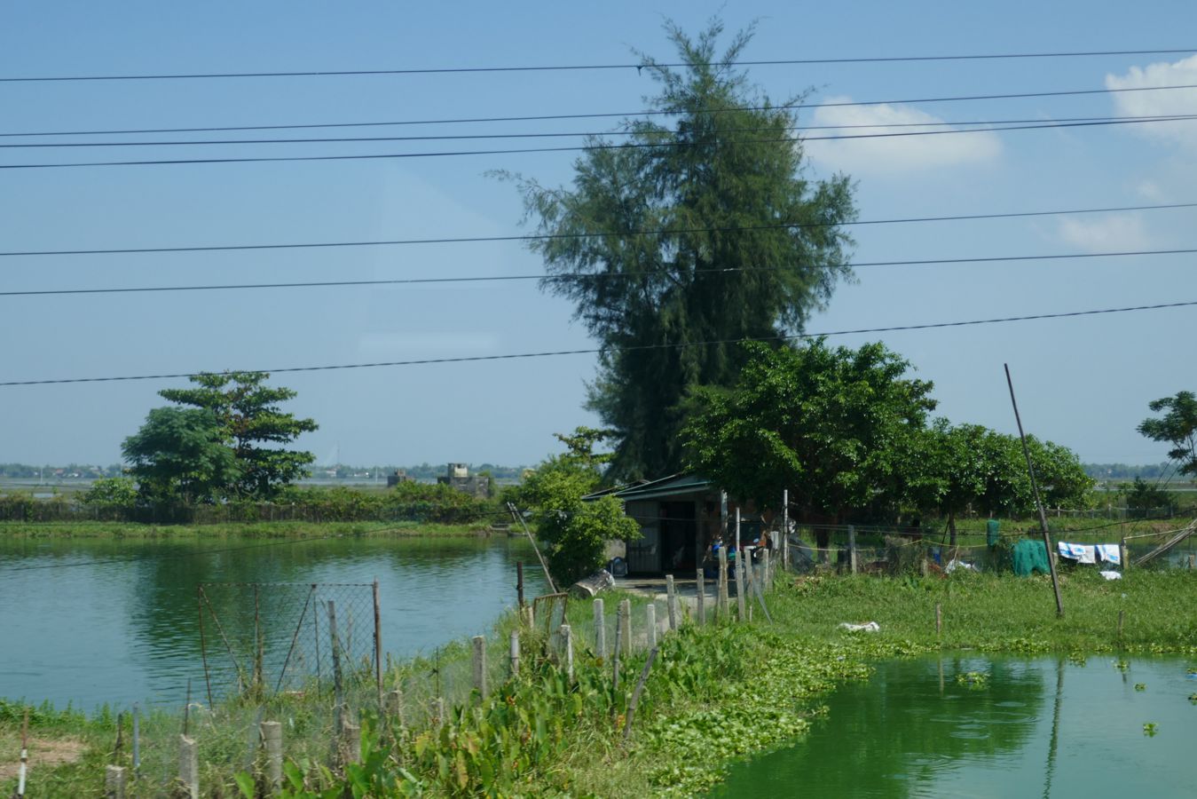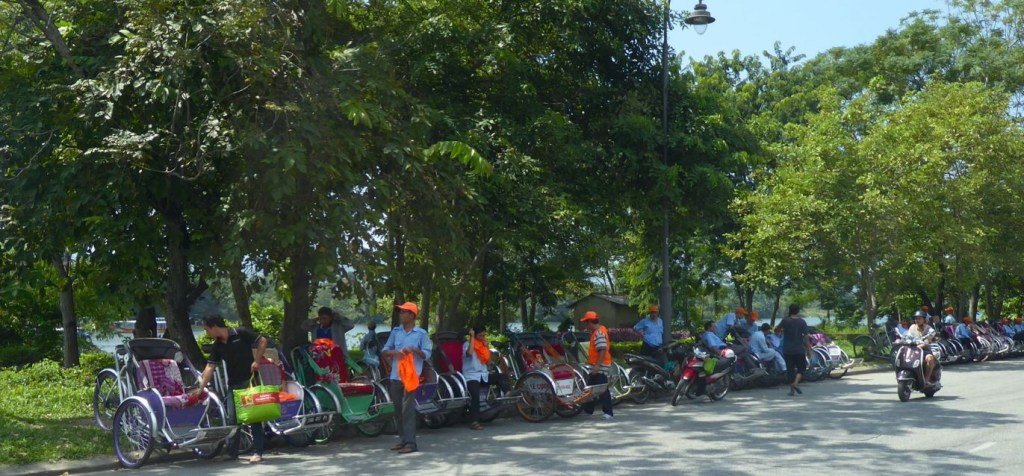 In Huè wechselt unser vietnamesischer Begleiter; wir werden am Flughafen abgeholt. Für uns geht es jetzt erst einmal mit dem Kleinbus vom Flughafen in Richtung Stadt; weitaus mehr Menschen lassen sich mit Rikschas transportieren, die aufgereiht an den Straßen auf Gäste warten. Unsere Fahrt vom Flughafen aus führt zunächst quer über Land, durch Reisfelder und kleine Dörfer.
