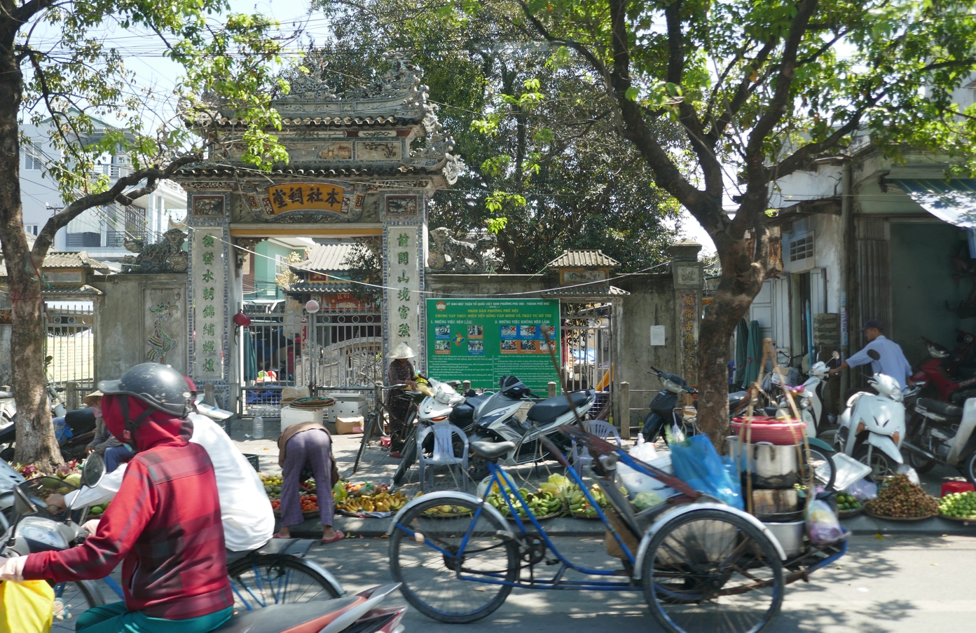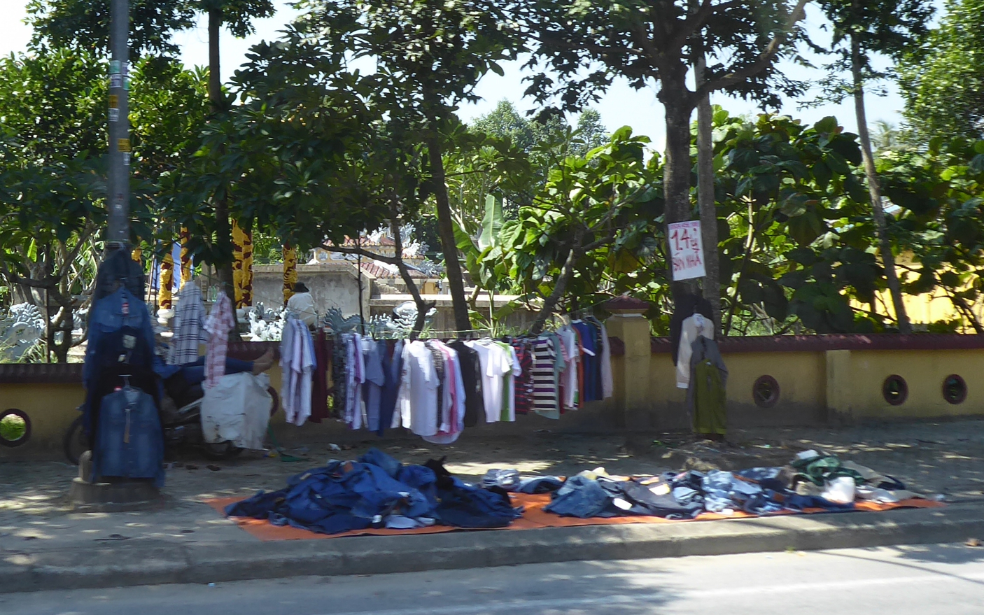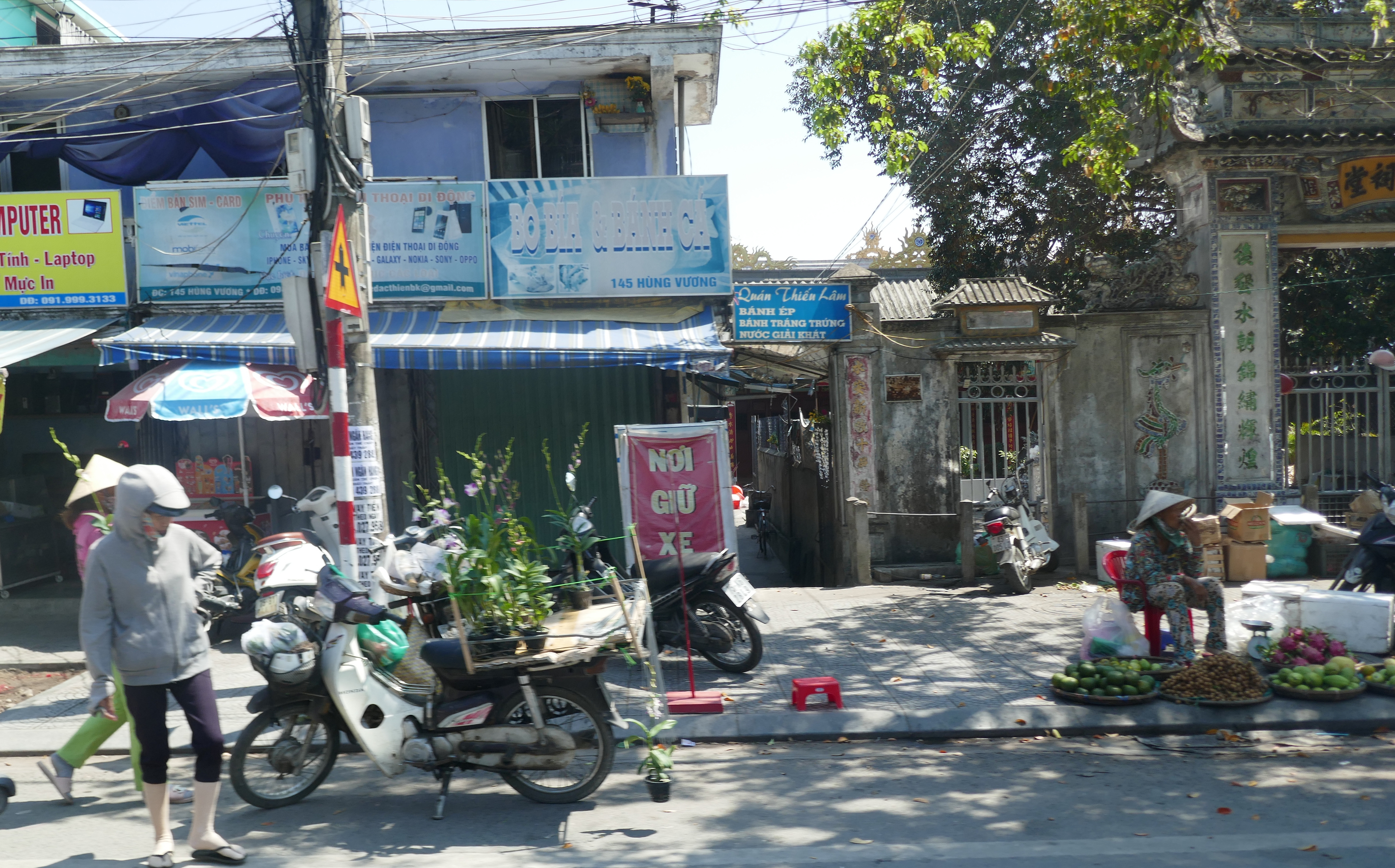 Entlang der Straßen sind eher kleine Ladengeschäfte, auf den Fußgängerwegen wird Obst und Gemüse angeboten, das aus den heimischen Gärten zu stammen scheint. Jetzt in der Mittagszeit brennt die Sonne vom Himmel, und alle suchen Schatten unter großen Hüten, Schirmen, Bäumen oder Hausüberständen. Unübersehbar sind die vielen kleinen und größeren Tempel, mal einfach gehalten, dann wieder äußerst Schmuck mit Motivkacheln verziert.