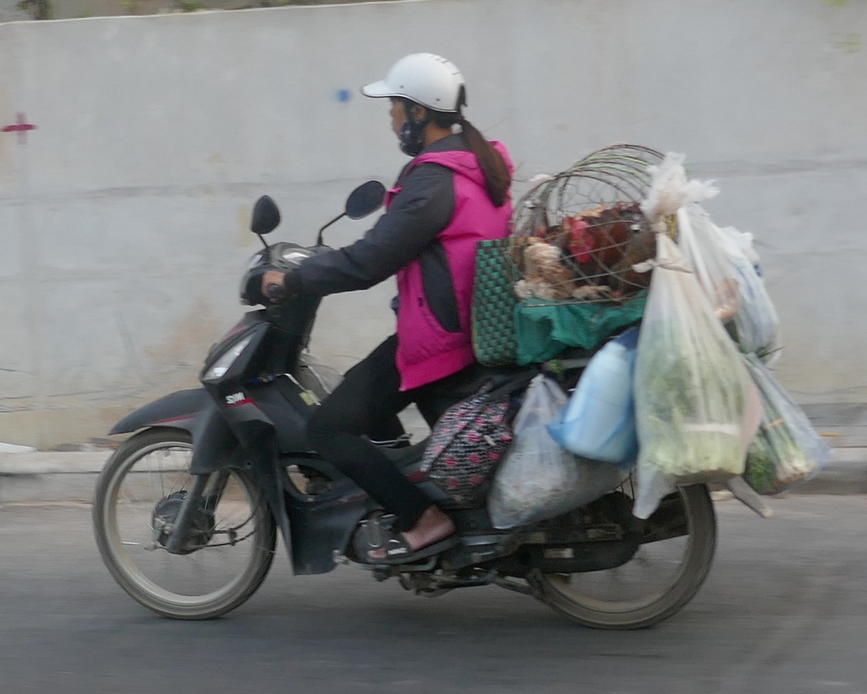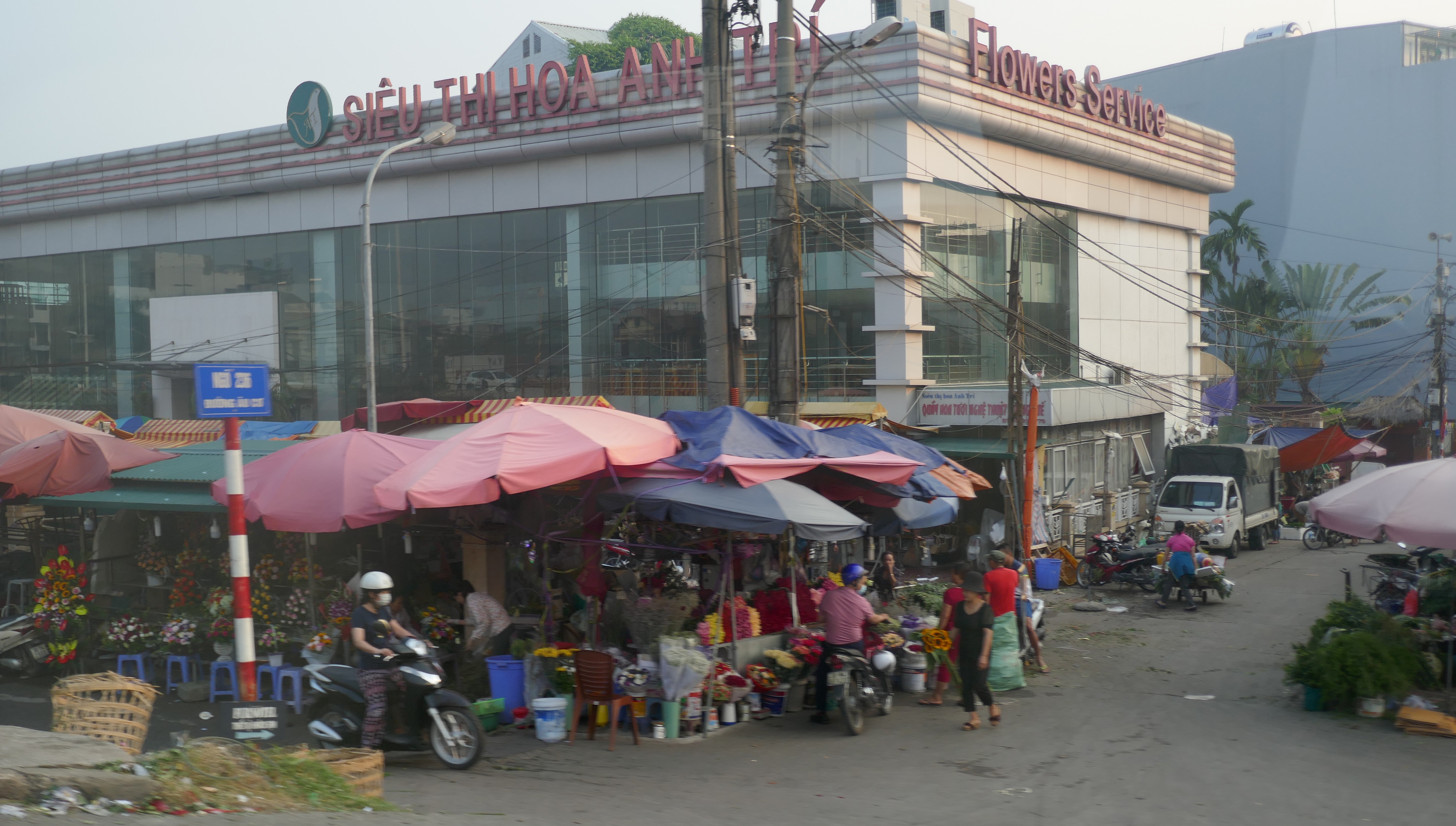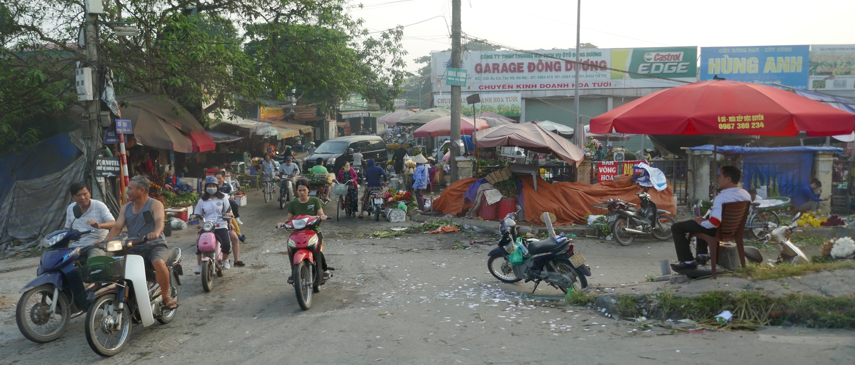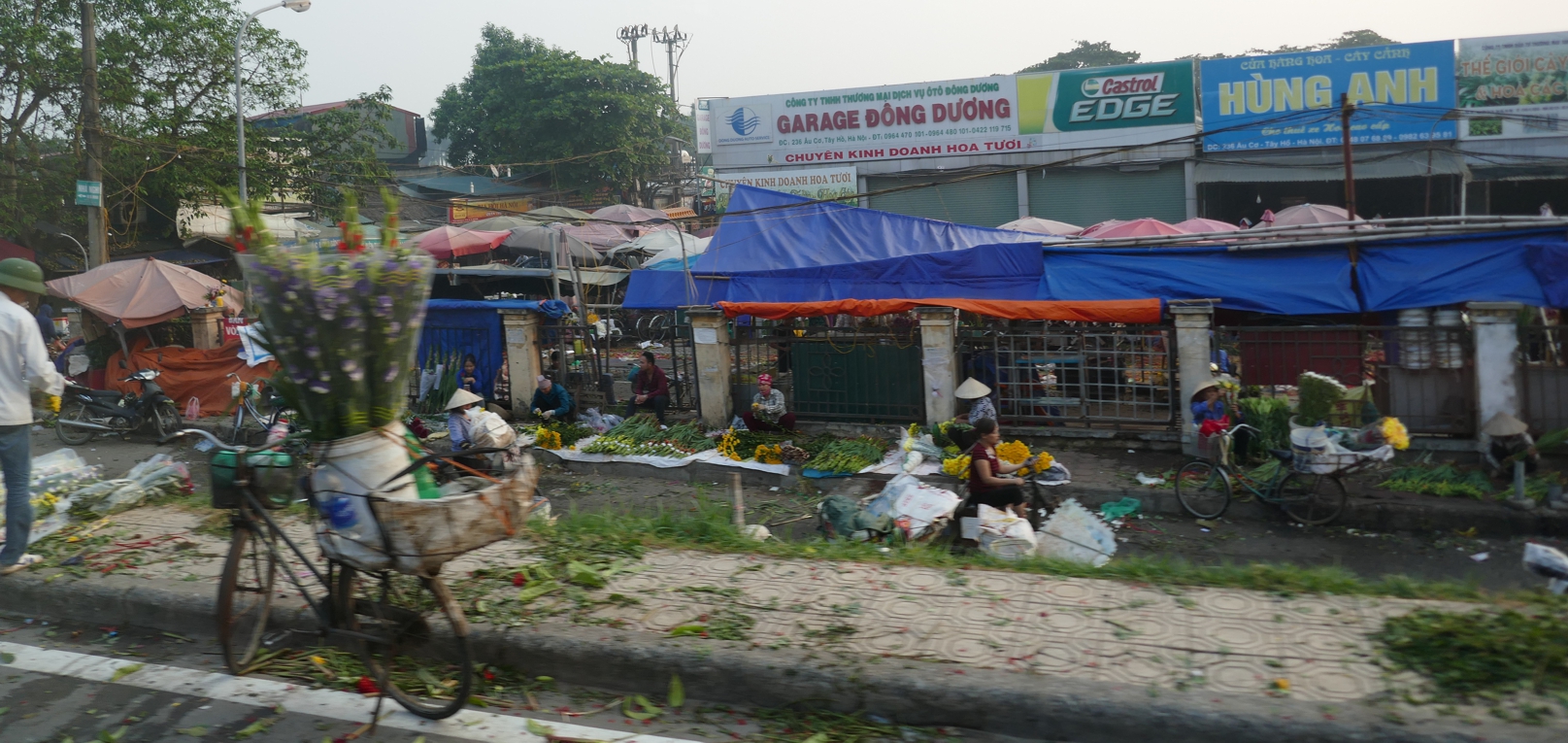 Mit den Mopeds, die unterwegs sind, geht es sicherlich zur Arbeit, für die einen ins Büro, die anderen zum Markt, immer mal wieder erkennbar auf der Zuladung auf den Gefährten. Nach kurzer Strecke kommen wir am Blumenmarkt vorbei, auf dem schon Hochbetrieb ist.