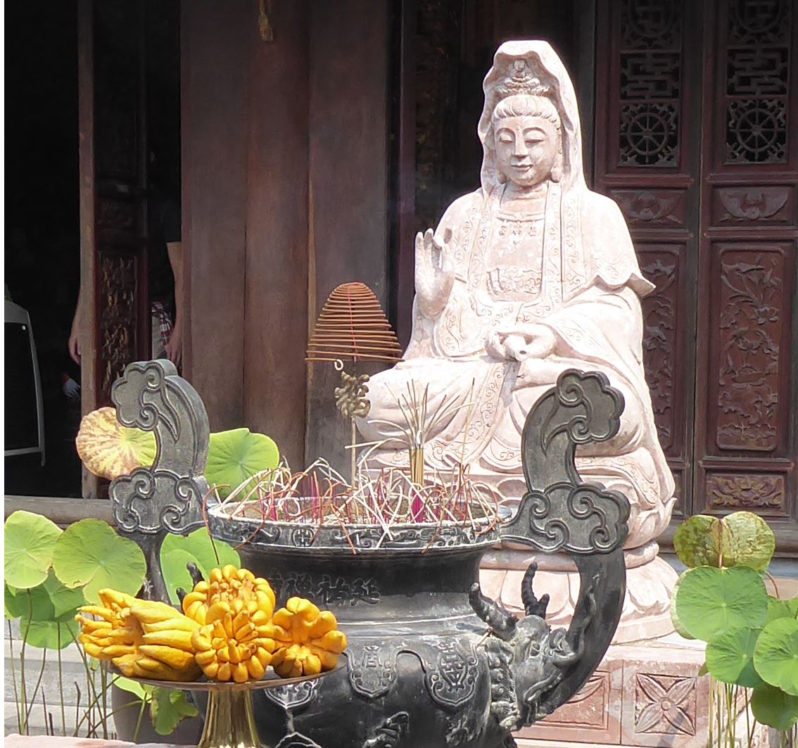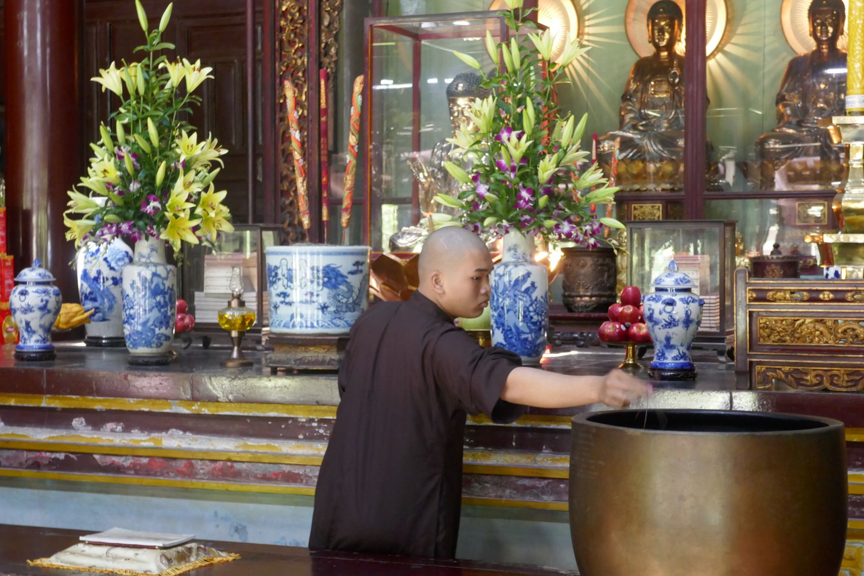 In Tempeln und Pagoden würden Opfergaben dargebracht. Ladengeschäfte ebenso wie Privathäuser hätten Hausaltäre. Bei Tempeln und Pagoden gebe es Vorgaben, wie viele Stufen an welcher Stelle angebracht werden dürfen und in welcher Körperhaltung diese überschritten werden dürfen. Frühmorgens und am Abend würden Räucherstäbchen zum glimmen gebracht, angezündet an Papier, das mit Wünschen beschriftet wurde, auch für die Ahnen. An kleinen Altären im Haus gelte das für die Familie, auf der Straße allgemein allen, die die Wünsche benötigen, in einigen Orten vor allem für diejenigen, die in der Straße während des Vietnamkrieges gestorben sind. Hilfe, Abwehr, Wünsche, Glück, alles gut und bunt gemischt, für alle Lebenslagen etwas.