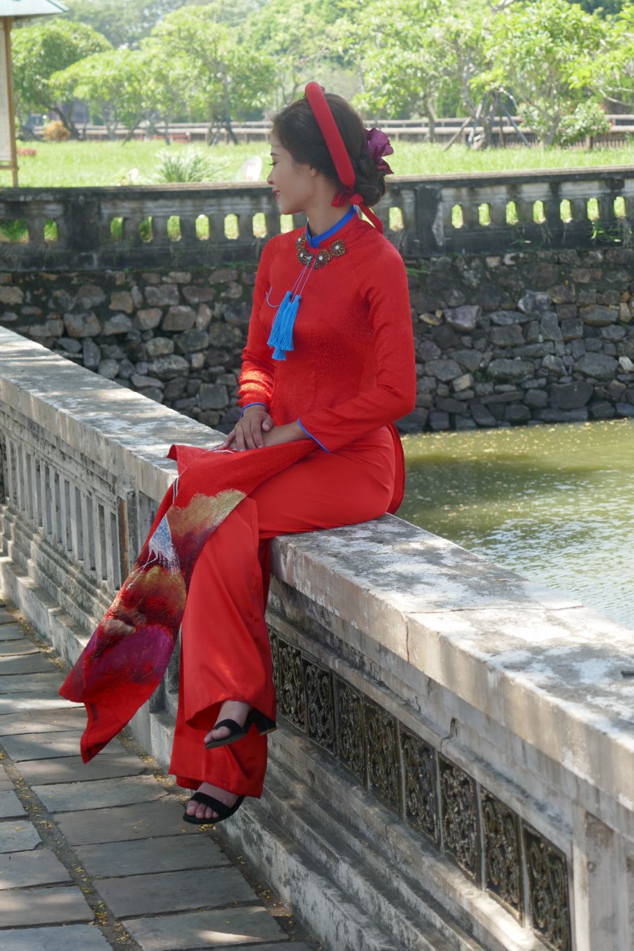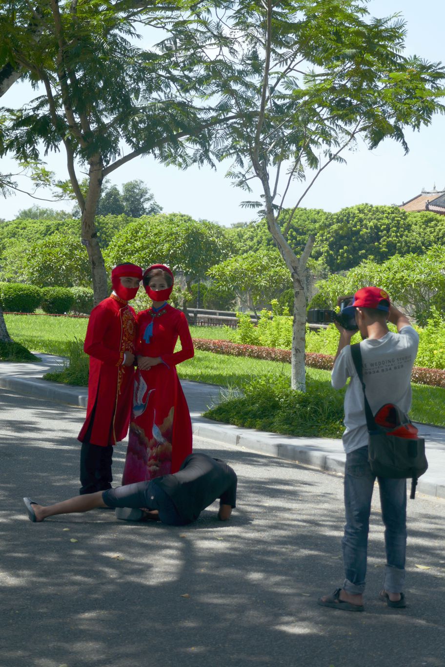 Die Hauptstraße in Hué führt entlang der Mauern der riesigen mächtigen Zitadellenanlage, die mit breitem Wassergraben umrandet ist und nur über wenige Eingangstore verfügt. Wir fahren zum wichtigsten Eingangstor, ein unübersehbar massives Bauwerk, auf dem die vietnamesische rote Fahne weht. Dieses Tor führt direkt zum historisch wichtigsten Bereich der Anlage, in den Kaiserpalast und innerhalb dessen in die ehemals verbotene Stadt. Vor dem Tor bestaunen wir noch ein Hochzeitspaar, das in festlicher roter Kleidung fotografiert wird.
