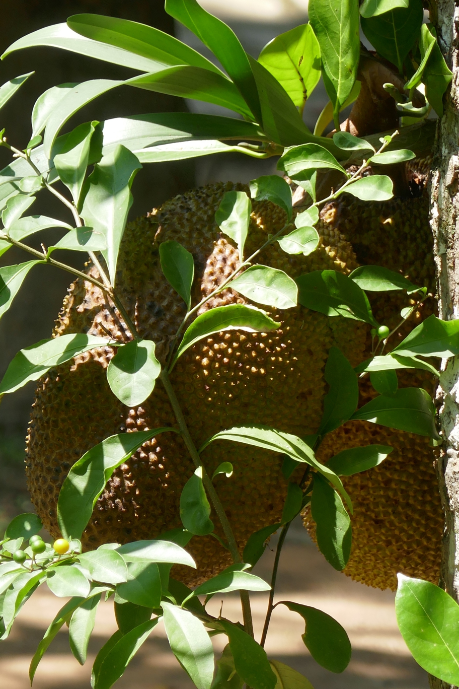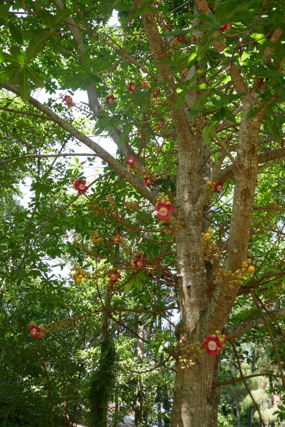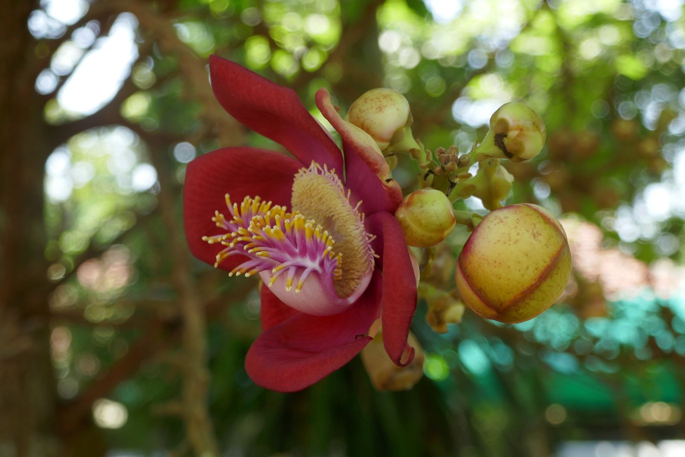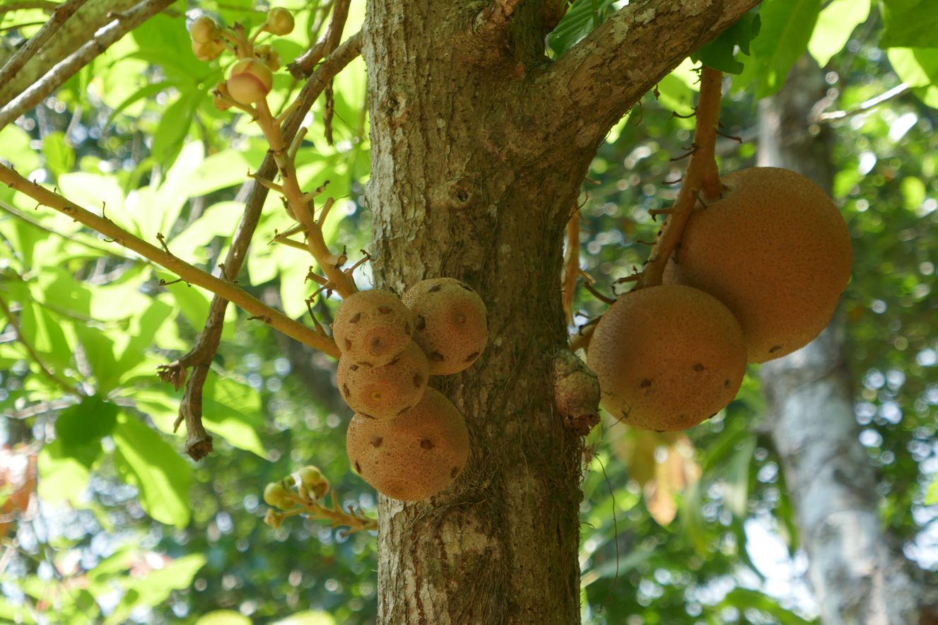 Irgendwie merkwürdig anmutend ist es, dass in der Parkanlage rund um das Kloster viele sogenannte Kanonenkugelbäume stehen, die prächtig blühen und zugleich auch Früchte tragen, die so aussehen, wie die Bäume heißen. Noch mehr fallen die enorm großen Früchte an den Jackfruit-Bäumen auf, die bis zu einem Meter lang und 50 Kilo schwer werden können – diejenigen, die wir sehen, sind noch nicht reif, aber doch schon groß wie reife Wassermelonen.