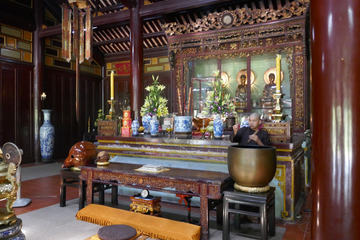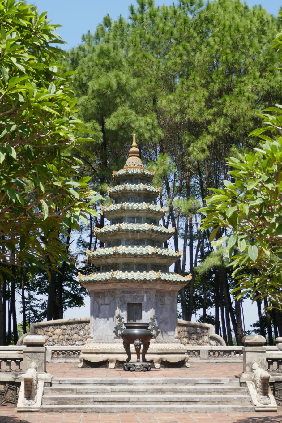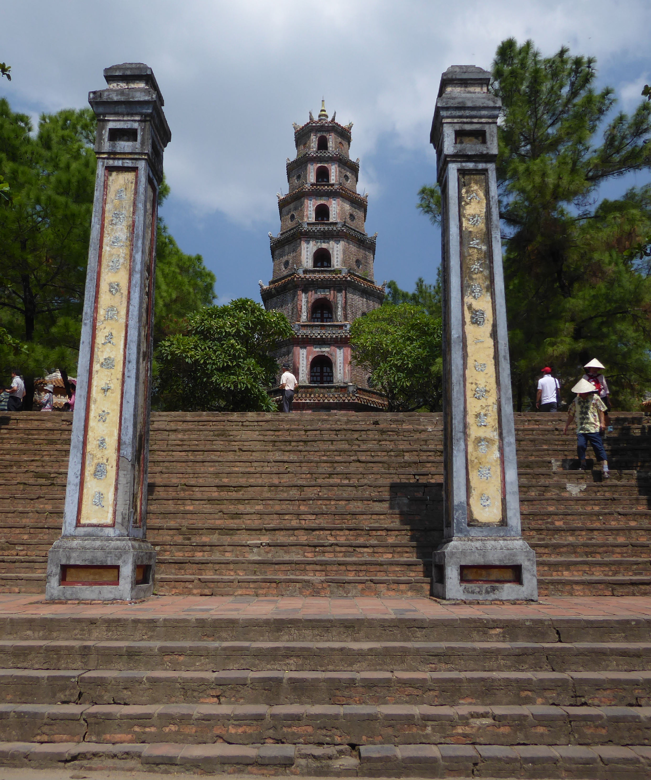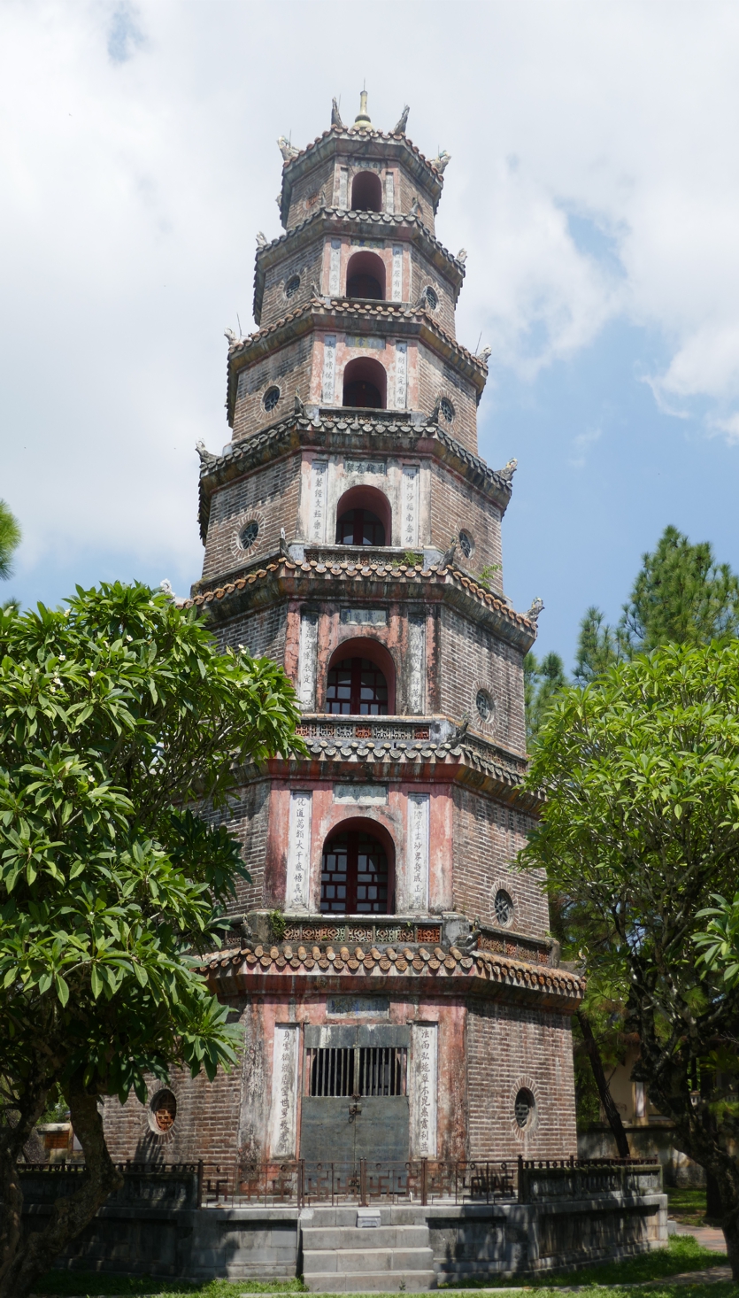 Die Thien Mu Pagode, die oft auch als Säulenpagode bezeichnet wird, ist die die höchste Pagode Vietnams – ihren Namen trägt sie wegen des Eingangsturms, der 27 Meter in den Himmel ragt, ein Oktagaon, sieben Etagen hoch – die sieben Stufen der Reinkarnation Buddhas.