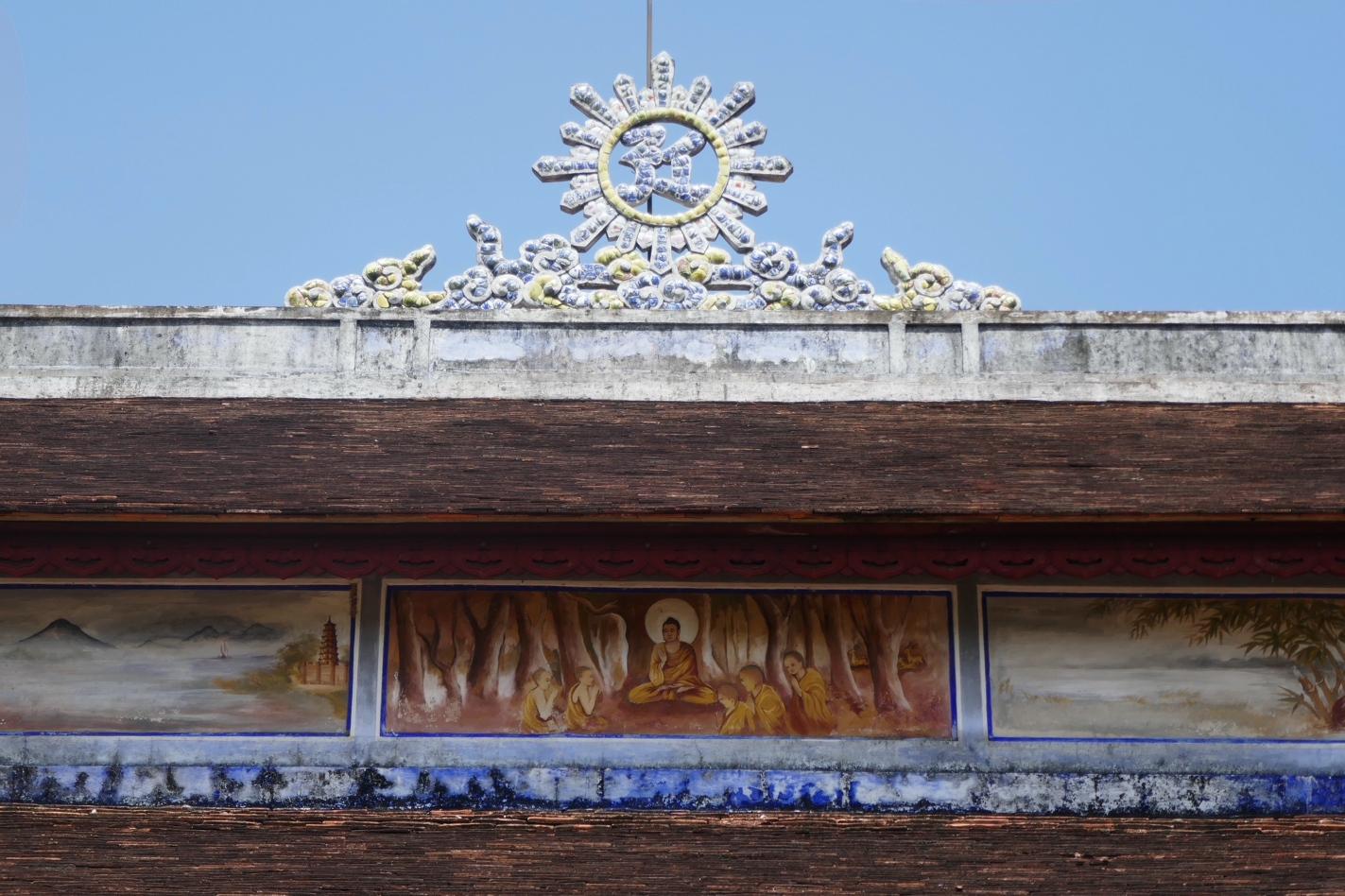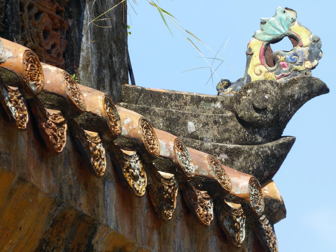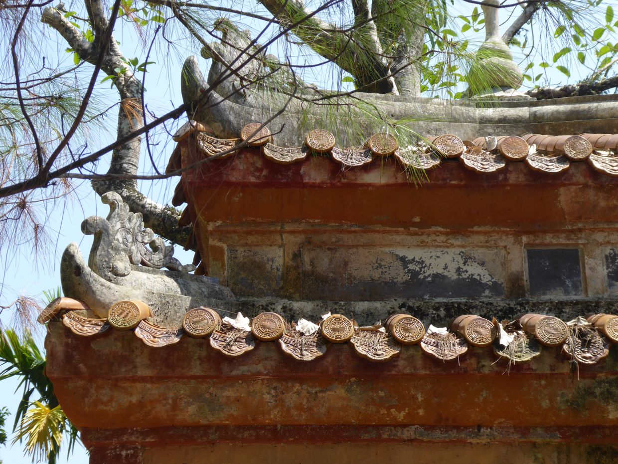 Es geht weiter, Richtung Huè. Unterwegs erfahren wir von unserem neuen vietnamesischen Begleiter einiges über die Stadt, aber vor allem das aus seiner Sicht Wichtigste, das uns über die nächsten Tage begleiten wird: In Vietnam gibt es alle erdenklichen Glaubensrichtungen, davon viele ziemlich variantenreich bunt untereinander gemischt, die Glaubensangehörigen auch nicht stoisch einer Religion verbunden; sie hätten keine Probleme, zum Beispiel katholisch zu sein und zugleich irgendwelchen anderen Gottheiten zu huldigen. Aber viel wichtiger sei, dass so ziemlich jeder an irgendwelche Geister glauben würde, die überall „lauern“. Daher gäbe es viele Schutzsymbole, zum Beispiel an Haustüren.