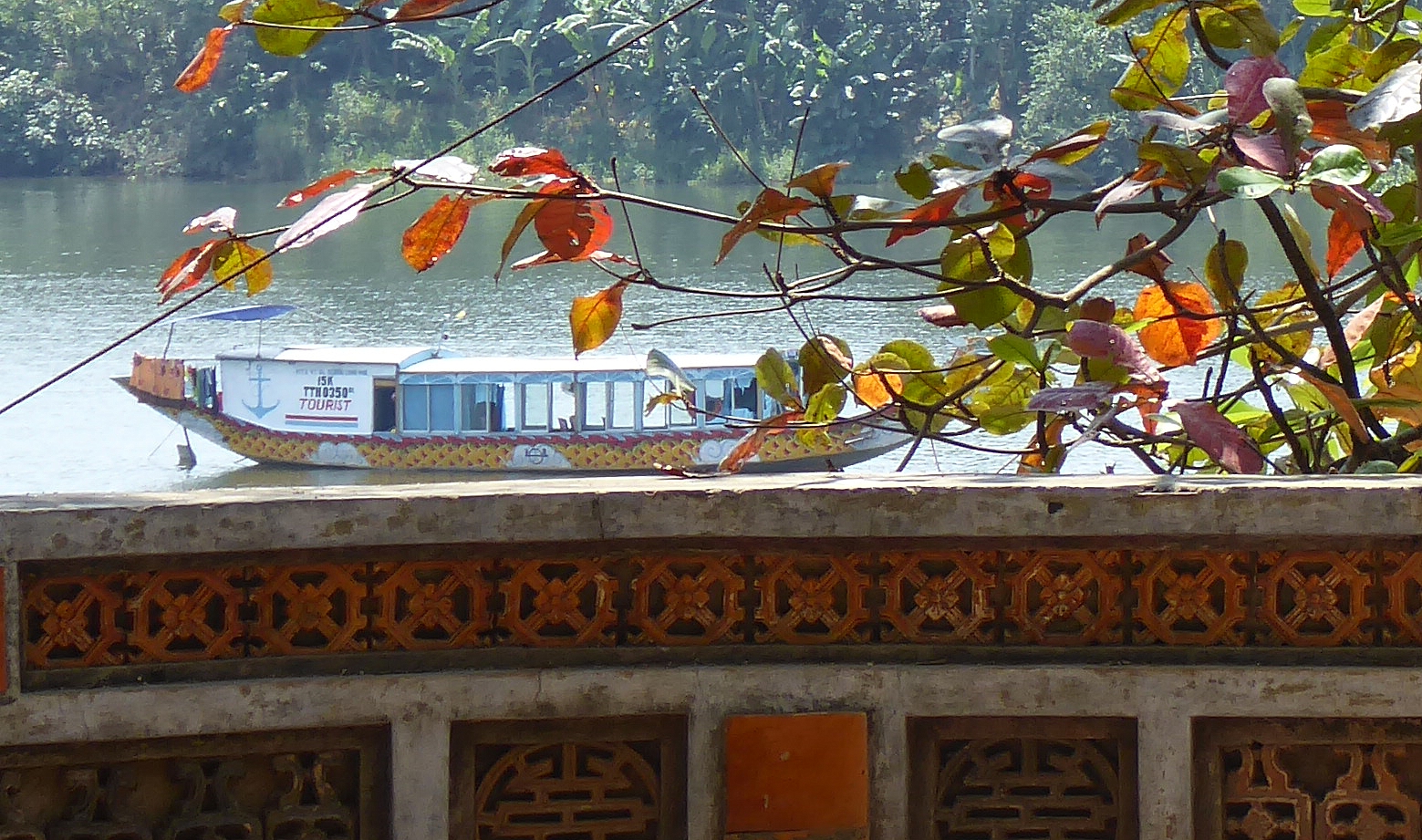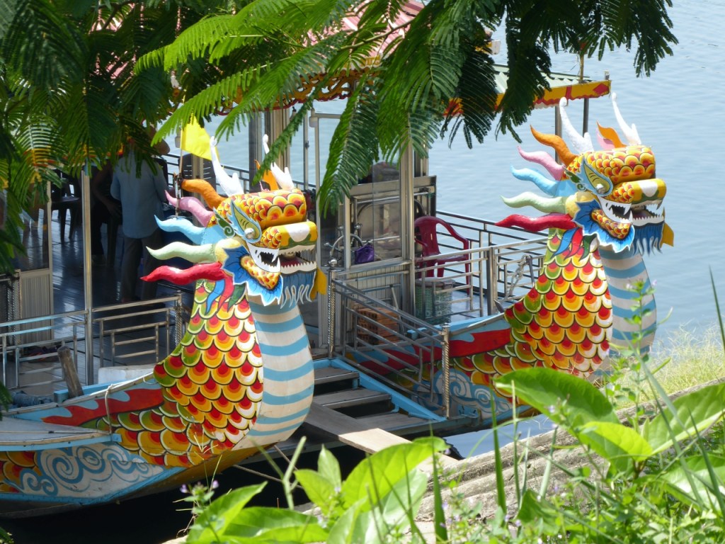 Bevor wir die Innenstadt von Hué ansteuern, geht es etwas entlang dem Sông Hương, dem Parfum-Fluss. Wir fahren noch zur Thien Mu Pagode, die direkt am Fluss liegt, und die mit einer besonderen Geschichte verbunden ist, die ihr zusätzliche besondere Bedeutung gibt – nicht nur für die Region, sondern für ganz Vietnam. Auf dem Fluss sehen wir schon einige Drachenboote. Unser Bus parkt direkt am Ufer bei der Pagode, und wir haben noch einen Blick auf die bunten Drachenboote, die hier angelegt haben.