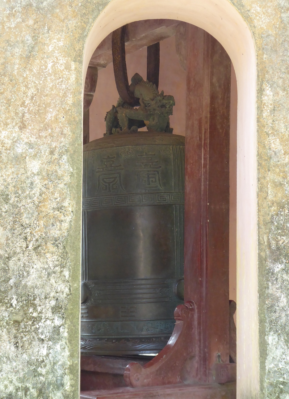 Viele Stufen steigen wir zur Pagode hinauf auf den Hügel. Am Turm geht es hinein in die recht große Tempelanlage. Neben dem Turm hängt in einem der Bauwerke eine riesige, reich verzierte Glocke, die 1710 für die Pagode angefertigt worden ist; sie ist etwa zweieinhalb Meter hoch, soll über zwei Tonnen wiegen, ihr Klang soll bis auf eine Entfernung von 10 Kilometern zu hören sein. Im Gebäude auf der Gegenseite befindet sich eine ebenso riesige bronzene Schildkröte, eines der heiligen Tiere, die sehr verehrt werden, wie der goldglänzende Kopf des Tieres zeigt, der im Unterschied zum sonstigen Tier, das Patina angesetzt hat, sicherlich häufig gestreichelt wird.