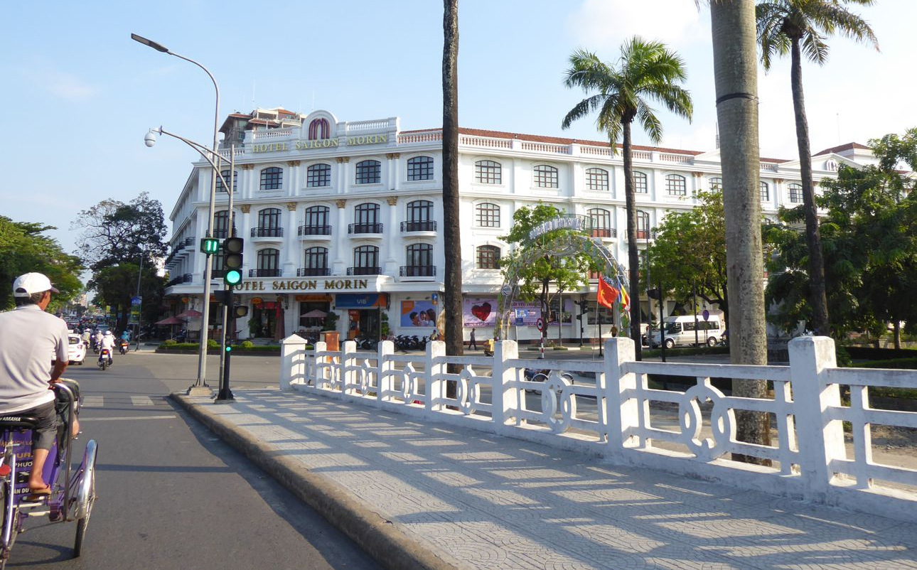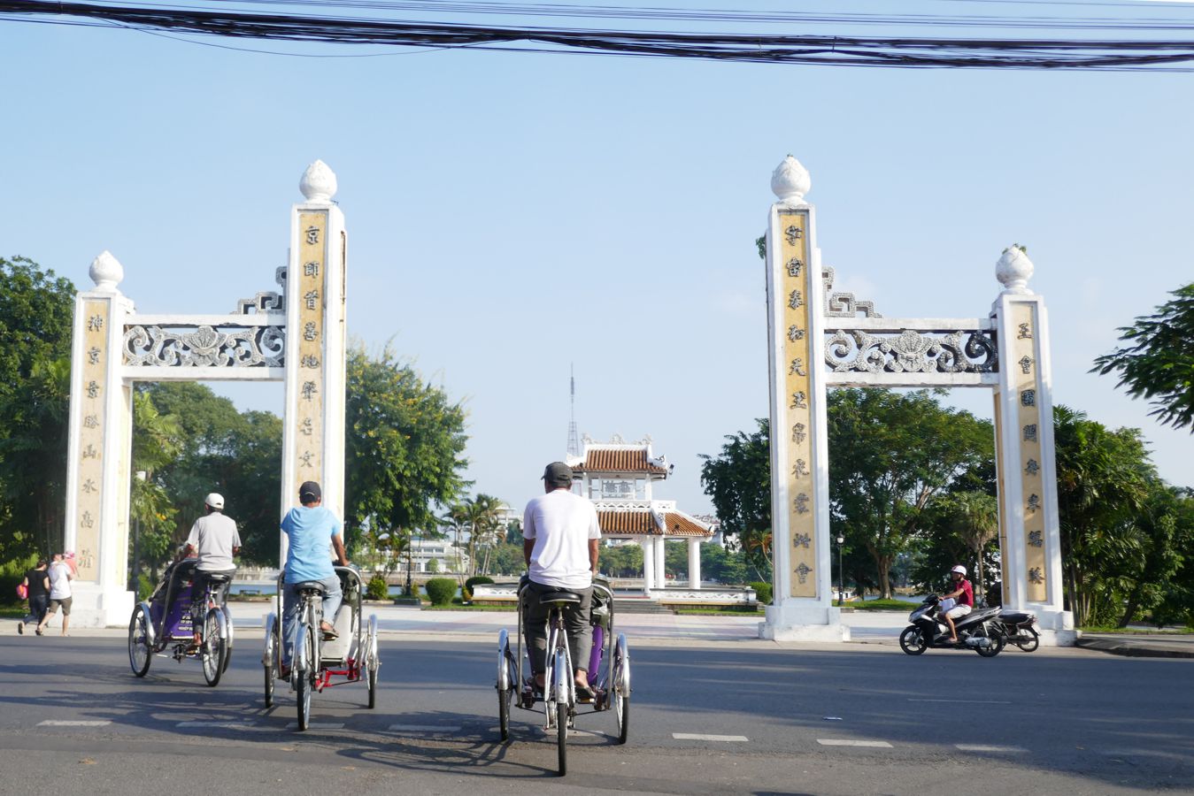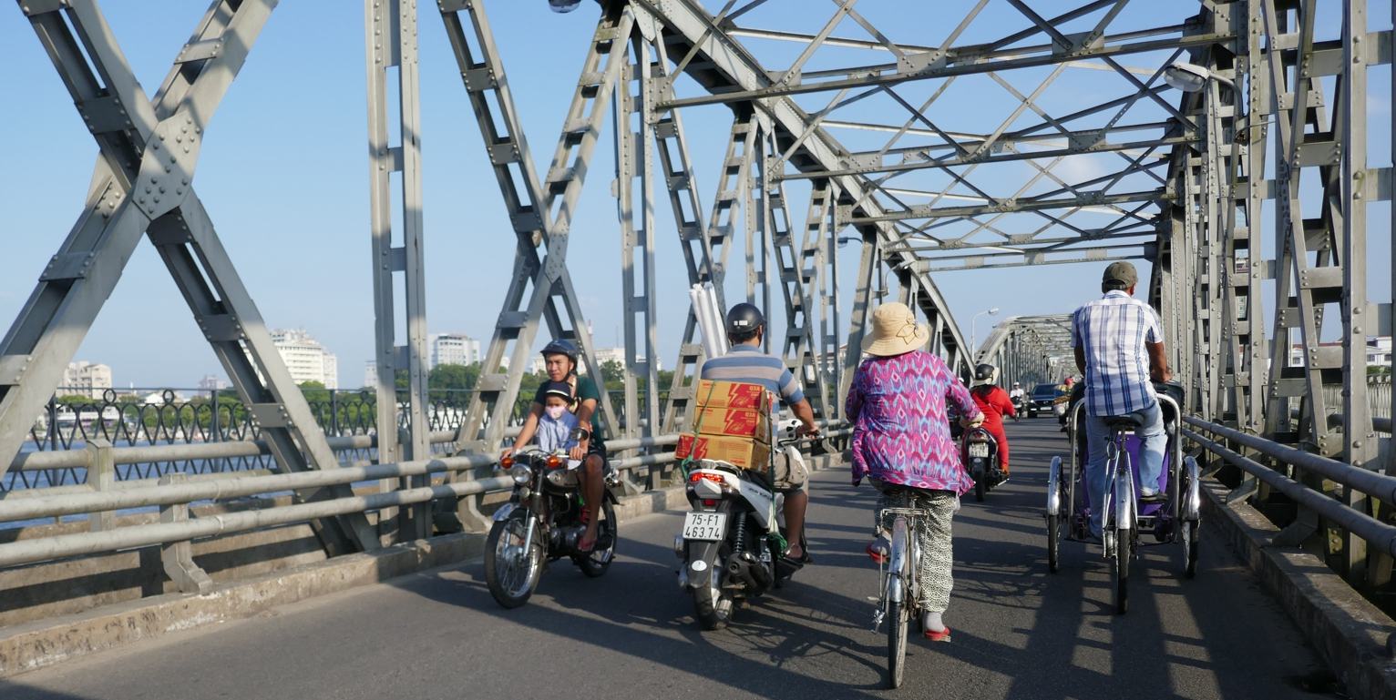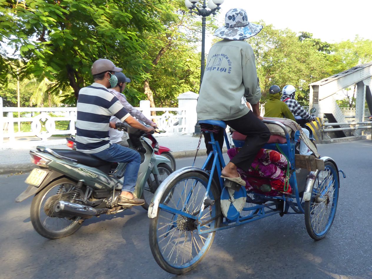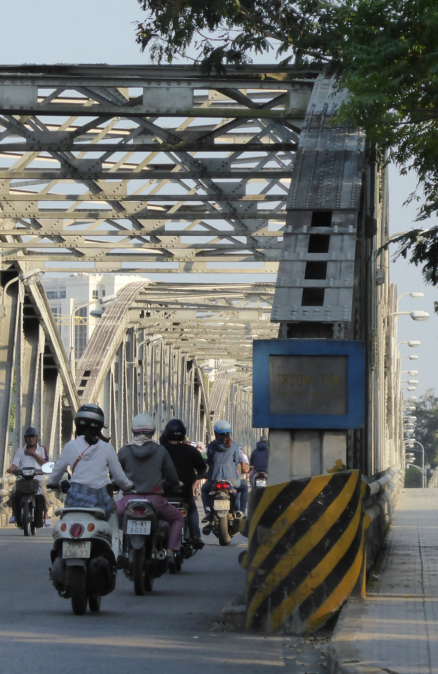 Mit der Fahrradrikscha geht es schließlich in Richtung Hotel, wieder ein Stück der Festungsmauer entlang, noch ein wenig durch die Stadt, dann auf einer alten Stahlbogenbrücke über den Parfumfluss hinüber zu unserem Hotel, das am Flussufer liegt.