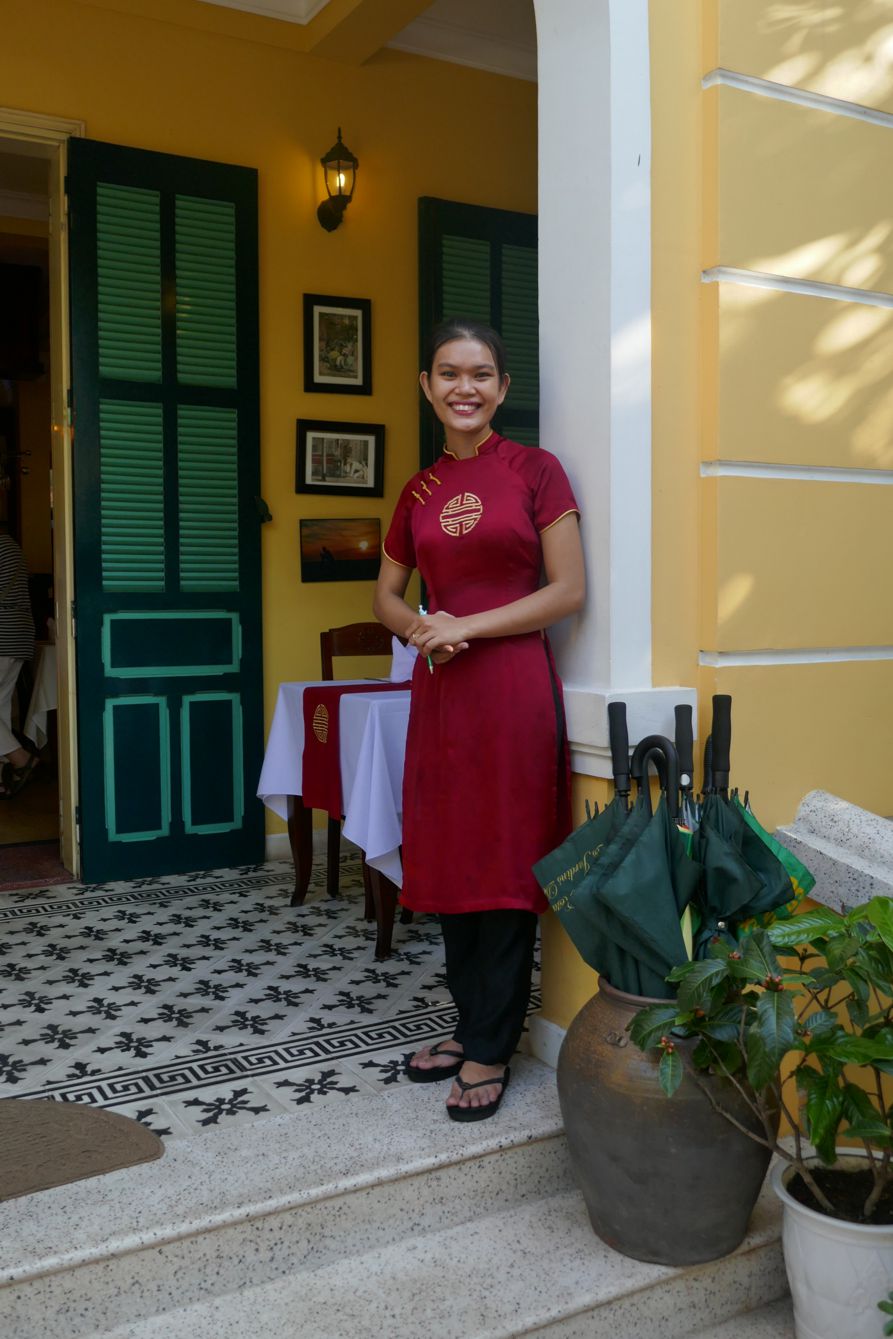 Vor einem sehr schönen Kolonialbau halten wir an – ein reizendes kleines Restaurant, das von einem Franzosen, der traditionell vietnamesisch kocht, geführt wird. Wie immer wird zuerst die Suppe serviert, dann werden die Platten und Töpfe für alle, die am Tisch sitzen, gebracht, und zwar auch alle Gänge zusammen. Wir sitzen im ersten Stock mit herrlichem Blick auf einen Carambole-Baum. Es ist kühl und schattig. Das Essen war ausgezeichnet, raffiniert zubereitet, stilvoll serviert und abwechslungsreich.