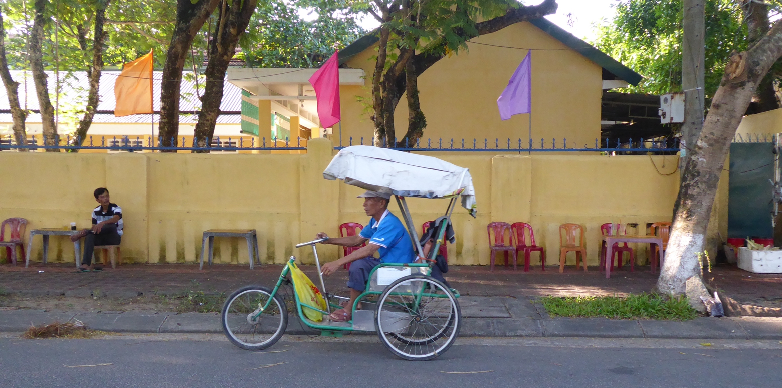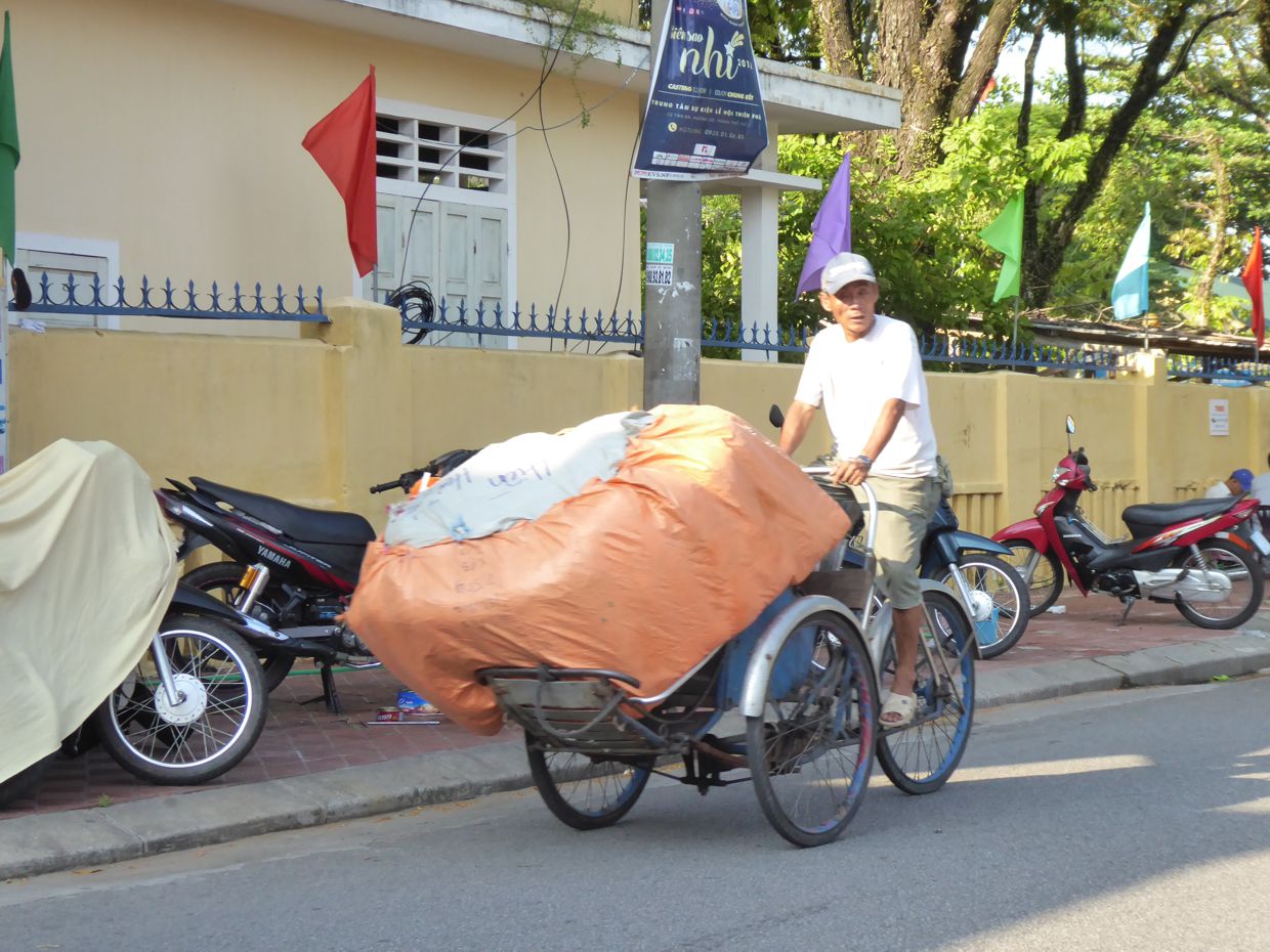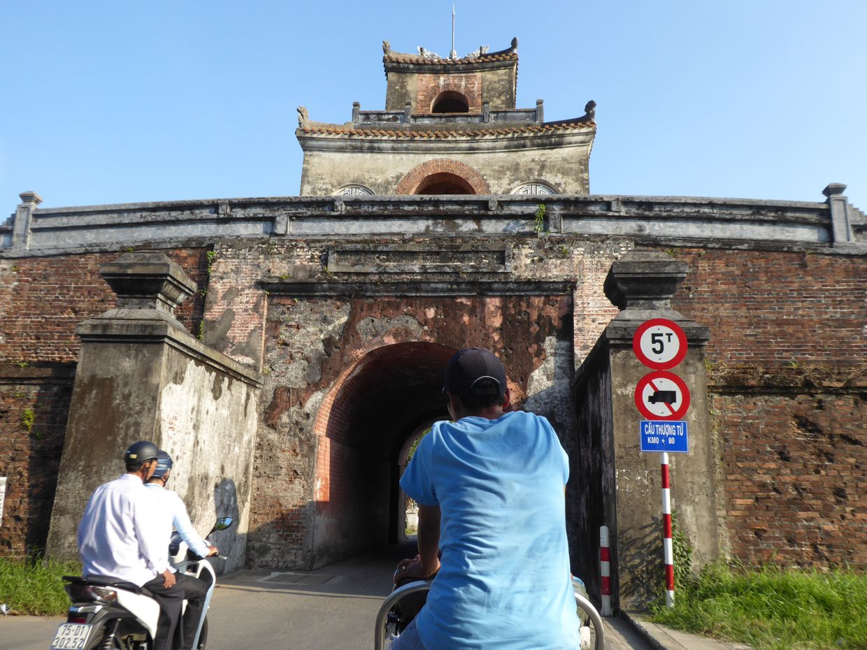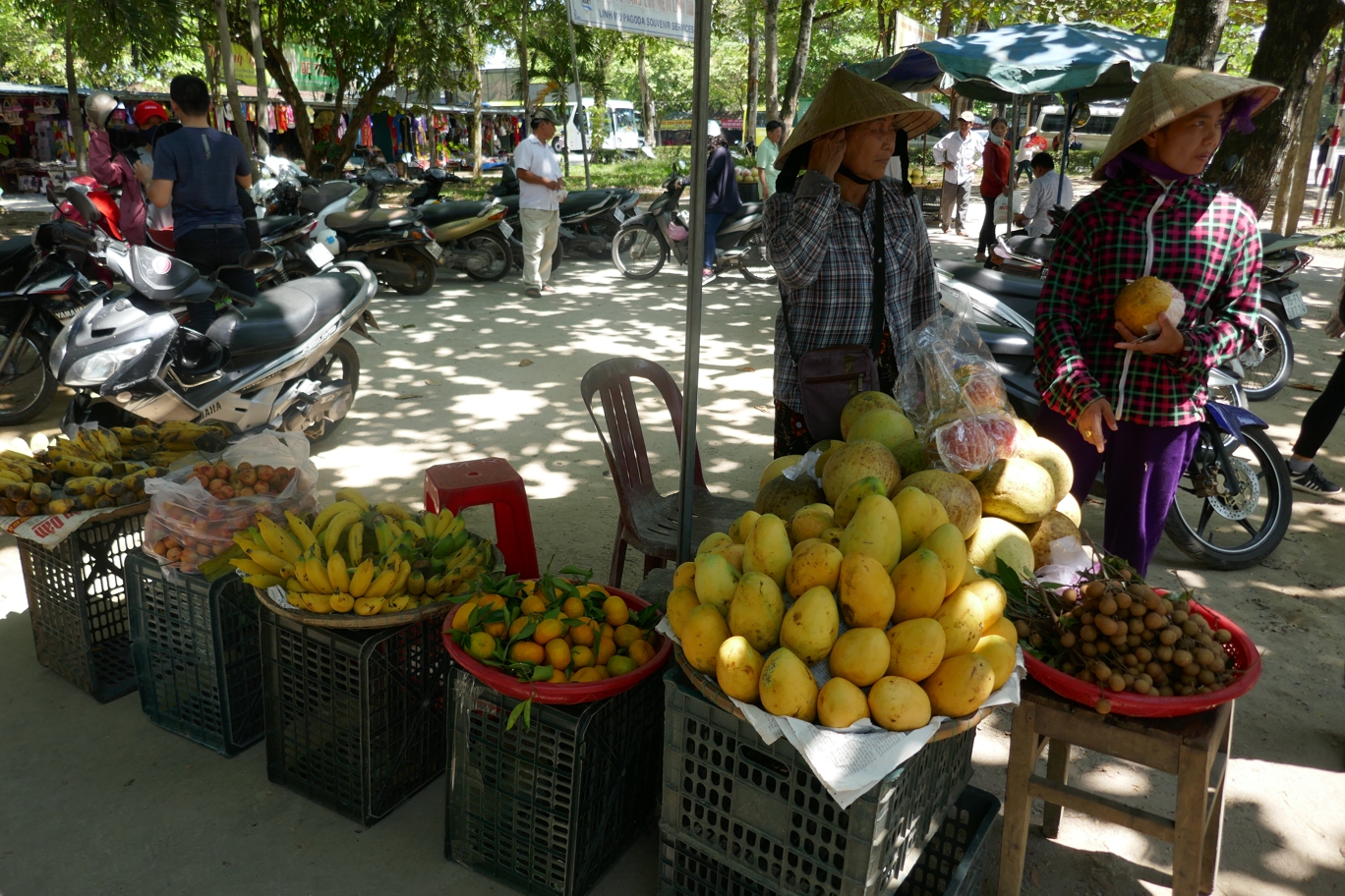 Nach dem Essen geht es mit der Rikscha durch die Stadt. Die Hauptstraße, auf der wir fahren, läuft rings um die Zitadelle, und entlang der Straße sind wie schon in Hanoi viele Verkaufsstände zu sehen. Auffallend ist, dass es eine weit größere Vielfalt an eher exotischen, südlichen Früchten zu sehen gibt als im Norden, ob verschiedene Bananen, unterschiedlichste Passionsfrüchte, Litschis und Rambutan, Mangos und Papayas, oder auch die „Stinkefrucht“ Durian.