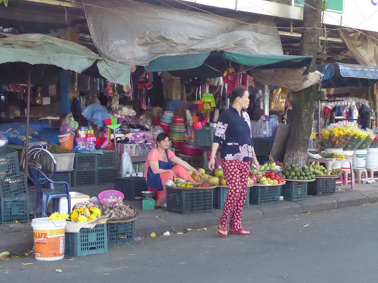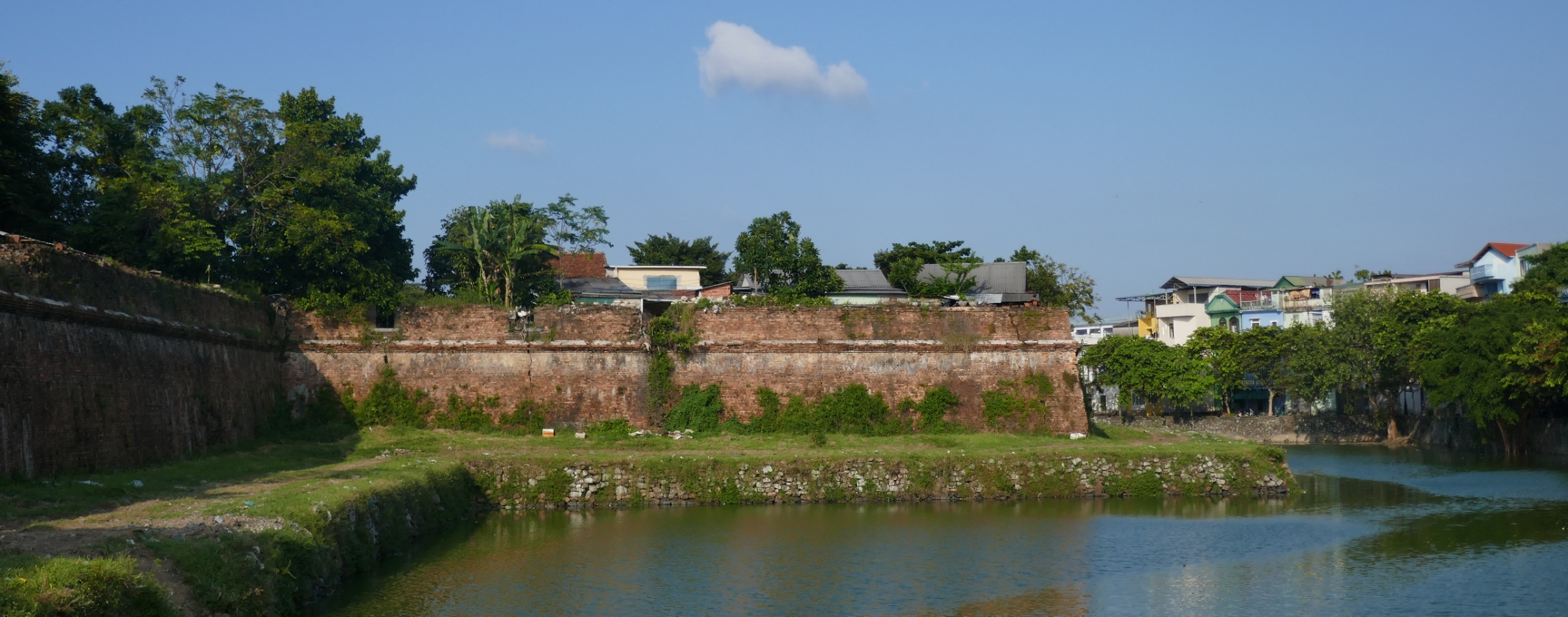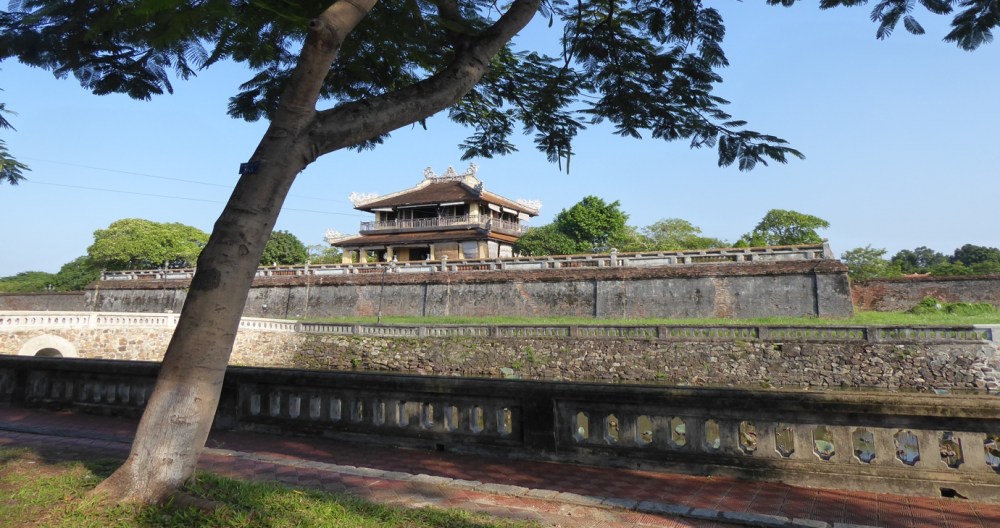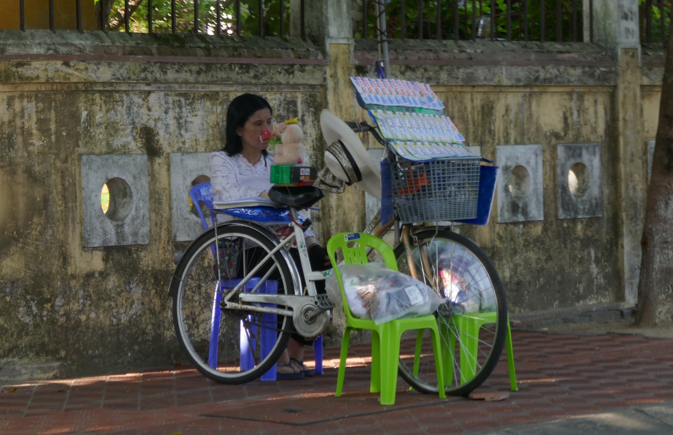 Nach dem Essen geht es mit der Rikscha durch die Stadt. Die Hauptstraße, auf der wir fahren, läuft rings um die Zitadelle, und entlang der Straße sind wie schon in Hanoi viele Verkaufsstände zu sehen. Auffallend ist, dass es eine weit größere Vielfalt an eher exotischen, südlichen Früchten zu sehen gibt als im Norden, ob verschiedene Bananen, unterschiedlichste Passionsfrüchte, Litschis und Rambutan, Mangos und Papayas, oder auch die „Stinkefrucht“ Durian.