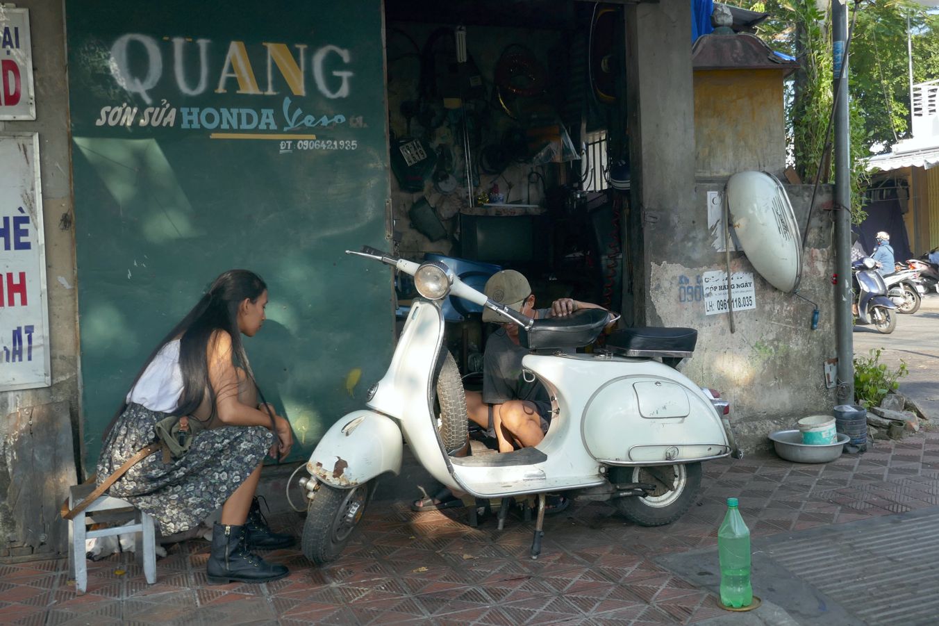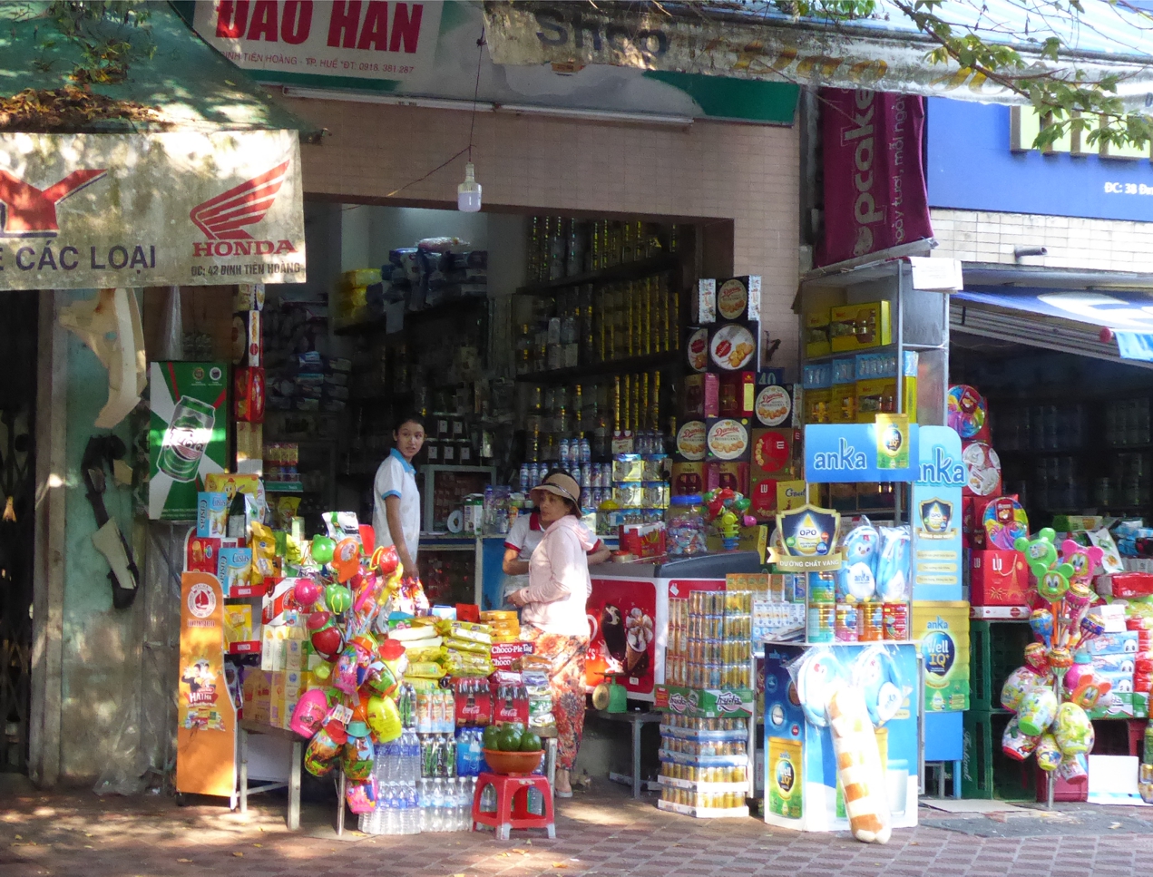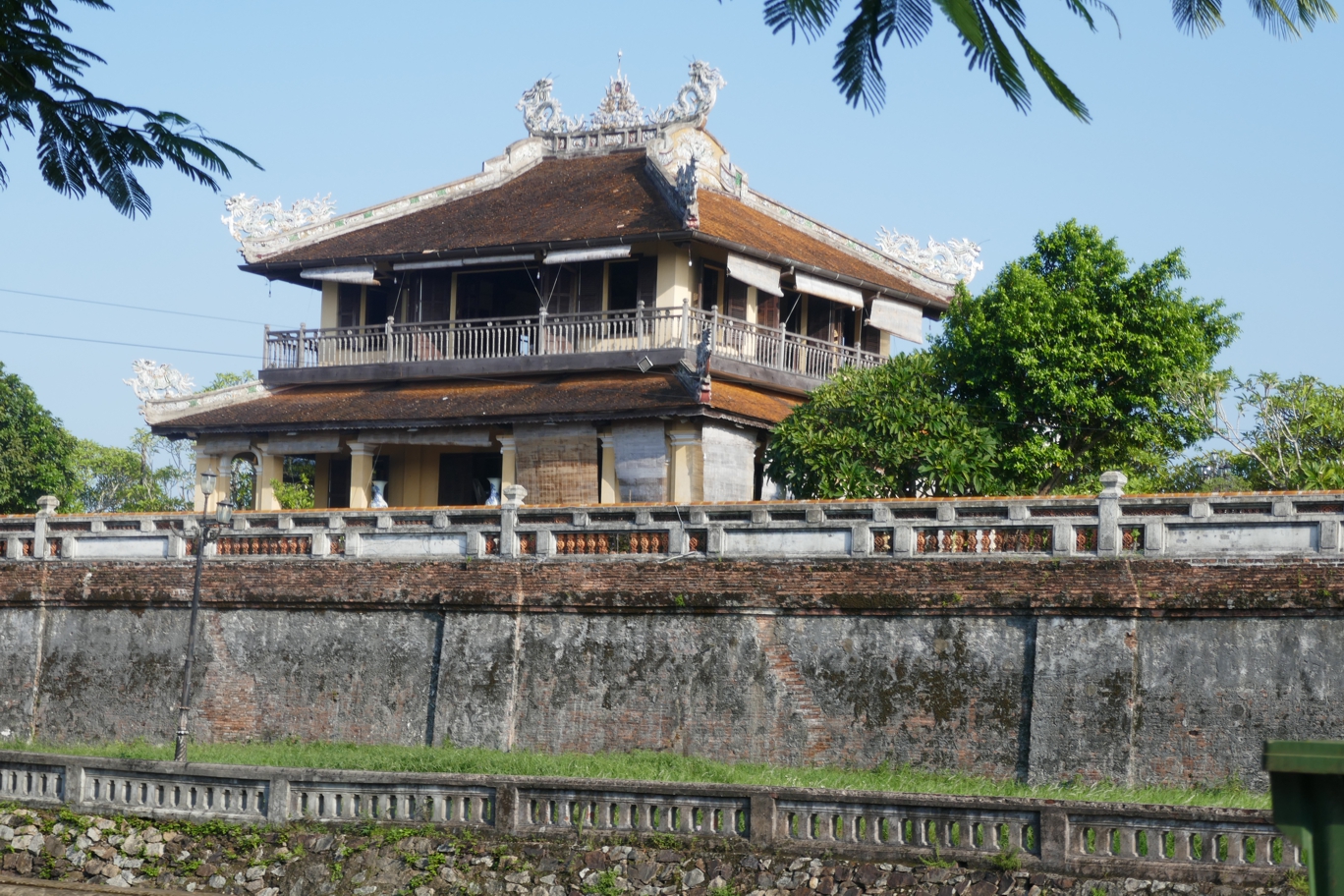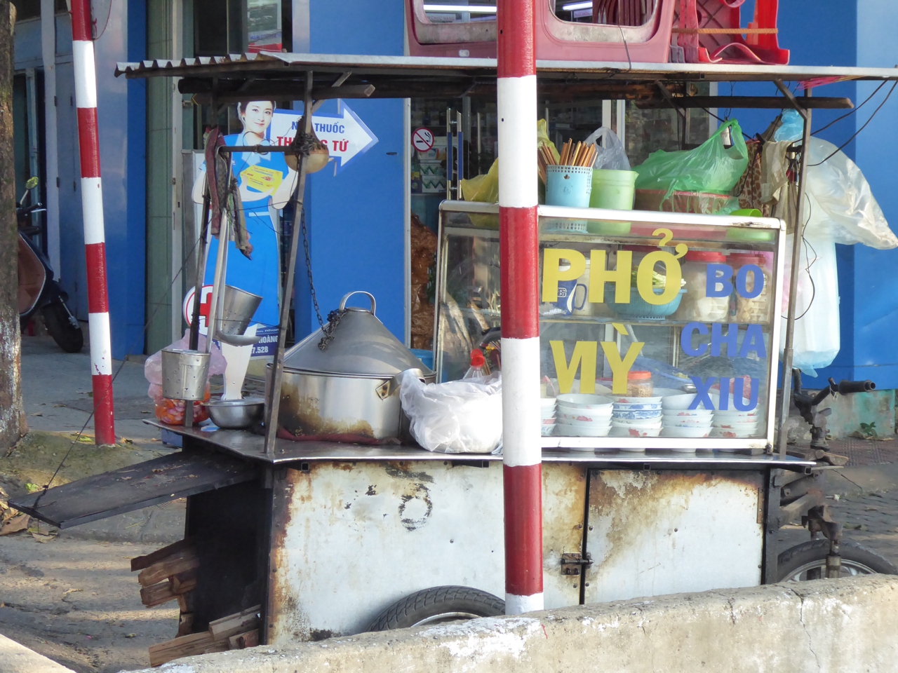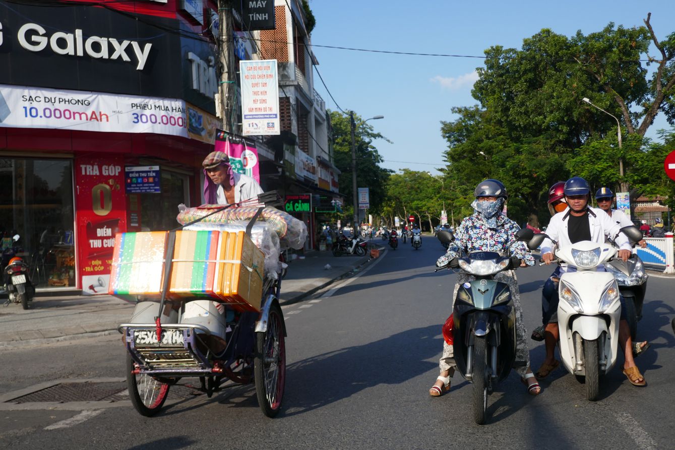 Entlang der Straßen zeigt sich eine bunte Mischung an Häusern mit Reparaturwerkstätten, Mopedläden, kleinen Restaurants, Bekleidungsläden und mehr, zwischendrin auch Wohngebäude, ein Kindergarten oder eine Schule, bunt bemalt. Immer wieder sieht man eine der mobilen Garküchen, die Suppe anbieten. Ist es mal möglich, in einen Topf zu blicken, ist das meist eine klare Brühe, vielleicht auch mal eine Ente; die Nudeln, verschiedene Knödel und auch verschiedene Kräuter gibt es rundherum zur Auswahl. Auf den Balkonen der Häuser sieht man, dass sie Lebensraum sind – am Mobiliar, an der Dekoration, an Pflanzen, oft so viele dass es fast ausschaut wie ein Kleingarten. Aber das Alltagsleben läuft auch in Hue vor allem entlang der Straßen ab.