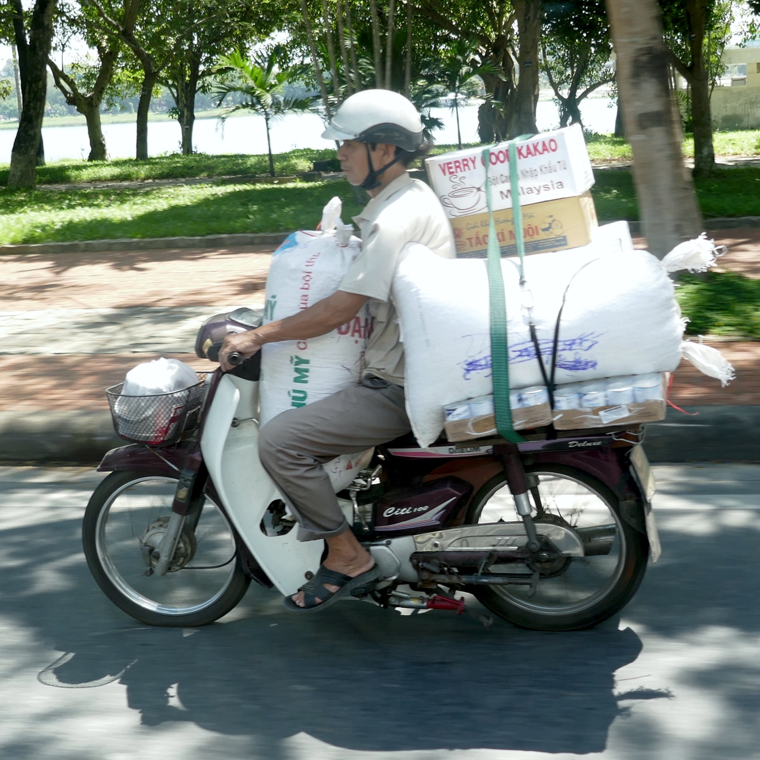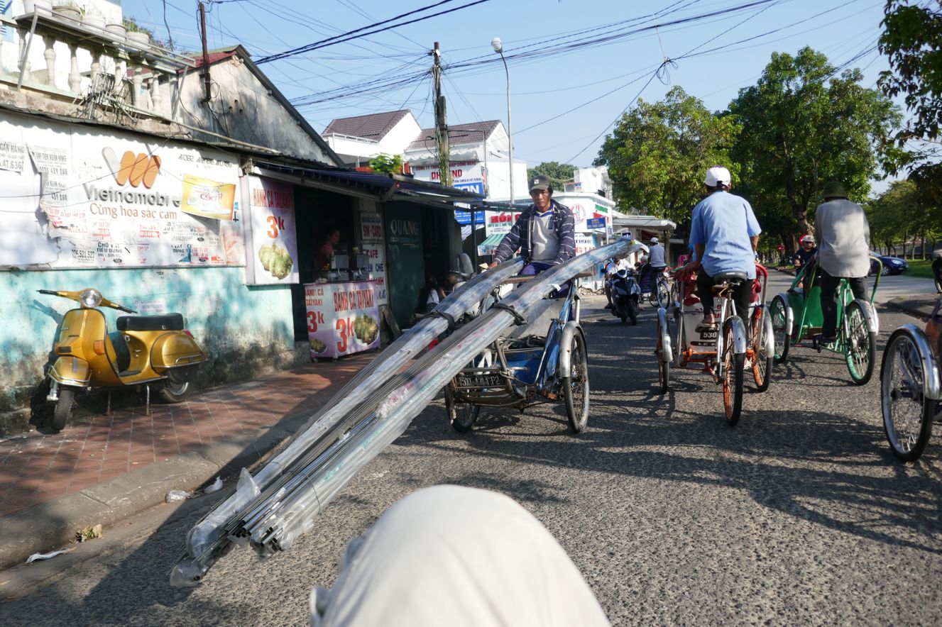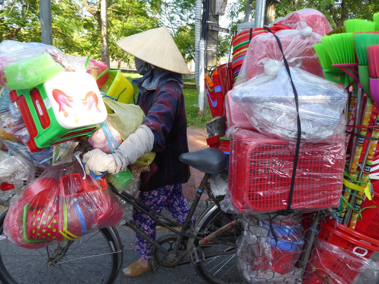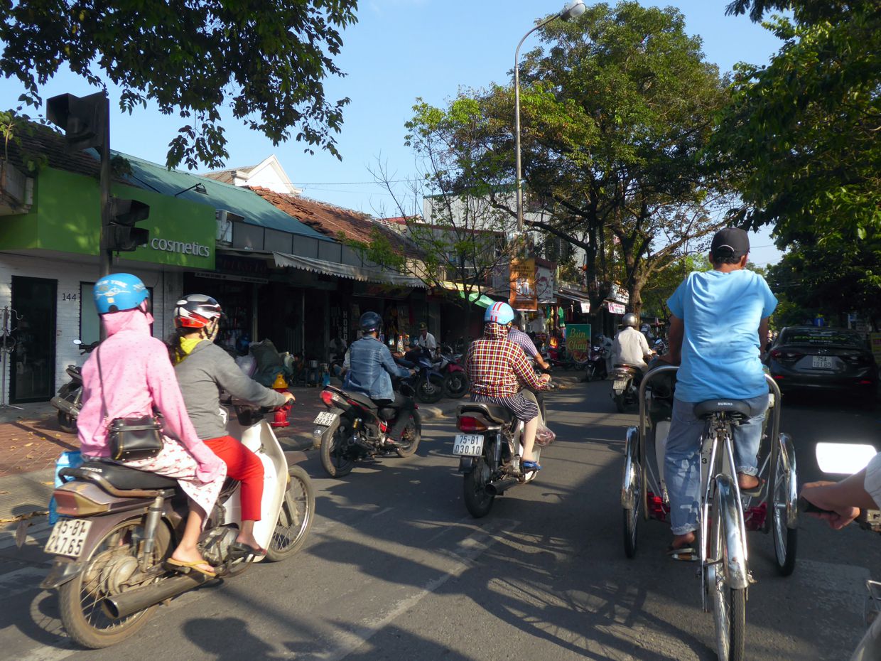 Unzählige Fahrrad-Rikschas bestimmen den Straßenverkehr, natürlich auch Mopeds. Immer wieder sind Fahrzeuge zu sehen, die abenteuerlich mit allem beladen sind, was irgendwie möglich – seien es Unmengen an Plastikwaren oder überlange Eisenstangen.