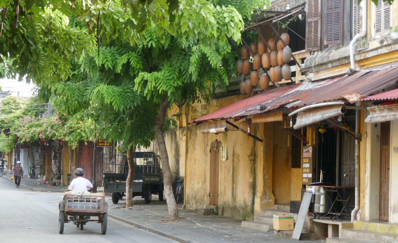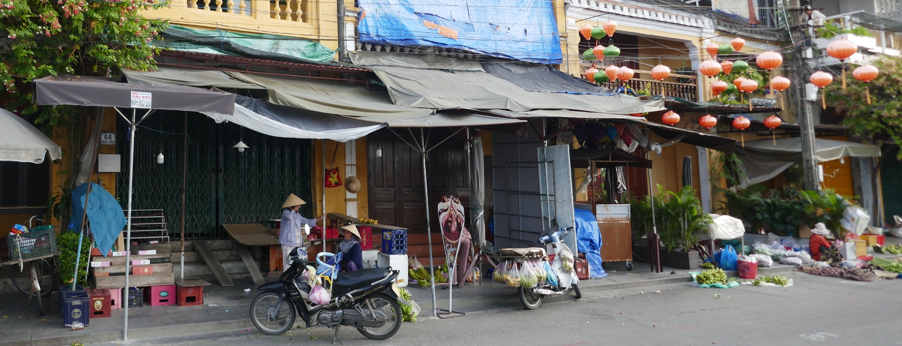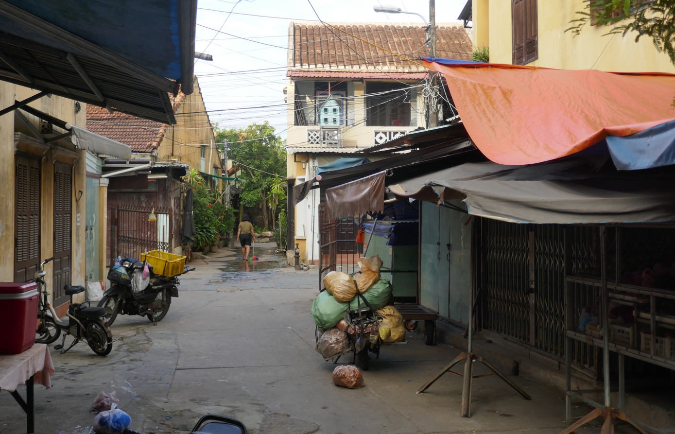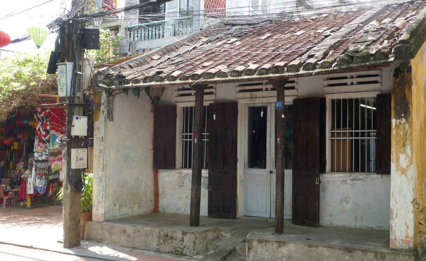 Frühmorgens aufstehen haben wir uns vorgenommen, wir wollen das so – wenigstens ein mal die Stadt erleben, wenn sie nicht die Atmosphäre eines großen Touristenshops in alten Gemäuern ausstrahlt. Am Abend war ja von einer der schönsten ältesten Städte Vietnams kaum etwas zu sehen außer einem Ladengeschäft an das andere gereiht, die Straßen vor allem mit Lampions hell und bunt beleuchtet, am Fluss der große Nachtmarkt, eine wilde Mischung aus Verkaufsständen mit allem erdenklichen Kram und Streetfood.