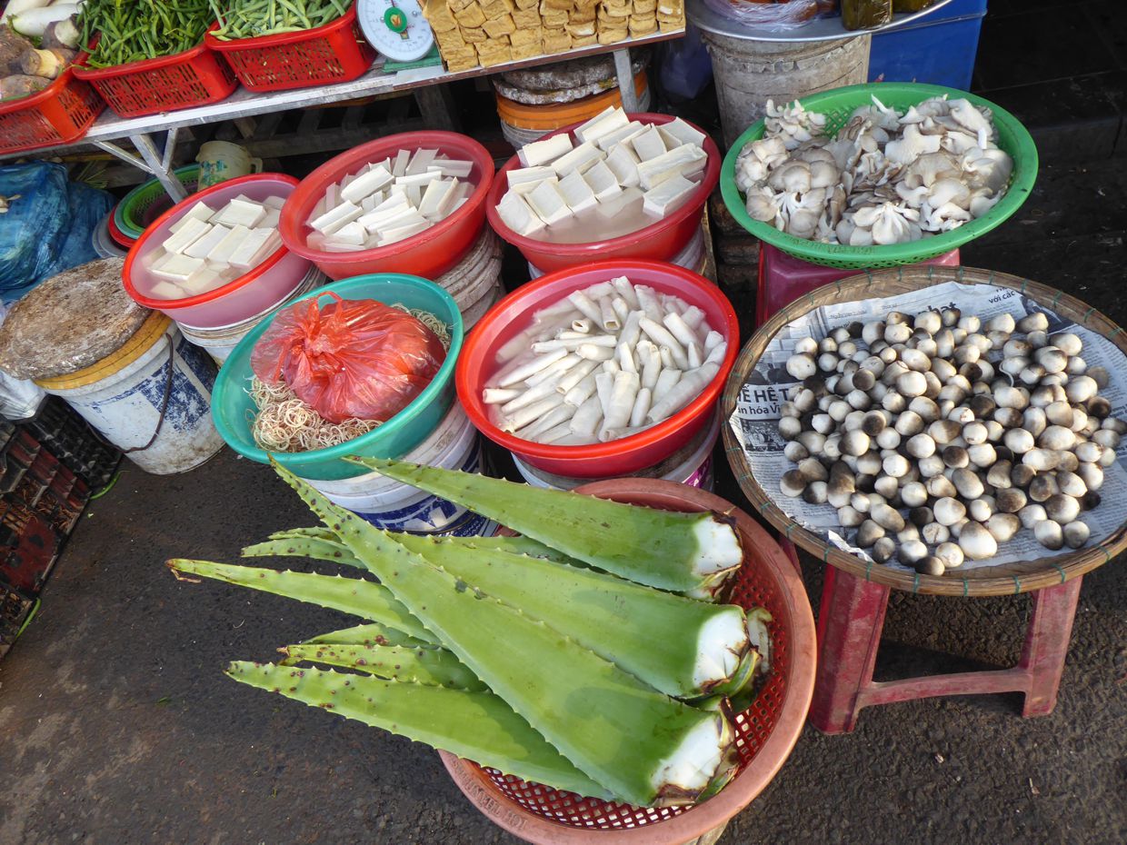 Vorbei geht es dann an Obst und Gemüse, und noch an ein paar Ständen, die Tofu in allen erdenklichen Varianten anbieten, ob den mehr geleeartigen Seidentofu oder die etwas grobere Version, der Farbe nach in unterschiedlichen Reifegraden oder auch geräuchert. Verschiedene Pilze liegen in Körben oder in einer Lake.