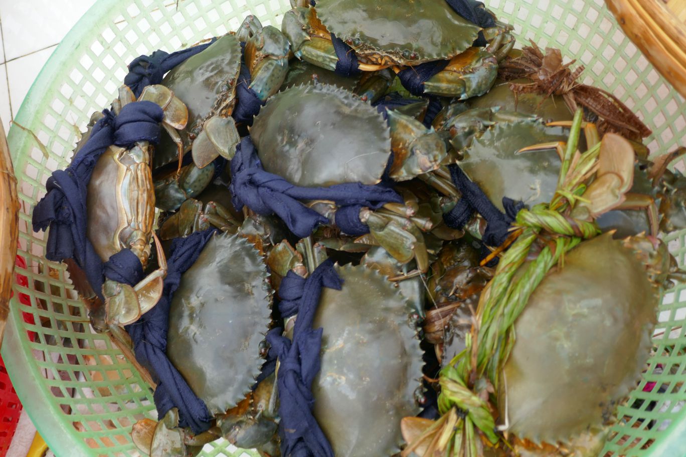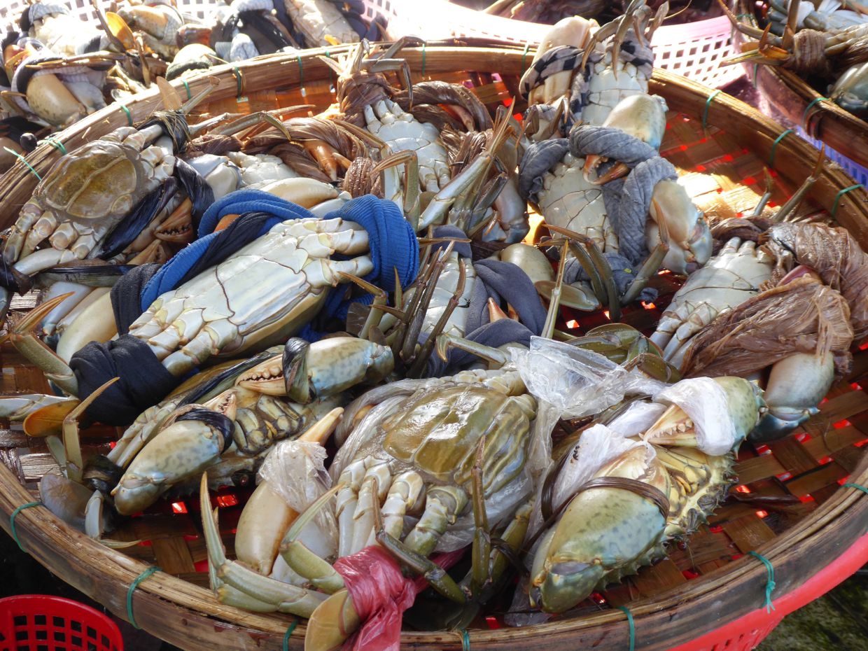 Hier in der Stadt ist es mehr das kleinere Angebot für den täglichen Bedarf, angeliefert mit traditionellen Fischerbooten. Vorbei geht es an den ersten Ständen, an denen Taschenkrebse sehr kunstvoll verschnürt, damit sie sich nicht auf Abwege begeben, verkauft werden.