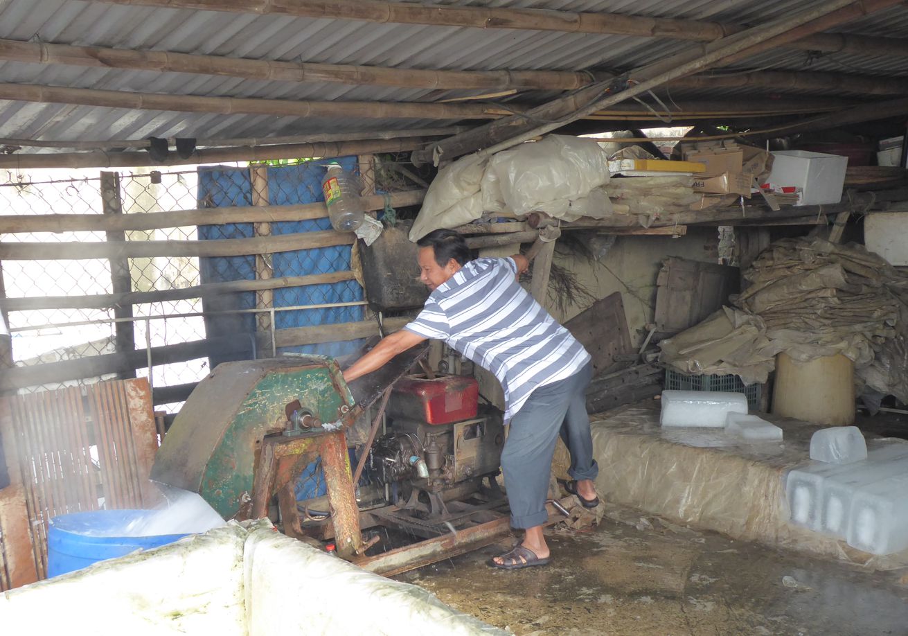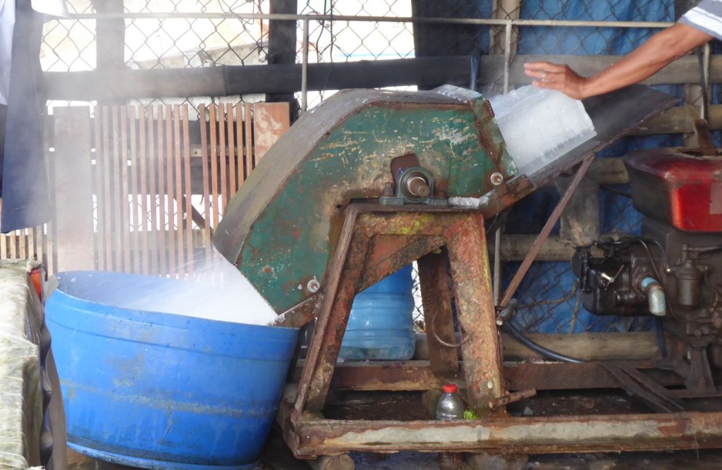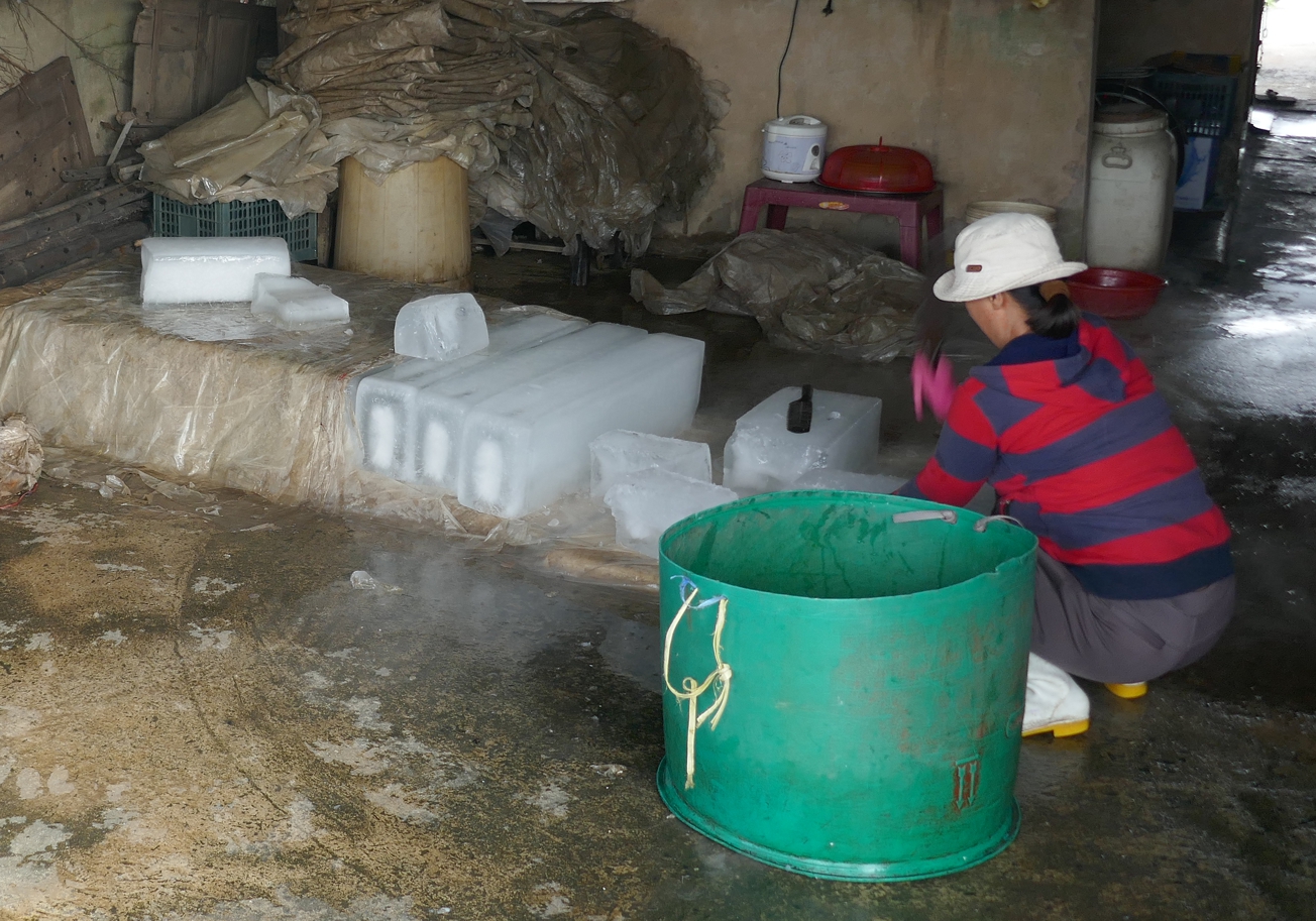 Lange Eisblöcke werden kleingehackt und geschreddert und an die Fischhändler verkauft.