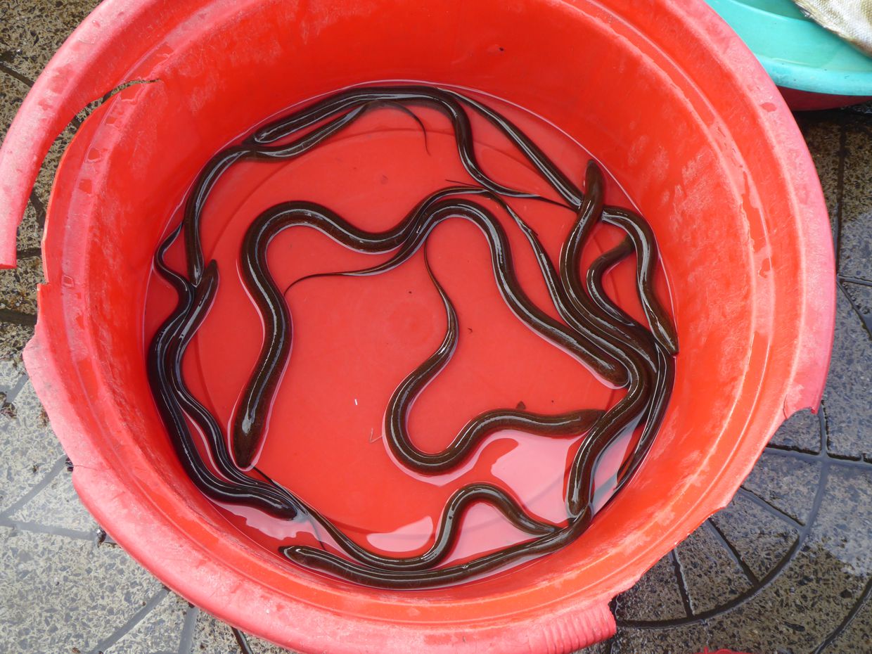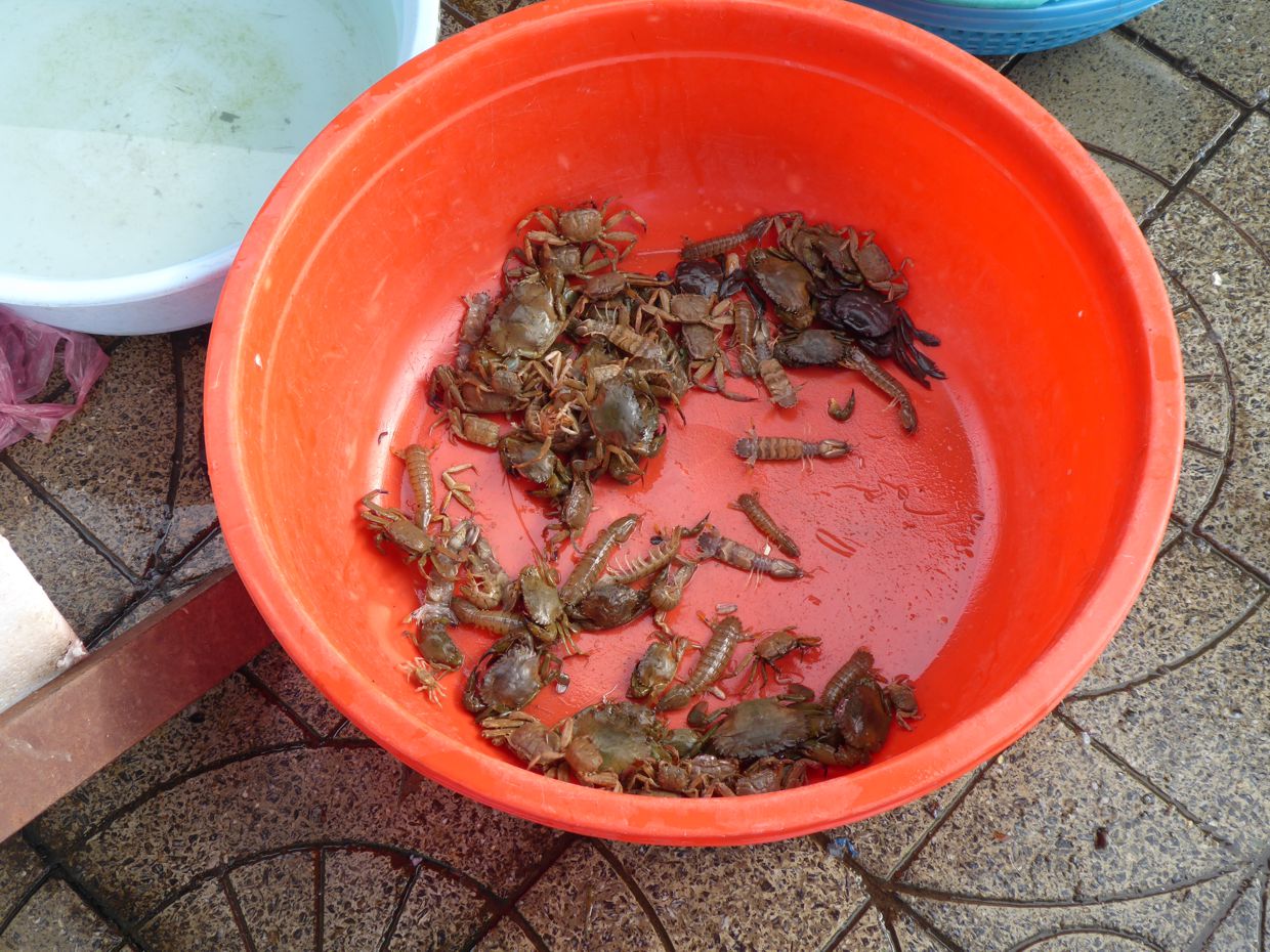 Neben Fischen und Shrimps und Krabben zeigt sich in Körben und Schüsseln zwischendurch auch manch merkwürdiges Getier, darunter schlangenähnliche Meeresbewohner – Aale sind es nicht, sehen aber so ähnlich aus. Manche Krabbeltiere, die da zum Essen angeboten werden, sehen aus wie große Asseln, andere wie überdimensionale Tausendfüßler, und manchen scheinen aus der Familie der Skorpione zu kommen …