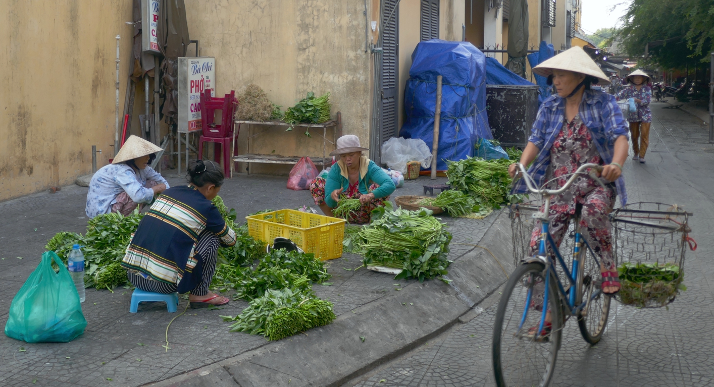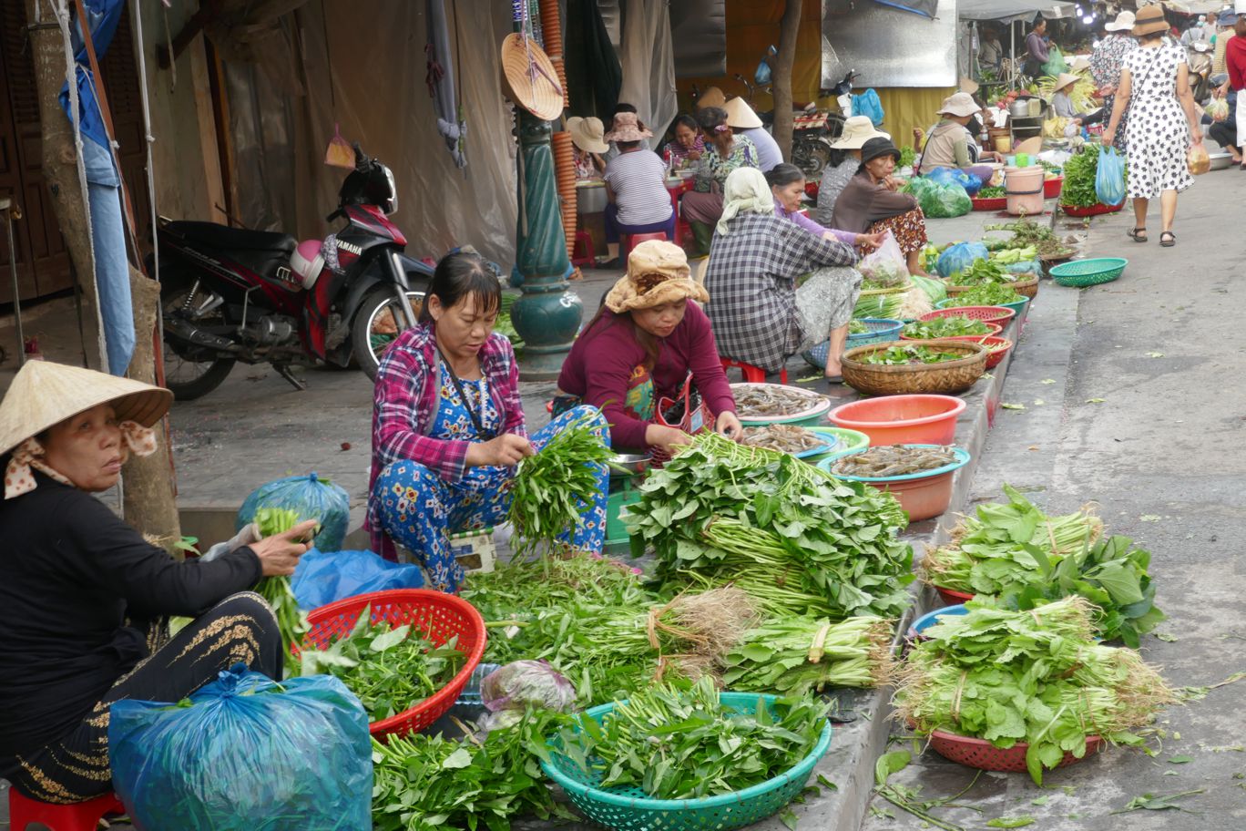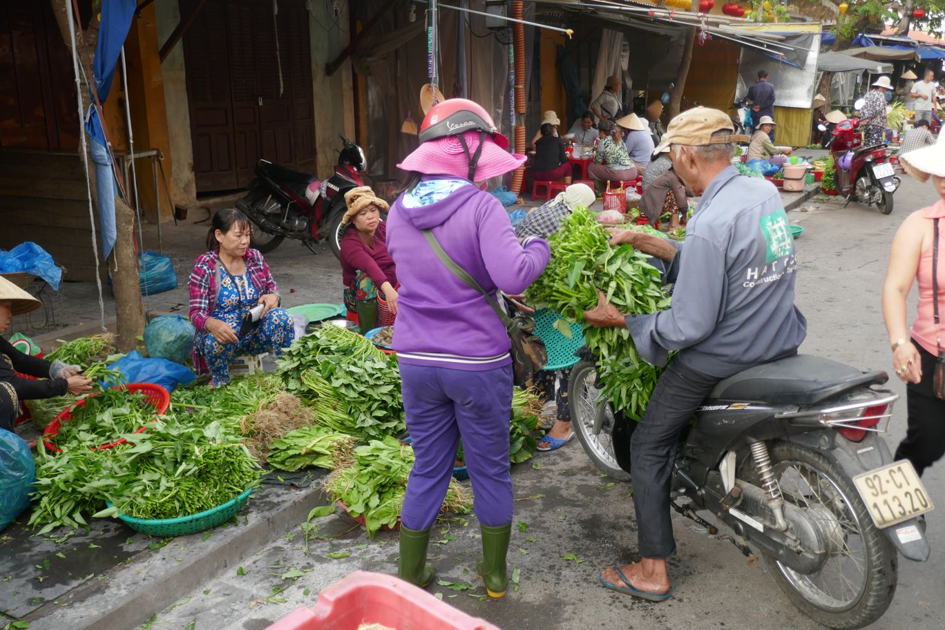Die ersten beiden aktiven Stunden des Tages, von morgens sechs bis acht Uhr, gehört Hội An mehr den Einheimischen. Es ist die Zeit zum Verkaufen und Einkaufen. Unser Taxi bringt uns für den atemberaubenden Preis von 52.000 Dong in die Innenstadt.