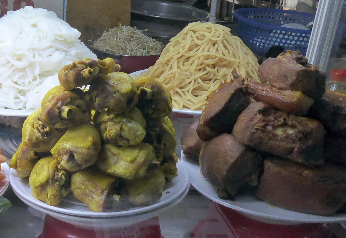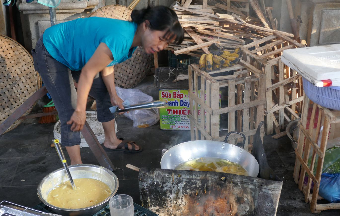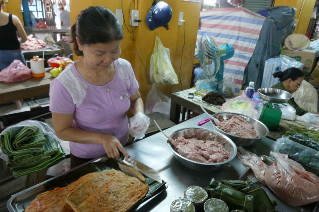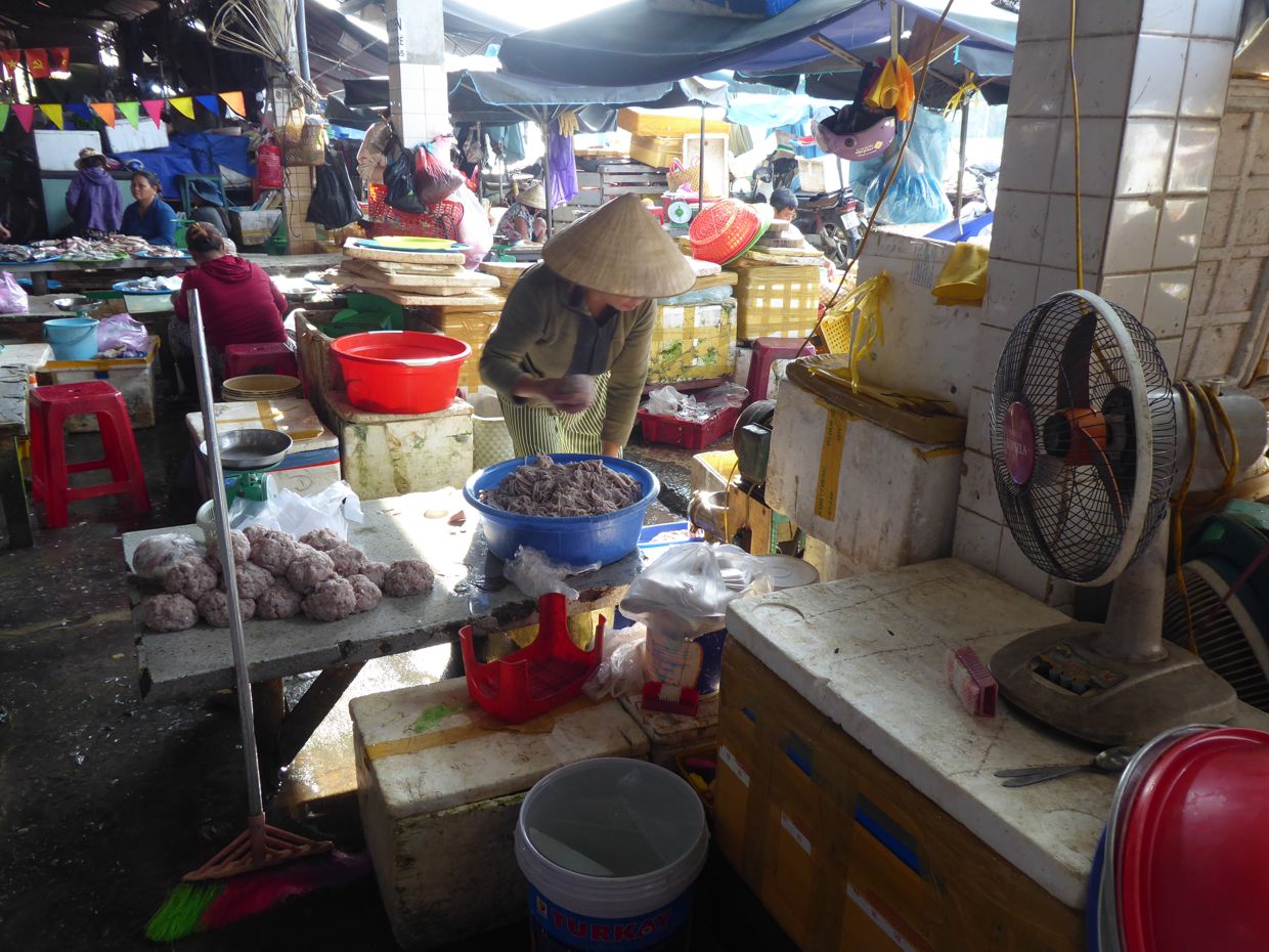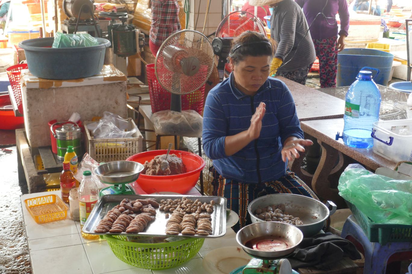 An einigen der Ständen wird Hackfleisch von Hand gehackt, bei den einen anscheinend unterschiedlich gewürzt und zu kleinen Klößen geformt, bei den anderen so etwas ähnliches wie Fleischkäse produziert, der in Vietnam als Suppeneinlage verwendet wird, wie wir in der Ess-Halle schon gesehen hatten.
