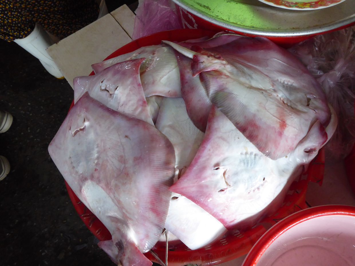 Verschiedenste Tintenfische werden angeboten; wer möchte, dem werden diese nach Kauf fein säuberlich küchenfertig geputzt und zugeschnitten. Viele Thunfisch-Arten sind zu sehen; die kleinen Bonitos werden meist in Scheiben verkauft. Ansonsten ist es eine nicht nur vielfältige, sondern auch eine wirklich bunte Auswahl verschiedenster Fische, auffallend darunter die Rochen, die wie große Fladen herumliegen.