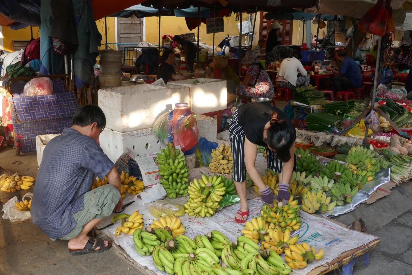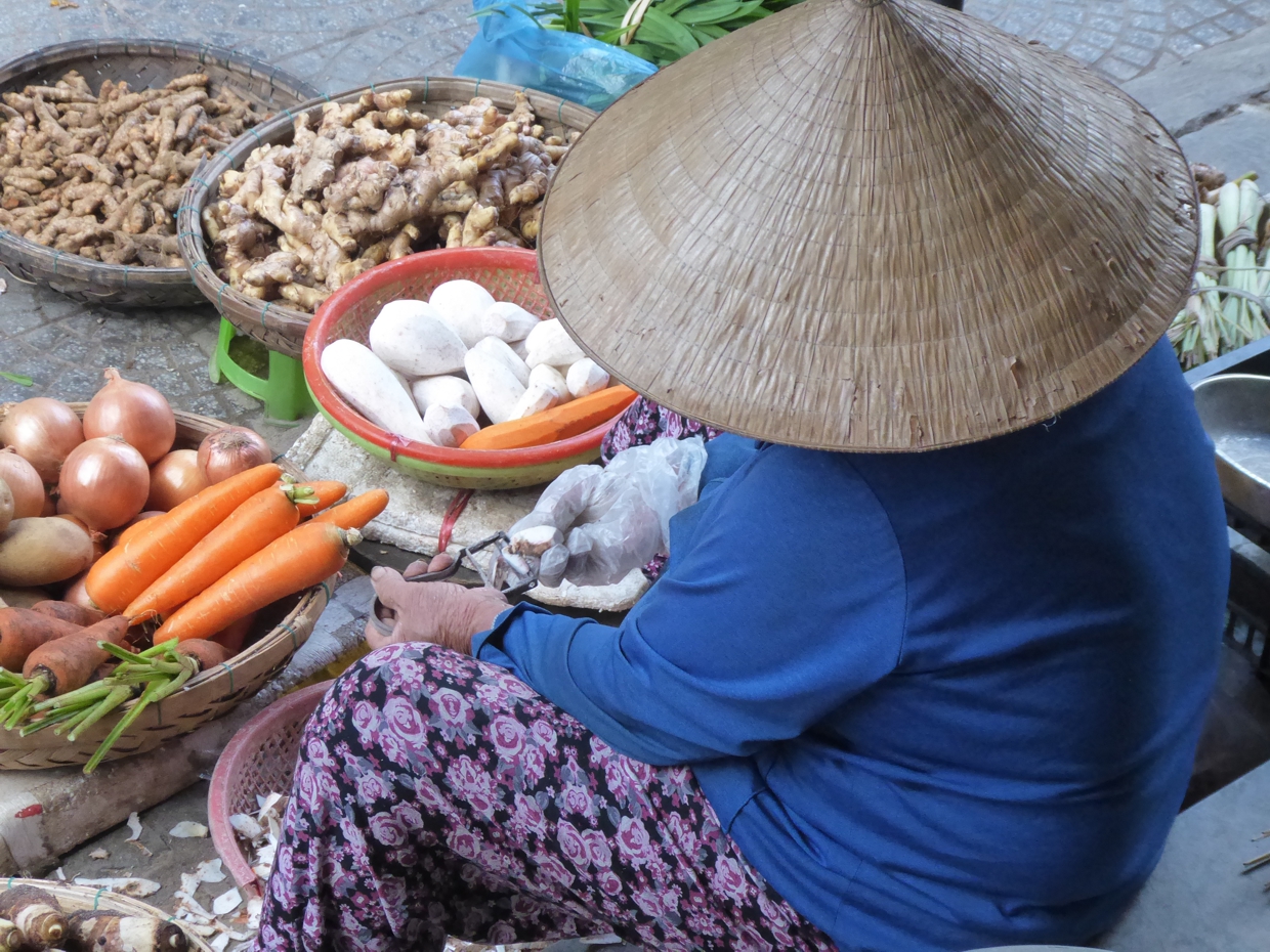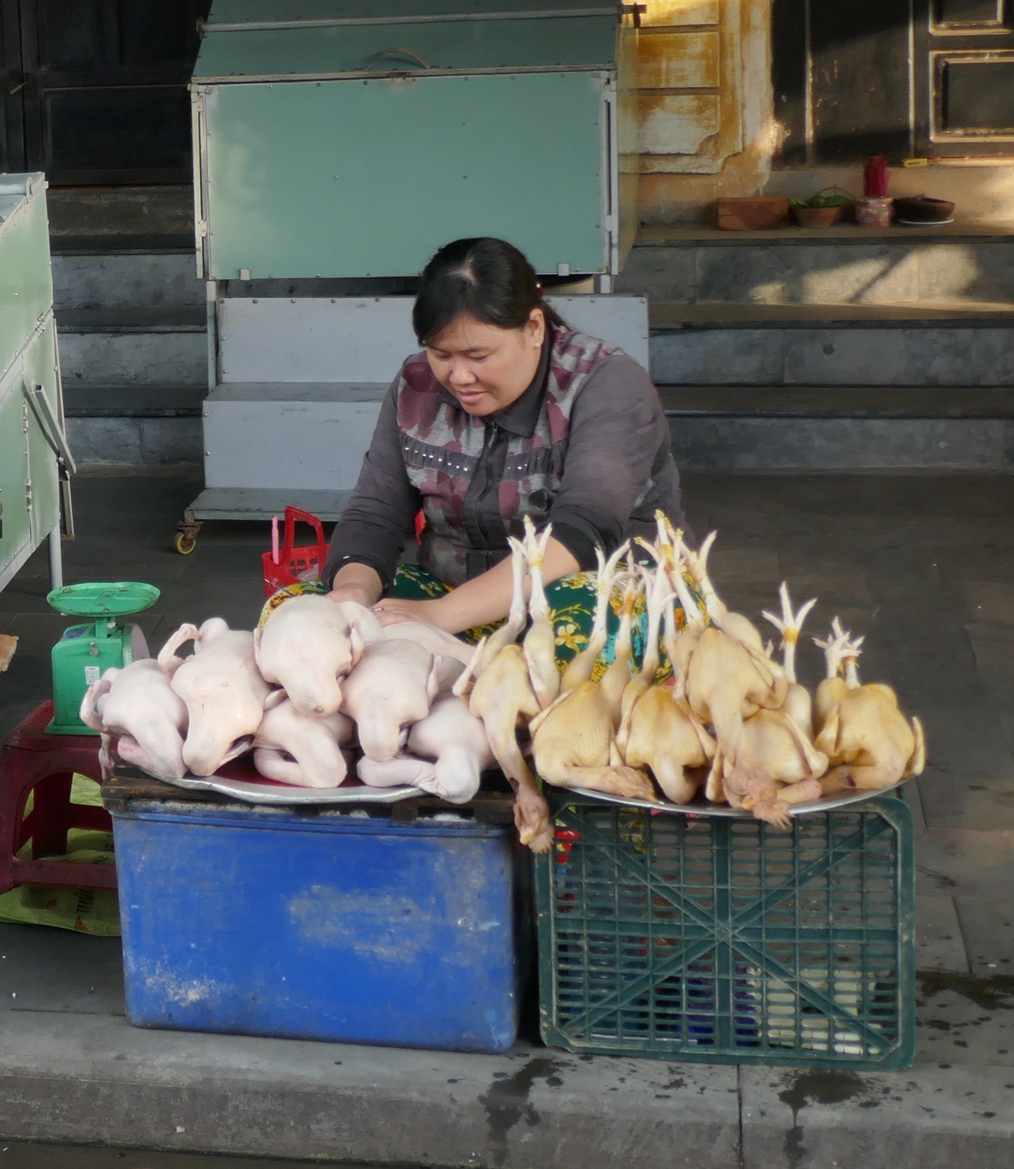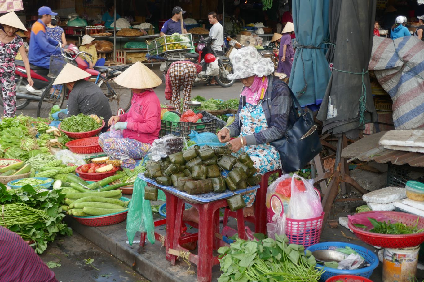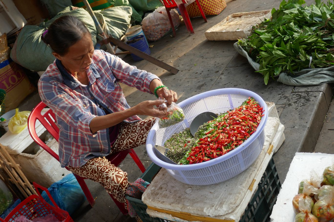 Gemüse wird zurecht gezupft, Wurzeln werden geschält, Mais wird entblättert, Chili-Schoten werden geschnippelt, und Reis wird kunstvoll in Bananenblätter verpackt. So richtig sortiert sind die Marktbereiche nicht – und so findet sich zwischen all dem Gemüse auch mal eine Verkäuferin mit Krabben und Shrimps, oder ein Stand mit frisch geschlachteten Hühnern.