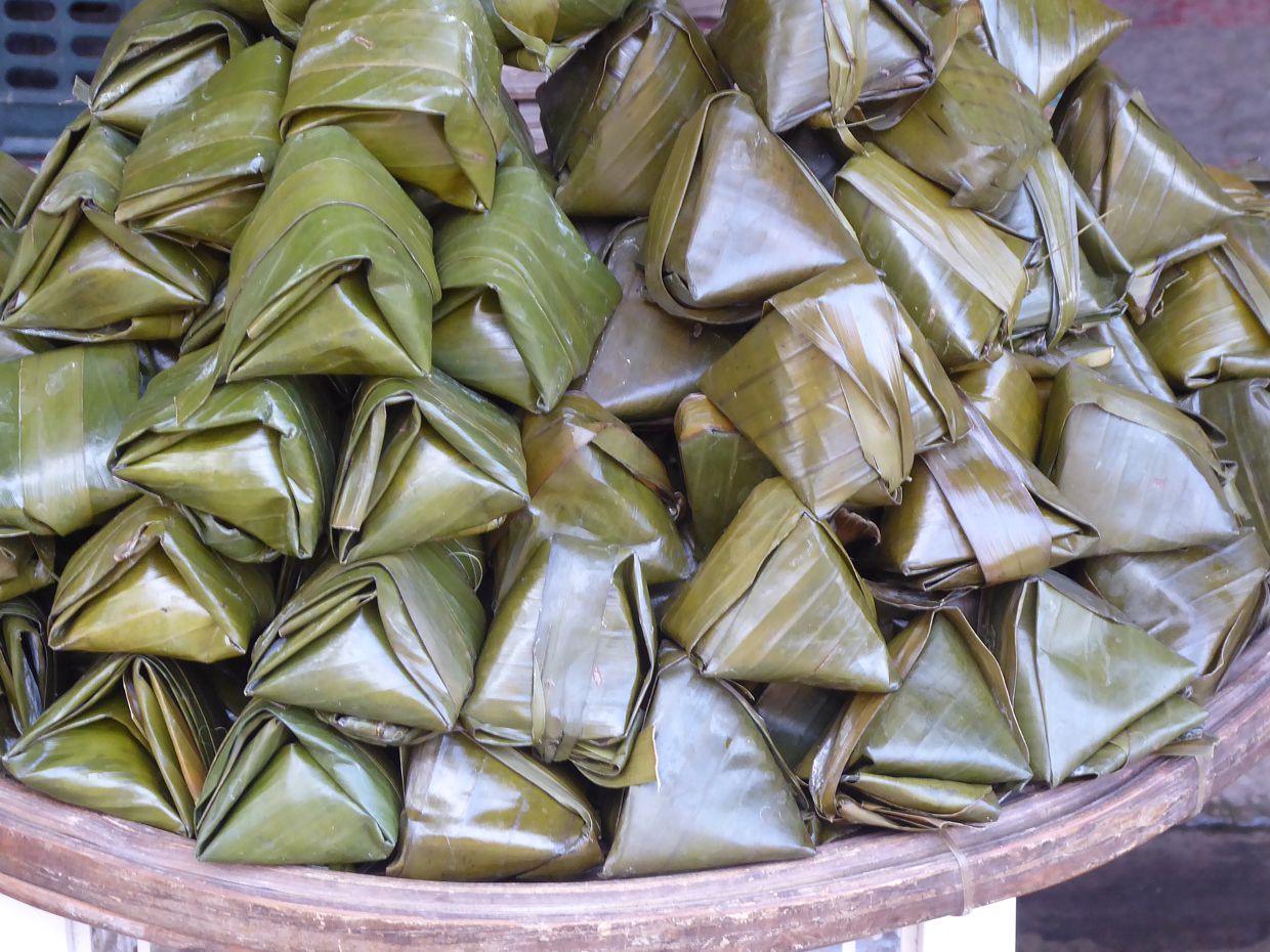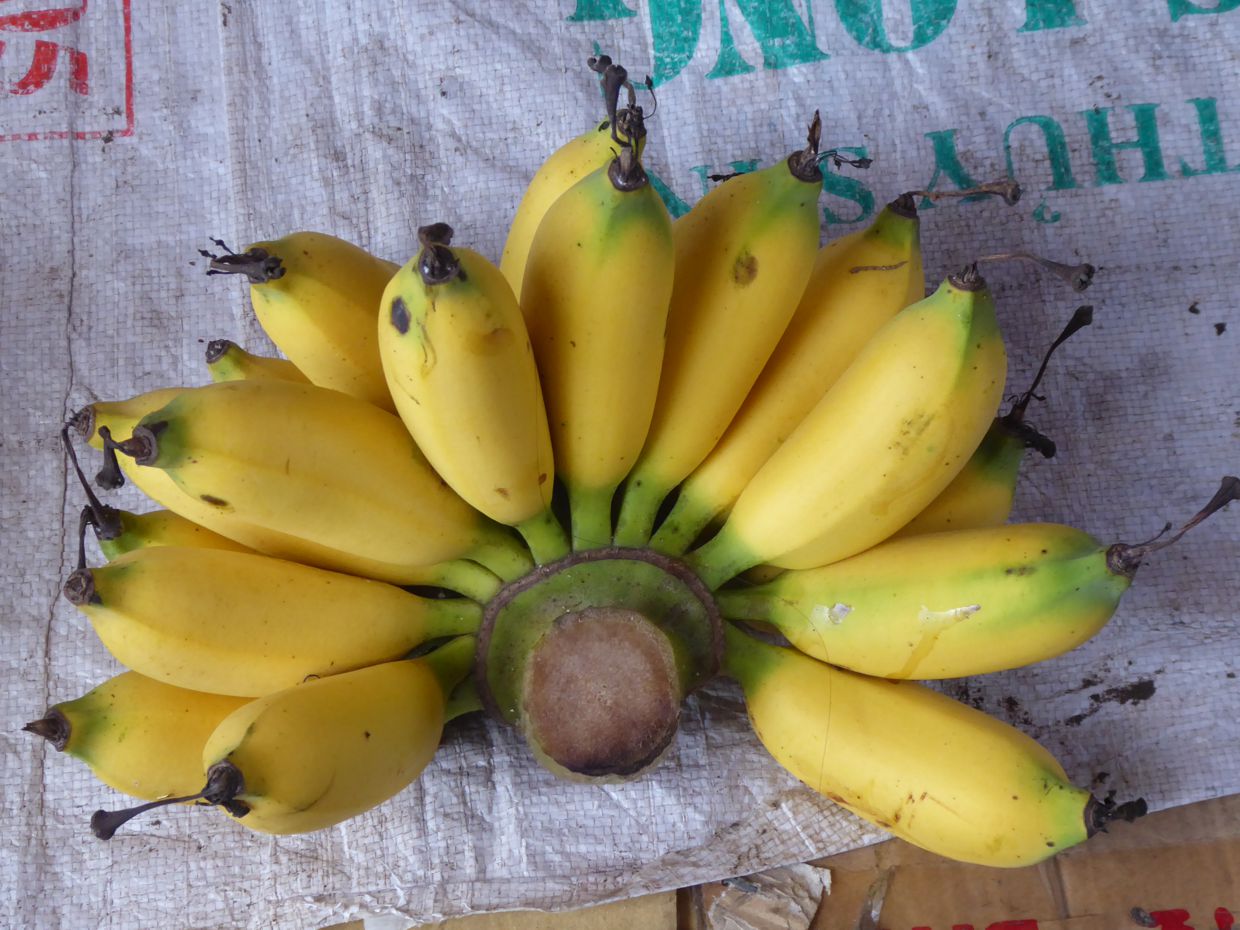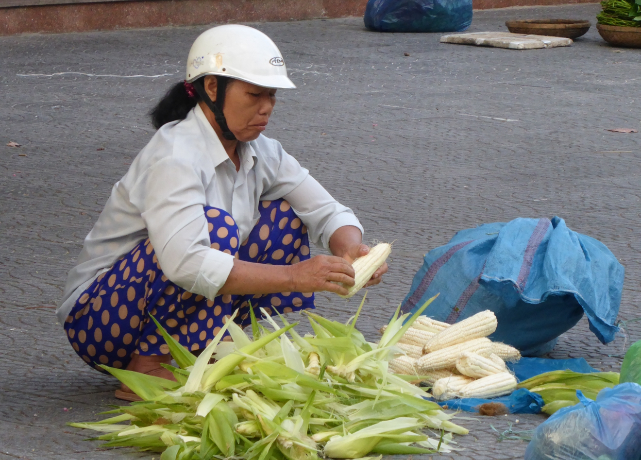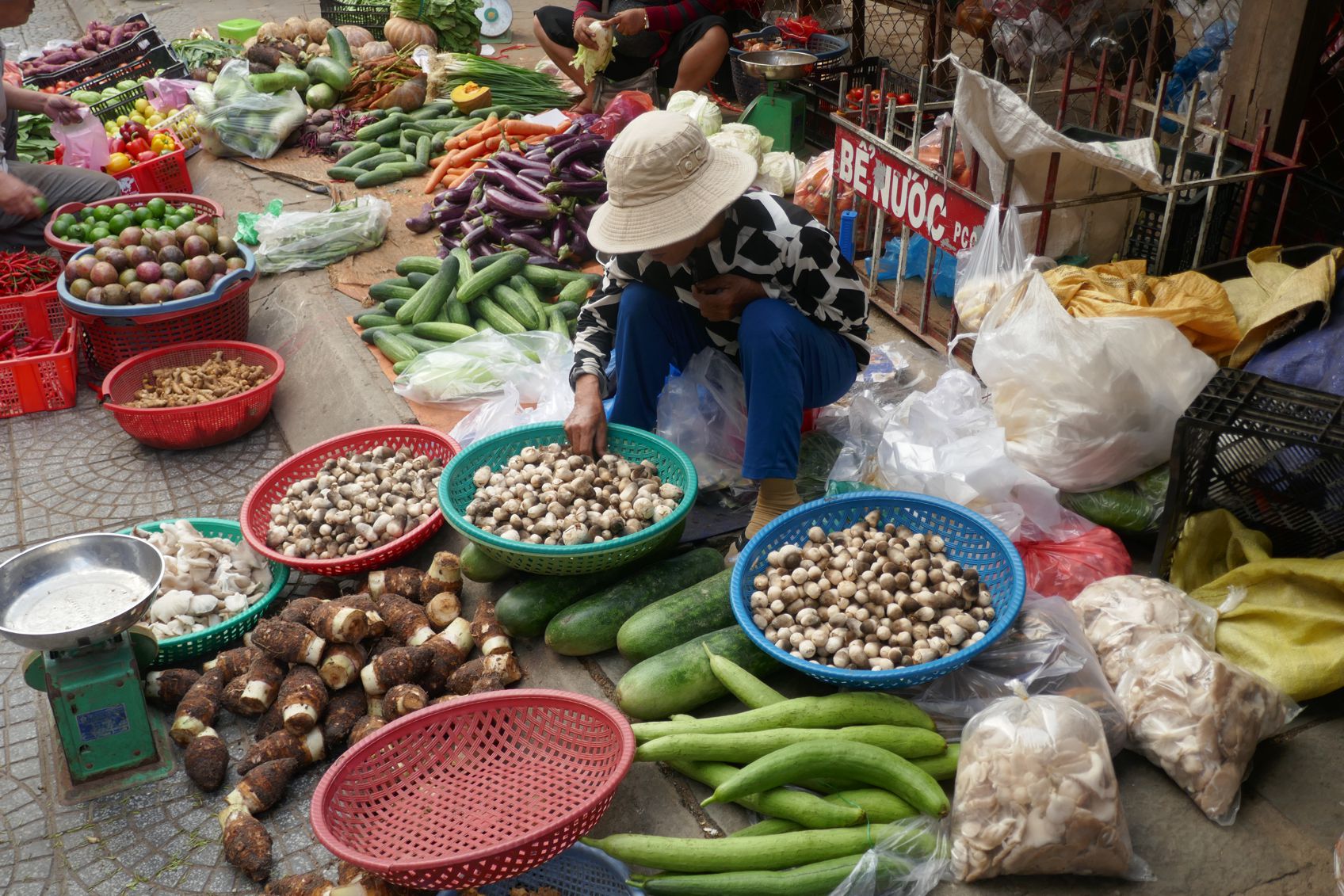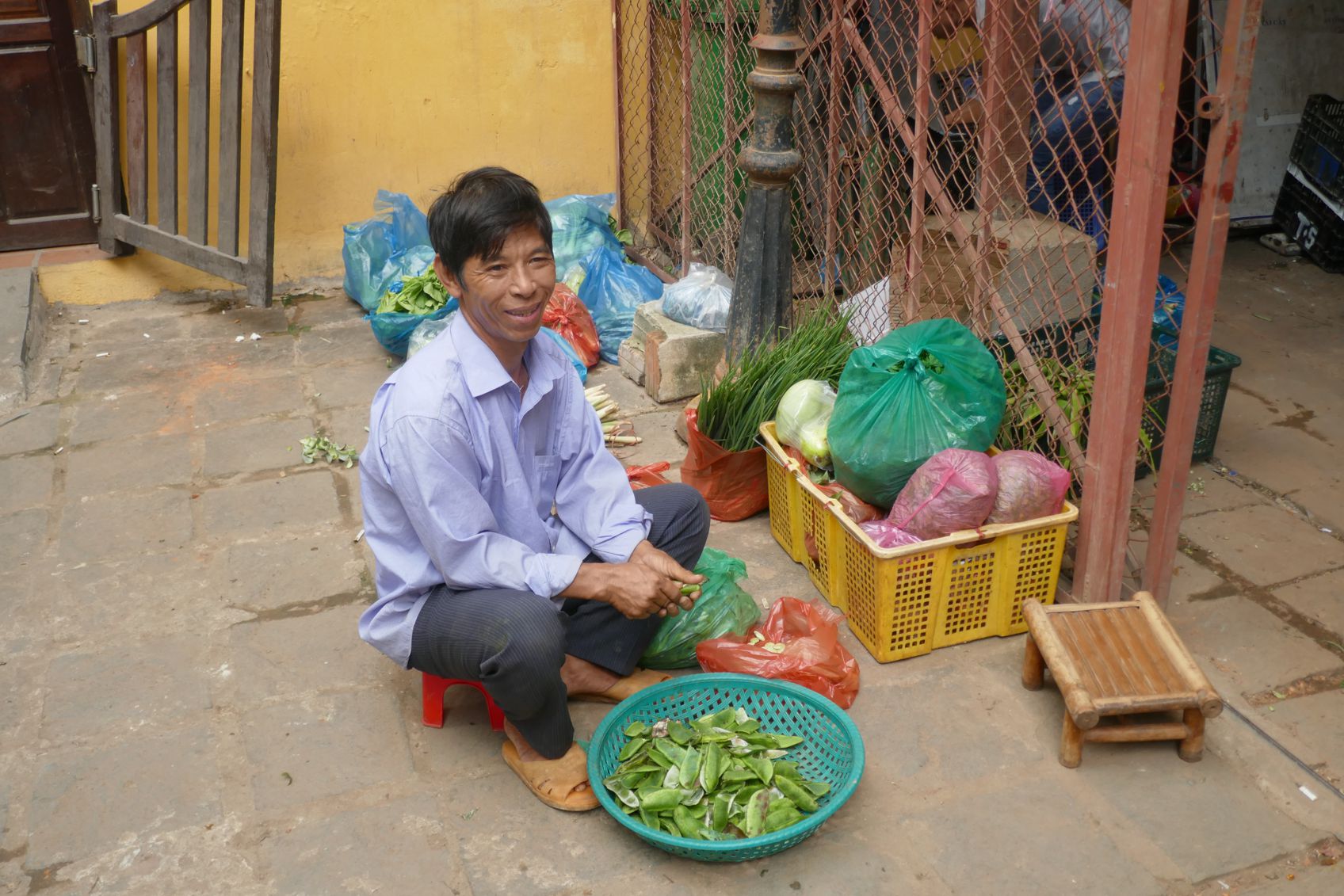 Gemüse wird zurecht gezupft, Wurzeln werden geschält, Mais wird entblättert, Chili-Schoten werden geschnippelt, und Reis wird kunstvoll in Bananenblätter verpackt. So richtig sortiert sind die Marktbereiche nicht – und so findet sich zwischen all dem Gemüse auch mal eine Verkäuferin mit Krabben und Shrimps, oder ein Stand mit frisch geschlachteten Hühnern.
