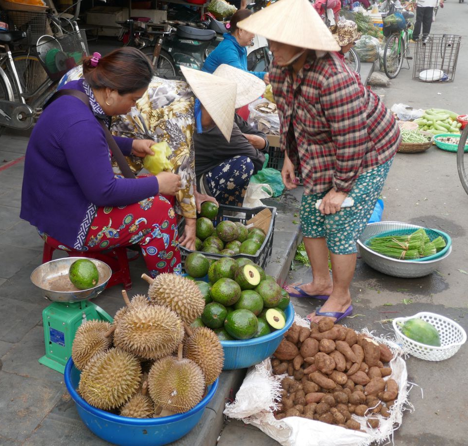 Überall auf den Straßen der Innenstadt herrscht geschäftiges Treiben. An einigen Ständen wird schon verkauft, andere Stände werden noch aufgebaut, allerlei Grünzeug oder Obst mit dem Fahrrad oder Moped angeliefert. Es sieht nach sehr vielen kleinen Erzeugern aus; in dem Bereich, in dem wir ankommen, gibt es eine unglaubliche Vielfalt von all dem, was in Hausgärten geerntet werden kann.