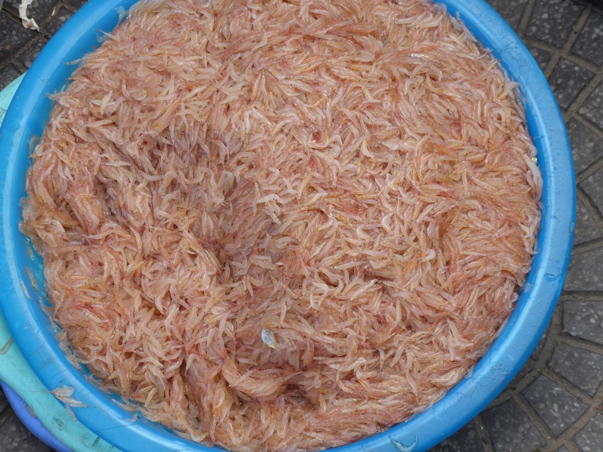 Zwischendrin gibt es auch den einen oder anderen Stand mit Fischen, Tintenfischen, allen erdenklichen Größenordnungen von Shrimps, die am Stand noch sortiert werden, oder auch Körbe mit den kleinen Jungfischlarven. Die Shrimps sind allesamt so frisch, dass sie auf den Auslagekörben hüpfen, manchmal auch raushüpfen. Verkauft wird von Jung und Alt. Vom Fluss aus oder mit dem Moped wird Ware nachgeliefert.