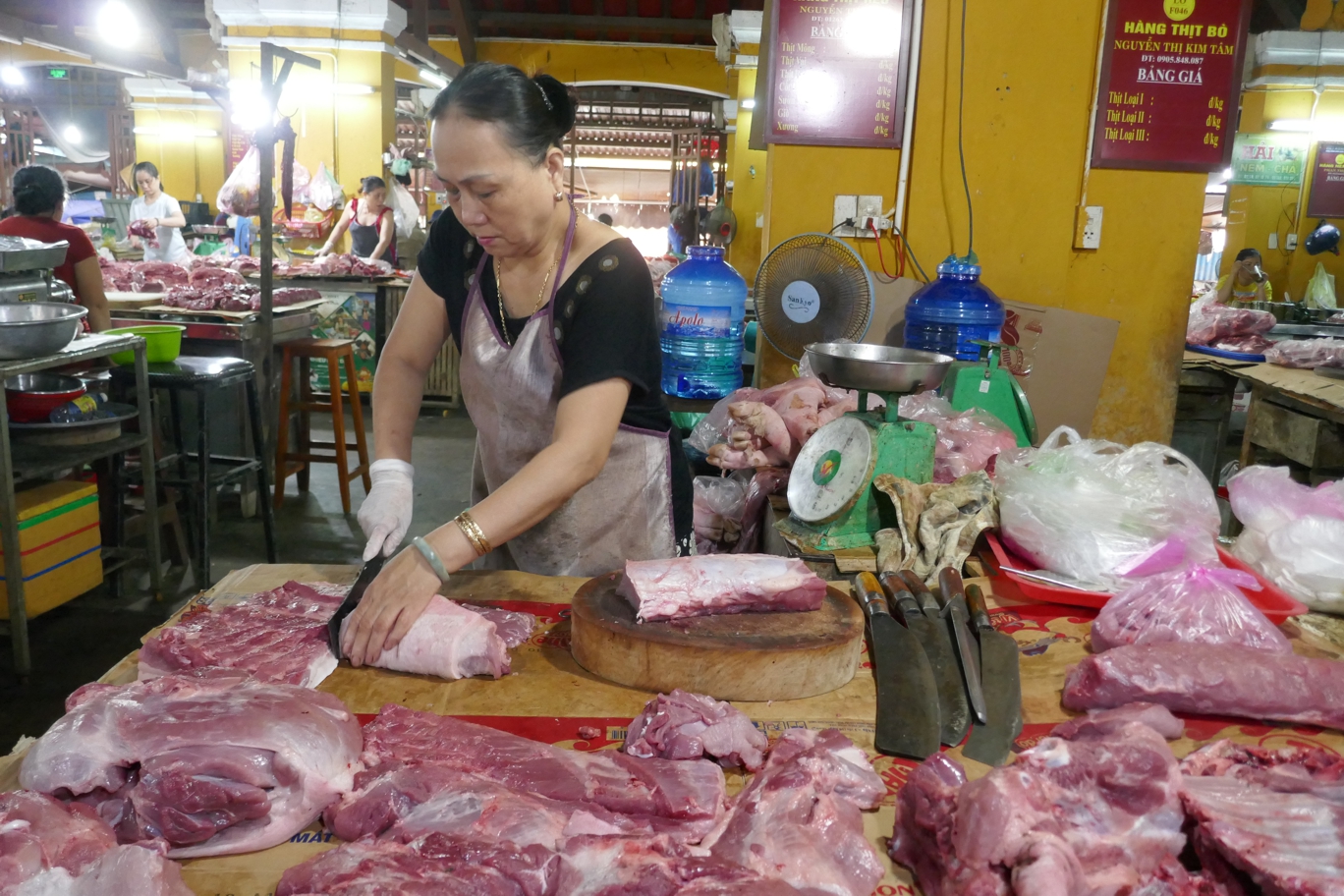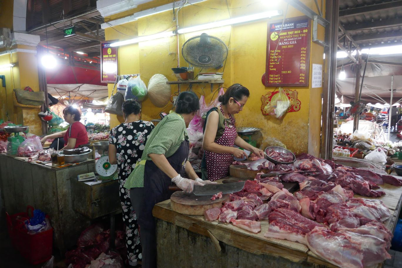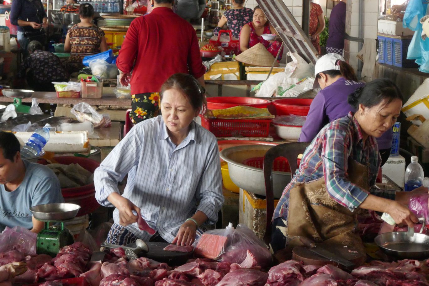 Nebenan im Eingangsbereich zur Fleischhalle wird noch eine bunte Mischung angeboten – Hühner, Enten, Gänse, dazwischen Innereinen von kleineren und größeren Tieren, dazwischen auch mal Fisch. Aber dann folgt ein großer Bereich, in dem vor allem große Schweinestücke in haushaltsgroße Portionen zerlegt und nach Wünschen der Einkaufenden fein säuberlich zurechtgeschnitten und für Pfanne oder Kochtopf vorbereitet werden.
