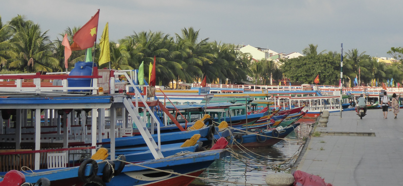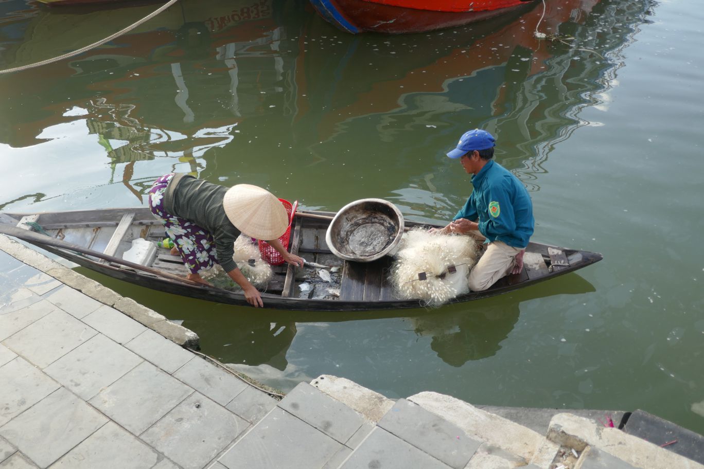 Eine Straße führt vor zum Fluss. Hier wird weiter für den Markt angeliefert. Ein Fischer-Paar sammelt die letzten Fische aus dem Netz. Etwas weiter stehen die bunten Ausflugsboote, die am Vorabend zwischen Lampions und Schwimmkerzen und den kleinen Booten für die Pärchen auf dem Fluss unterwegs waren.
