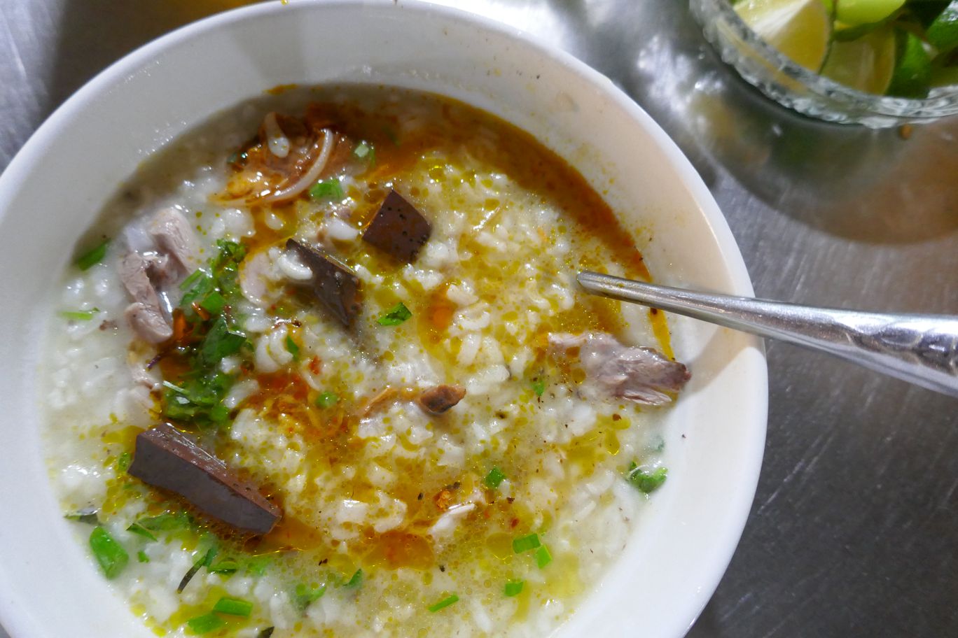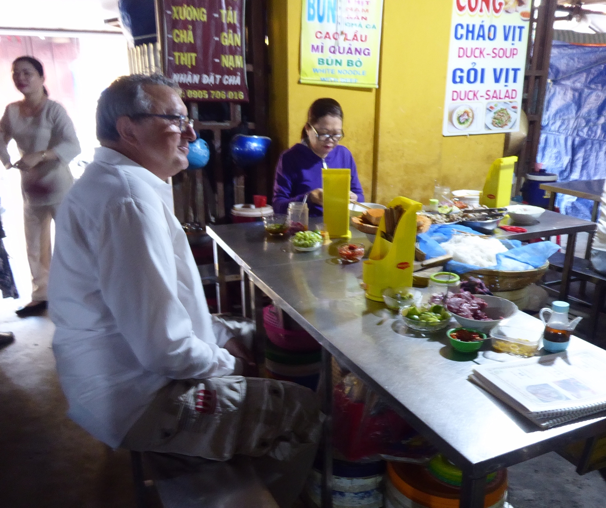 Und in einer der Markthallen, die man eher als Streetfood-Halle bezeichnen sollte, da sie „nur“ über und über mit Mini-Ess-Ständen gefüllt ist, genehmigen wir uns noch eine Frühstücks-Suppe mit Ente. Nicht schlecht, gut gewürzt, die Brühe wie immer etwas glibberig, mehr gewöhnungsbedürftiger eher die darin schwimmenden Entenstücke – die Ente wie immer mit Knochen kleingehackt und reingeworfen, für die Köchin einfach, für den die Suppe essenden Europäer eine kleine Herausforderung, ebenso wie die dunkelbraunen Brocken in der Suppe, die so eine Art Blutwurst zu sein scheinen.