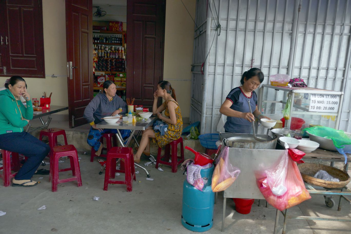 Für gerade mal knapp mehr als 2 Euro fahren wir die paar Kilometer vorbei an den ersten Straßenständen, an denen schon gefrühstückt wird, das zu allen Tages- und Nachtzeiten anscheinend wichtigste Grundnahrungsmittel, die Suppe. Jetzt um diese Uhrzeit sehen wir überall Menschen beim Suppe-Löffeln, diejenigen, die aussehen als würden sie gleich zur Arbeit gehen, und vor allem Schülerinnen und Schüler. Die Schule scheint sehr früh zu beginnen – schon kurz nach sechs Uhr Kinder sind auf dem Schulhof beim Sport.