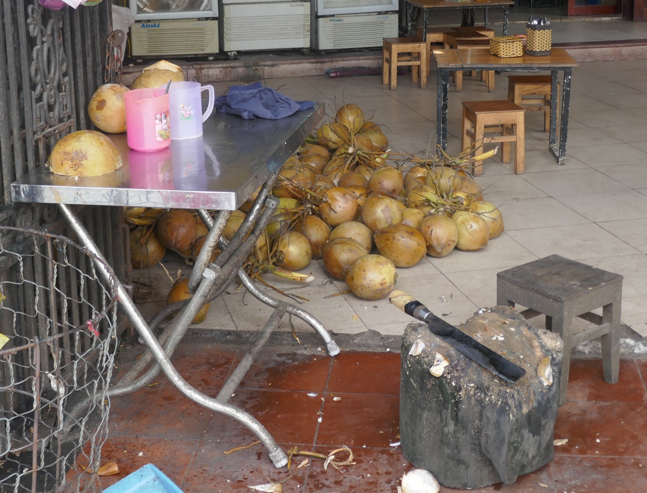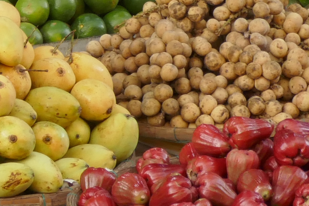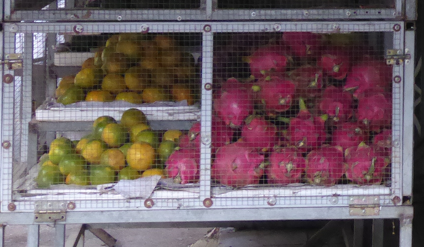 Selten sieht man so viele Bananensorten, und diese auch noch in unterschiedlichen Reifegraden. Dasselbe gilt für die Kokosnüsse – verschiedene Sorten, von relativ unreif und grasgrün bis goldgelb, für jeden Bedarf, zum Trinken, für den glasigen Glibber für verschiedene Speisen, oder relativ trocken, wie man das Fruchtfleisch eher bei uns kennt. Viele der riesigen Nüsse hängen noch im Bündel an Zweigen, wie sie gewachsen sind, andere stecken in den getrockneten Fasern, die meist zu Brennmaterial werden. Reihenweise sieht man reif geerntetes, frisches Obst – die Auswahl ist einfach beeindruckend. Einige Anbieter haben eine bunte Auswahl, andere sind eher spezialisiert auf Mangos, Bananen, Ananas oder Zitrusfrüchte. Orangen sind hier nicht orange, sondern auch tiefgrün oder gefleckt; Pomelos werden hellgrün angeboten, nicht gelb – aber allesamt sind sie reif.
