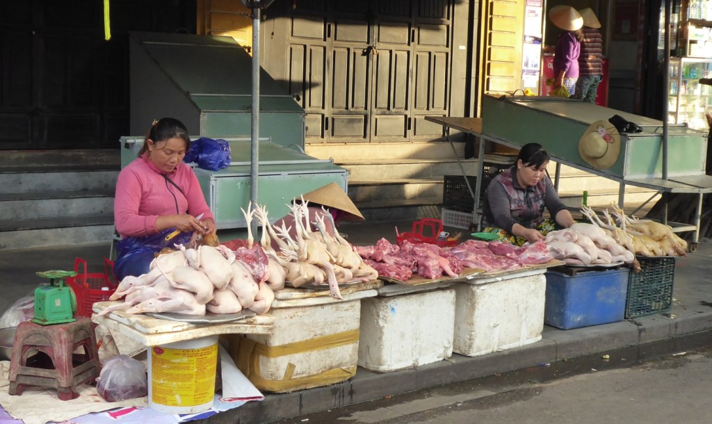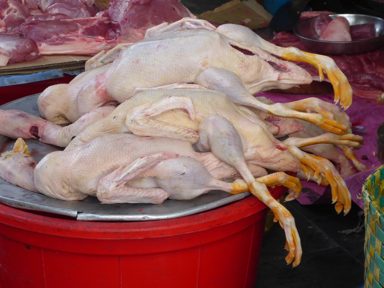 Ungewöhnlich anzusehen sind diese Stände mit dem „gerupften Federvieh“ – die einen ziemlich komplett, auf dem Rücken liegend, die anderen fein säuberlich zerlegt, für die Verwertung von fast allem, einschließlich der Hühner- oder Entenfüße. Was da liegt, ist höchst sorgfältig hergerichtet. Alles ist so präsentiert, dass direkt ersichtlich ist, dass es frisch ist, ob komplett oder zerlegt. Bei den frisch geschlachteten Hühnern und auch den Enten wird darauf acht gegeben, dass immer noch alle Merkmale dran sind, die auf Frische hinweisen, ob Füße oder Köpfe mit den Kämmen. Ob Huhn oder Hahn, Ente oder Erpel, auch das soll erkennbar sein. Oft sind die Tiere aufgeschichtet wie skurril aussehende Kunstwerke, die die Beine in eine Richtung strecken, meist himmelwärts.