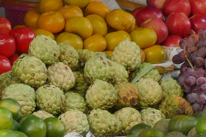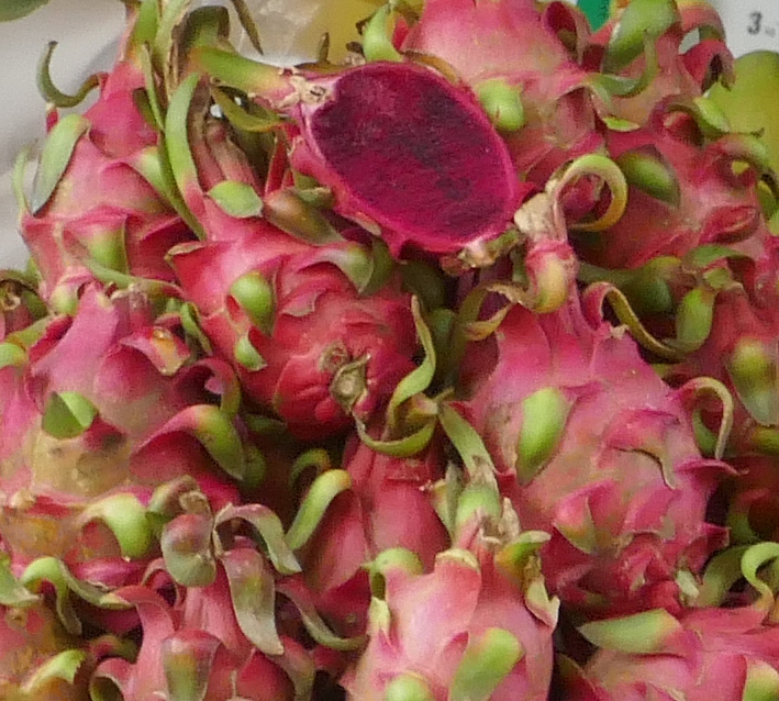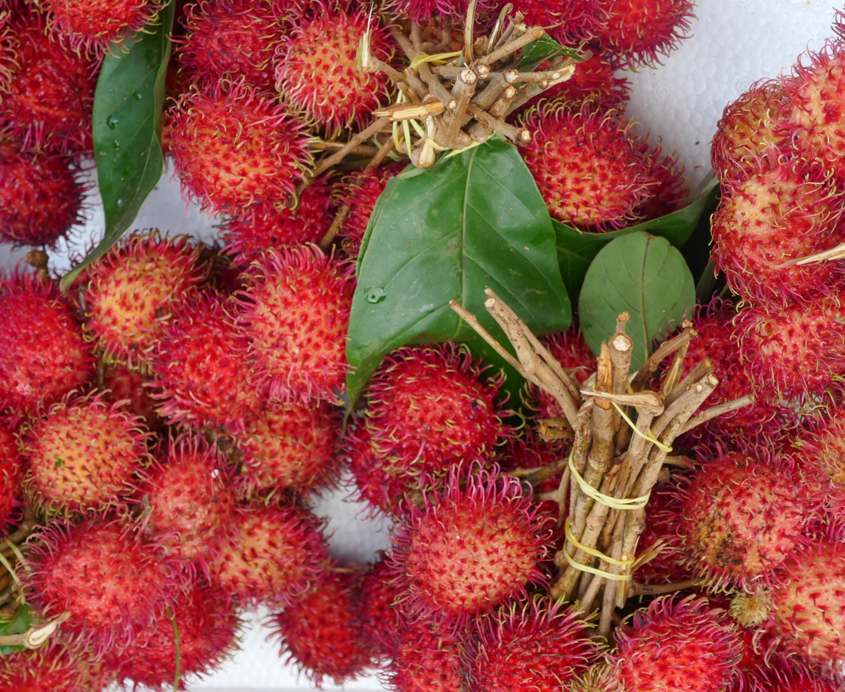 Uns fällt natürlich all dasjenige besonders auf, das bei uns seltener zu sehen ist, und vor allem nicht reif und in der Frische, die hier zu sehen ist – Drachenfrüchte, Litschis, Kimanos, Cherimoyas, Karambole, Papayas, Maracujas, Tamarillos, Guaven, Jackfruits, Longans, Rambutan, Mangostane, der Rosenapfel, der gar kein Apfel ist, oder die Buddhas Finger genannte, ziemlich zerfleddert aussehende Zitrusfrucht, und noch viel mehr. Und auch die „Stinkefrucht“ darf nicht fehlen, die stachelige Durian. Man kommt sich fast vor wie in einem anschaulich präsentierten Lehrbuch für Früchte, die wir gerne als exotisch bezeichnen.