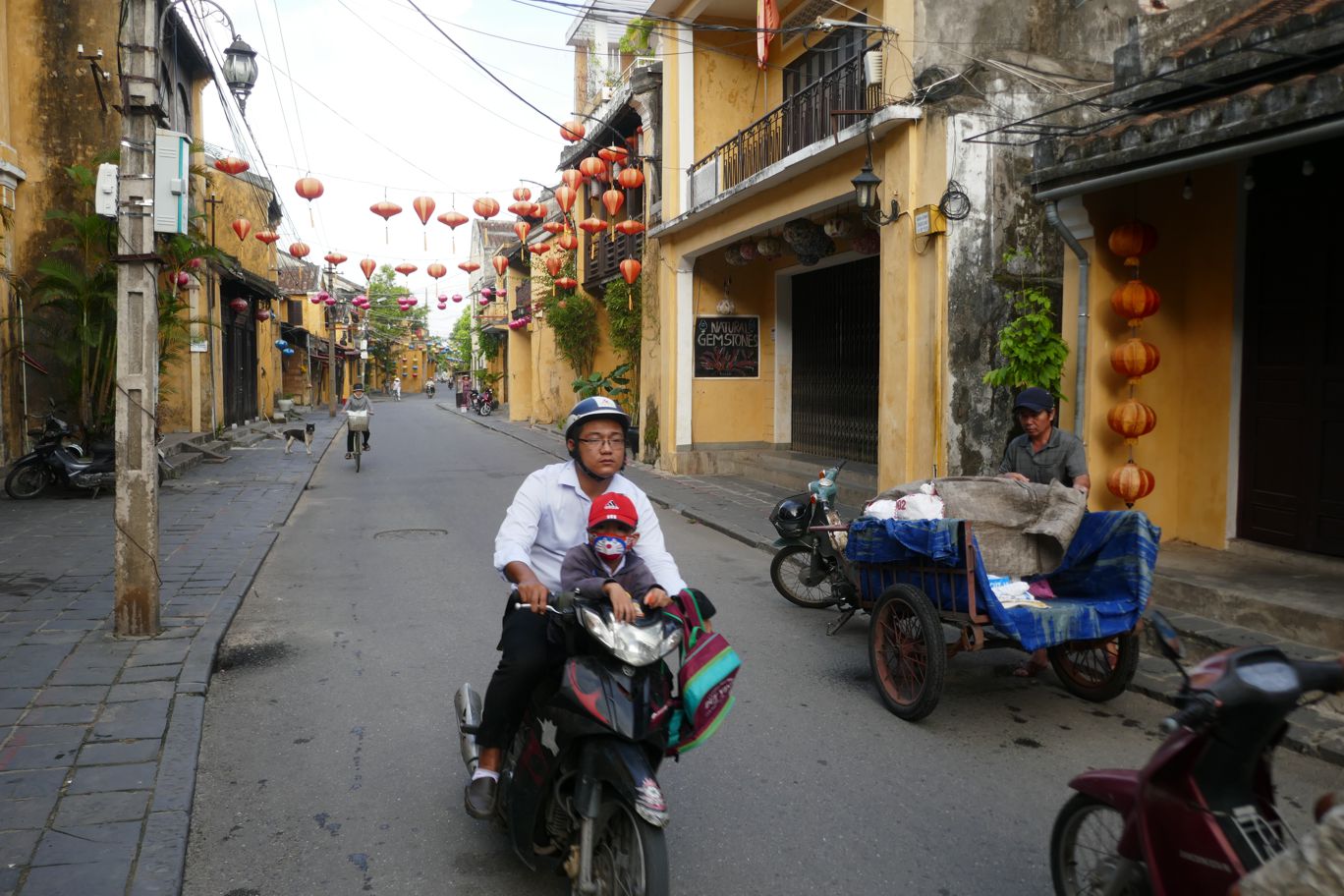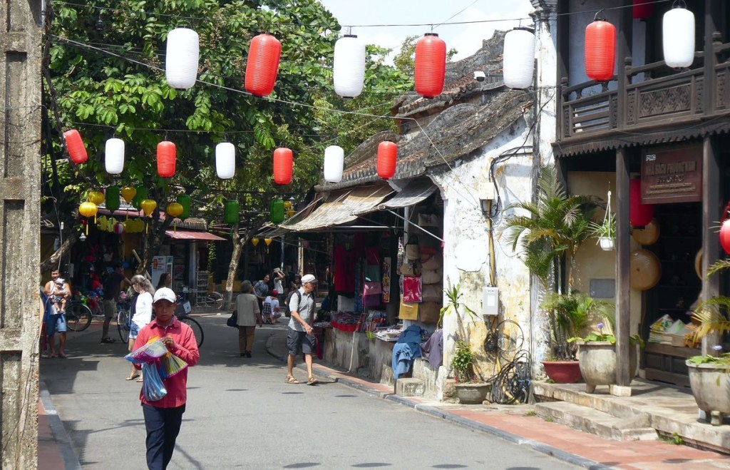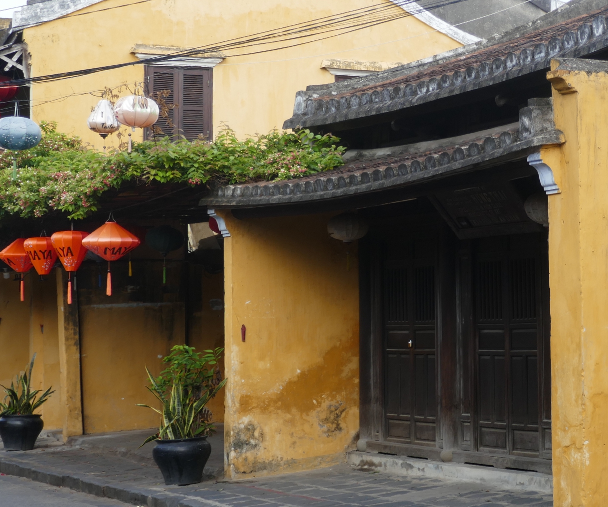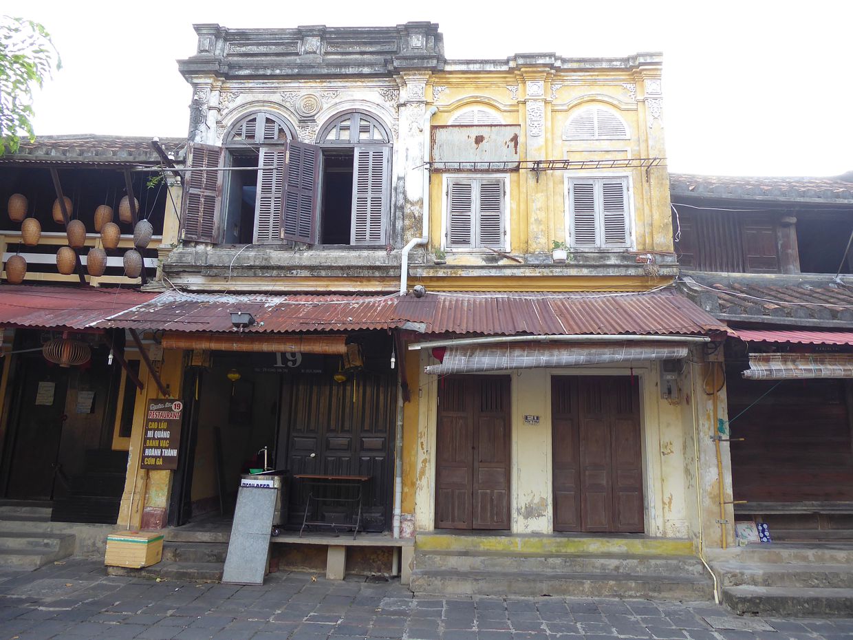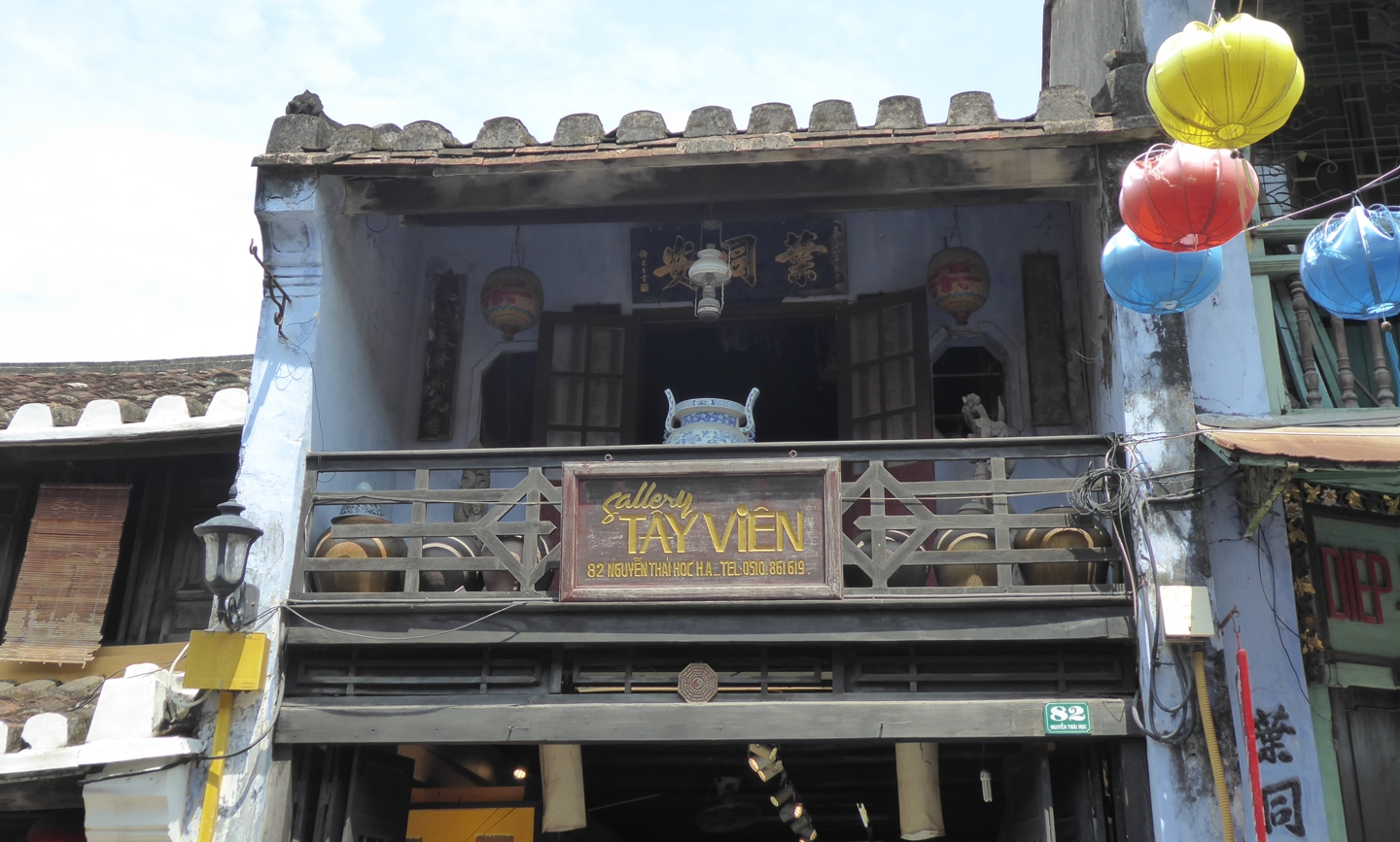 Für uns geht es weiter durch Hội An, vorbei an einigen alten Gebäuden. Von unserem Reiseleiter hören wir, dass Hội An im Vietnamkrieg ziemlich stark zerstört worden sei, von der Altstadt nur noch wenig erhalten war, aber die alten Häuser mit Unterstützung der UNESCO wieder aufgebaut wurden. Jetzt sei die Zeit, in der viele davenoviert werden müssten; vor allem die Dächer seien neu zu machen – einige stehen allerdings noch wie in vergangenen Zeiten.