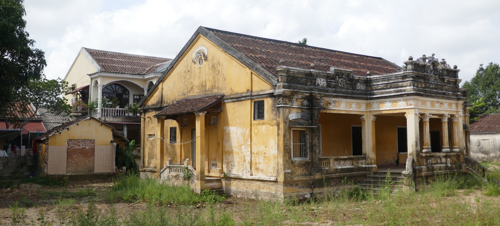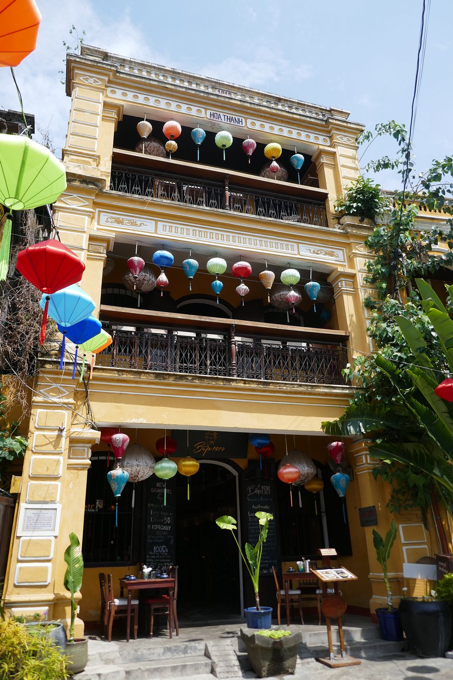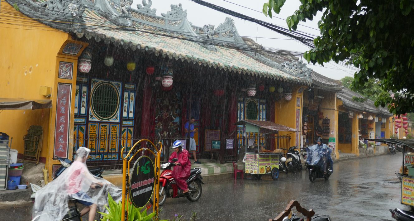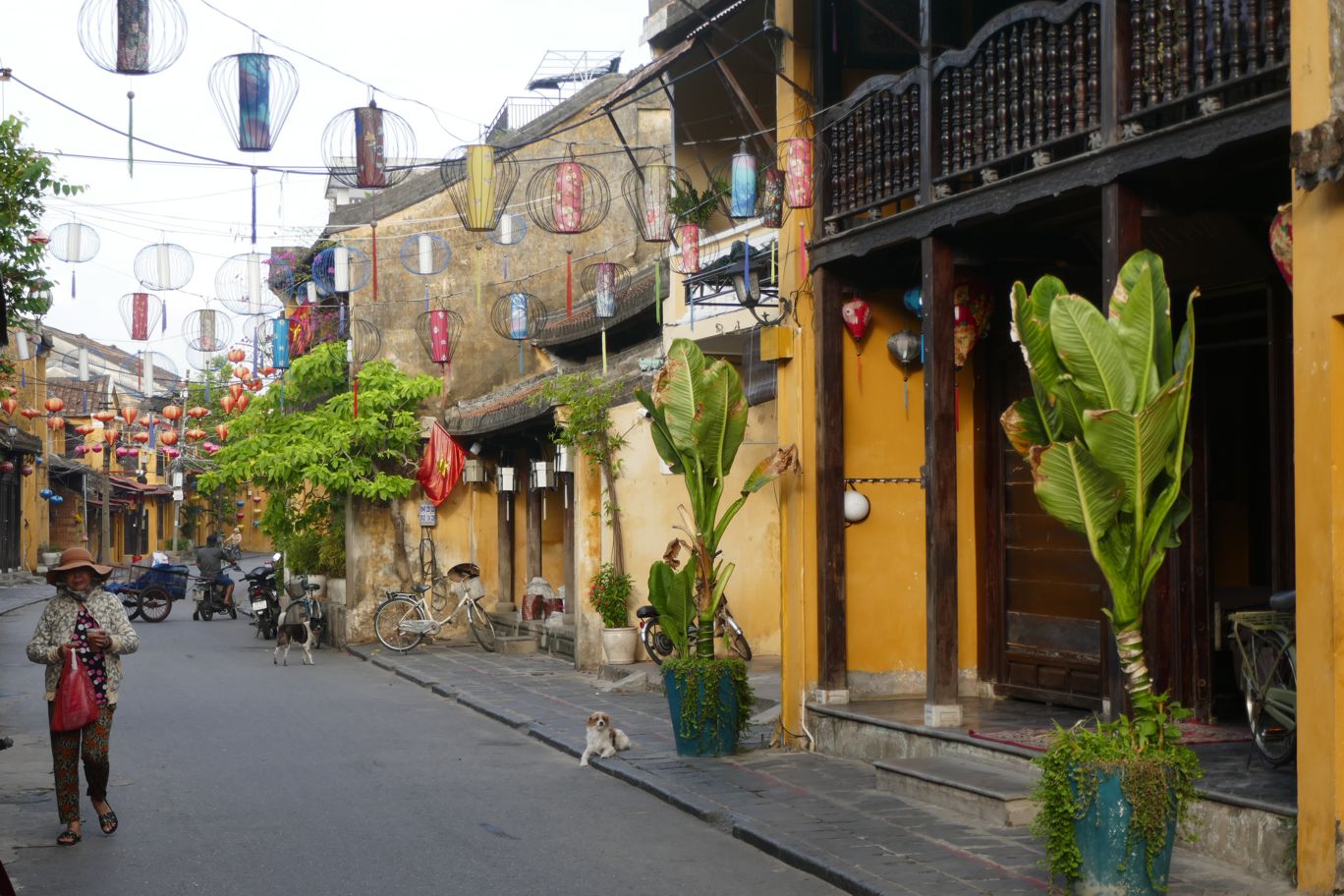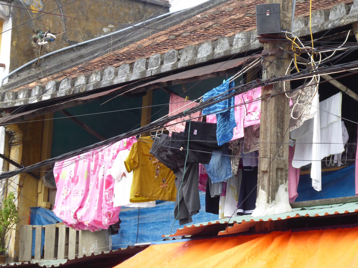 Für uns geht es weiter durch Hội An, vorbei an einigen alten Gebäuden. Von unserem Reiseleiter hören wir, dass Hội An im Vietnamkrieg ziemlich stark zerstört worden sei, von der Altstadt nur noch wenig erhalten war, aber die alten Häuser mit Unterstützung der UNESCO wieder aufgebaut wurden. Jetzt sei die Zeit, in der viele davenoviert werden müssten; vor allem die Dächer seien neu zu machen – einige stehen allerdings noch wie in vergangenen Zeiten.