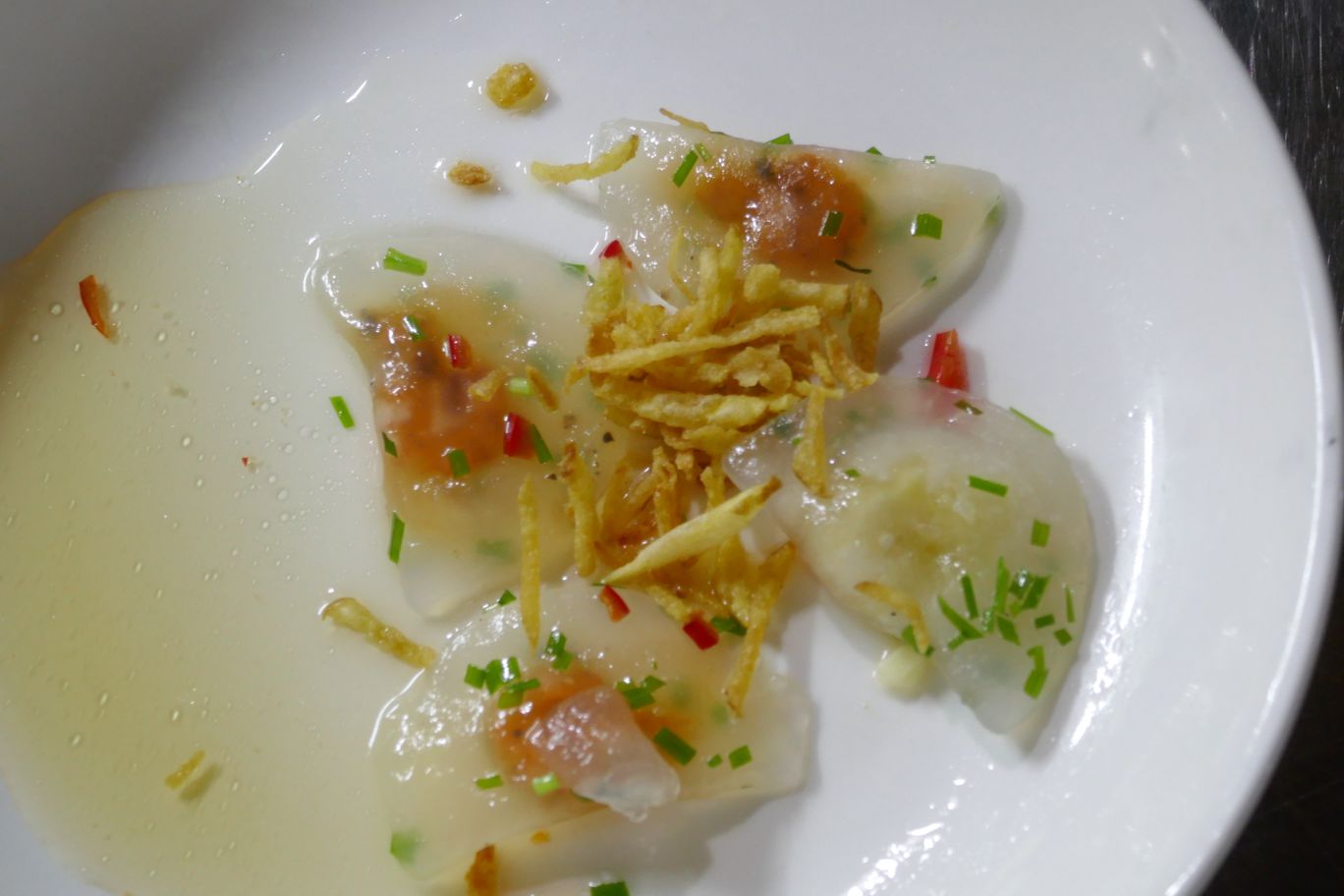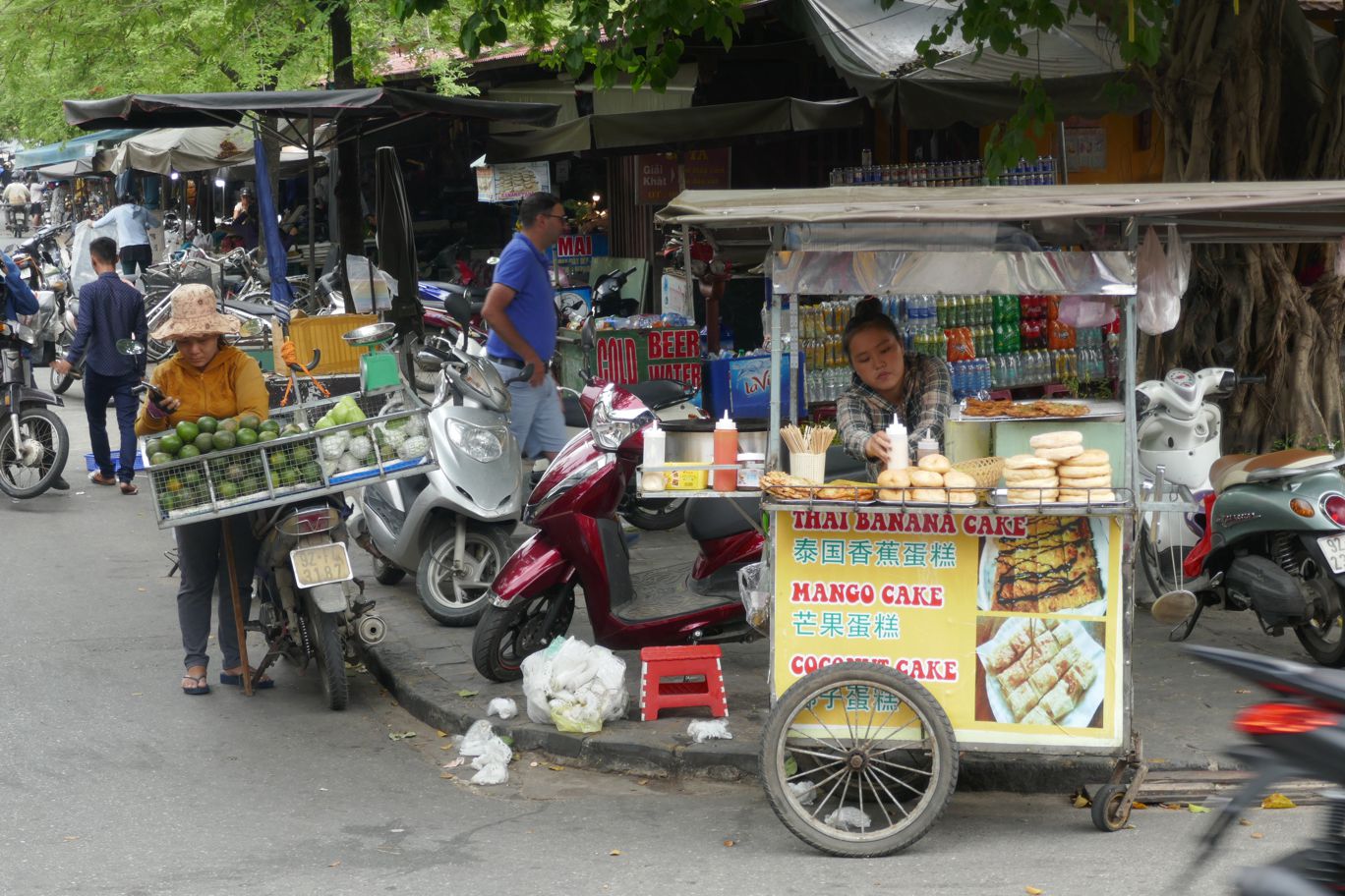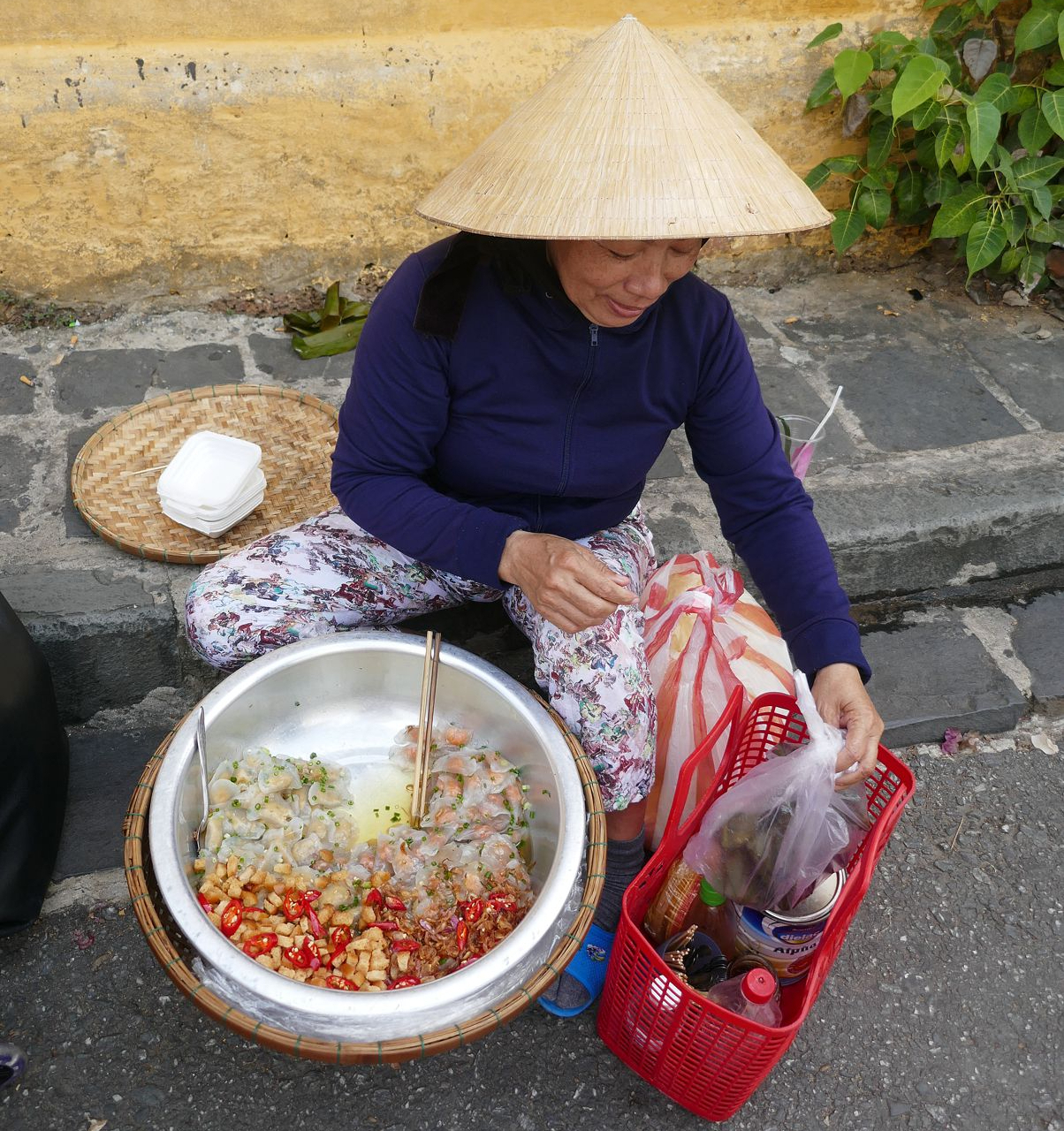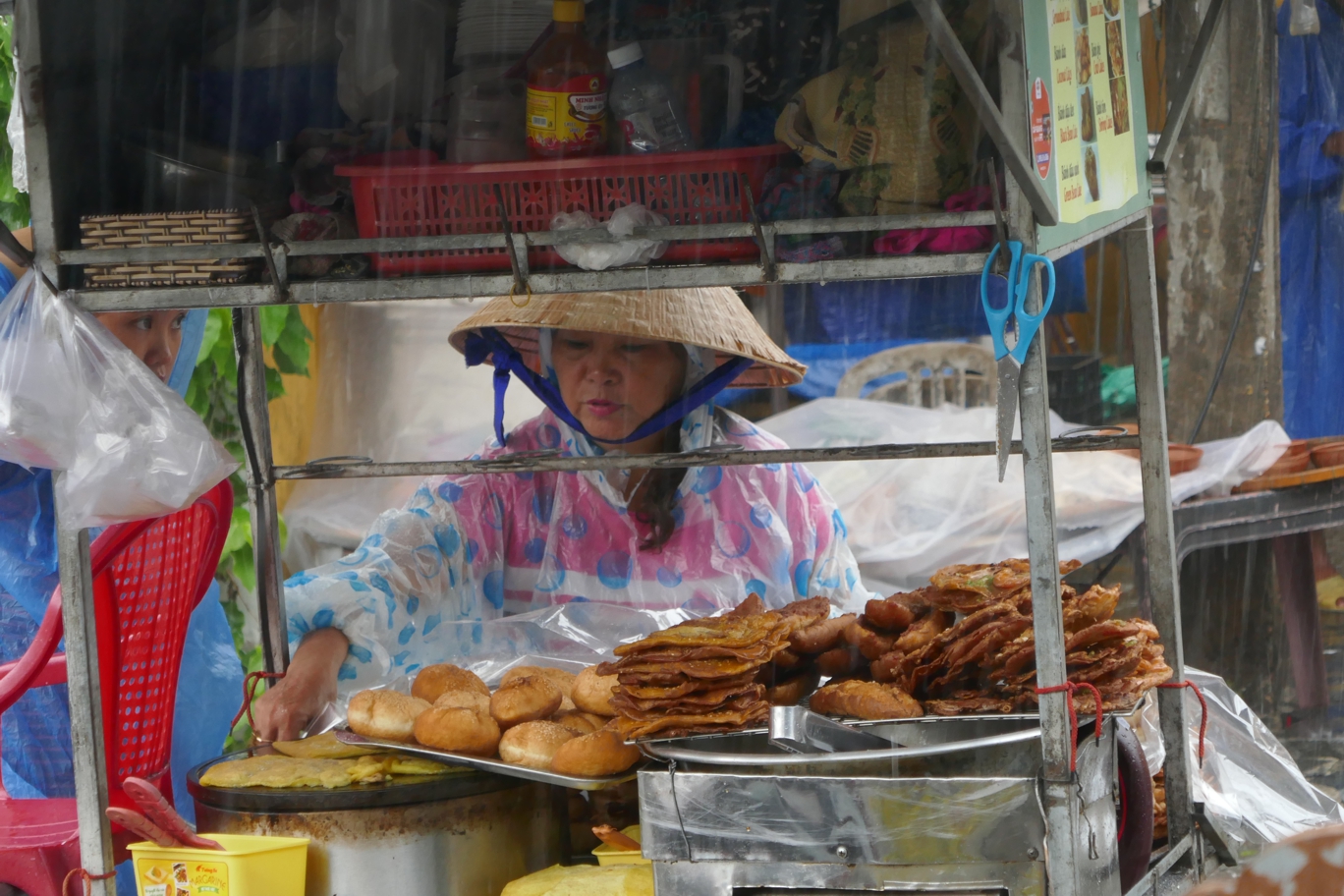 An einer Straßenecke bietet eine ältere Dame einige kleine vietnamesische „Snacks“ an; rundum stehen jüngere Leute, die alle eine kleine Tüte mit Shrimpsravioli und anderem in der Hand haben. Ich bekomme ein paar davon zum probieren.