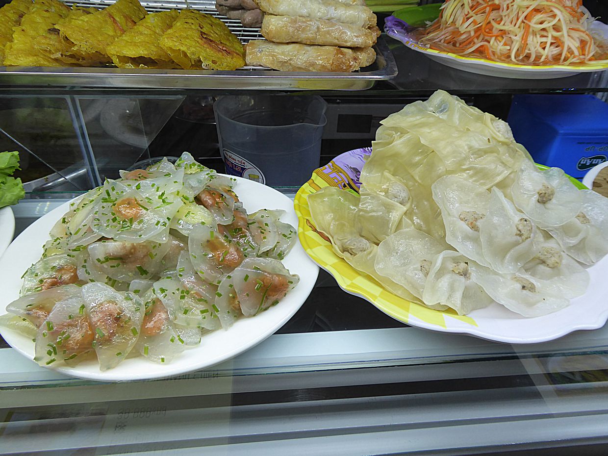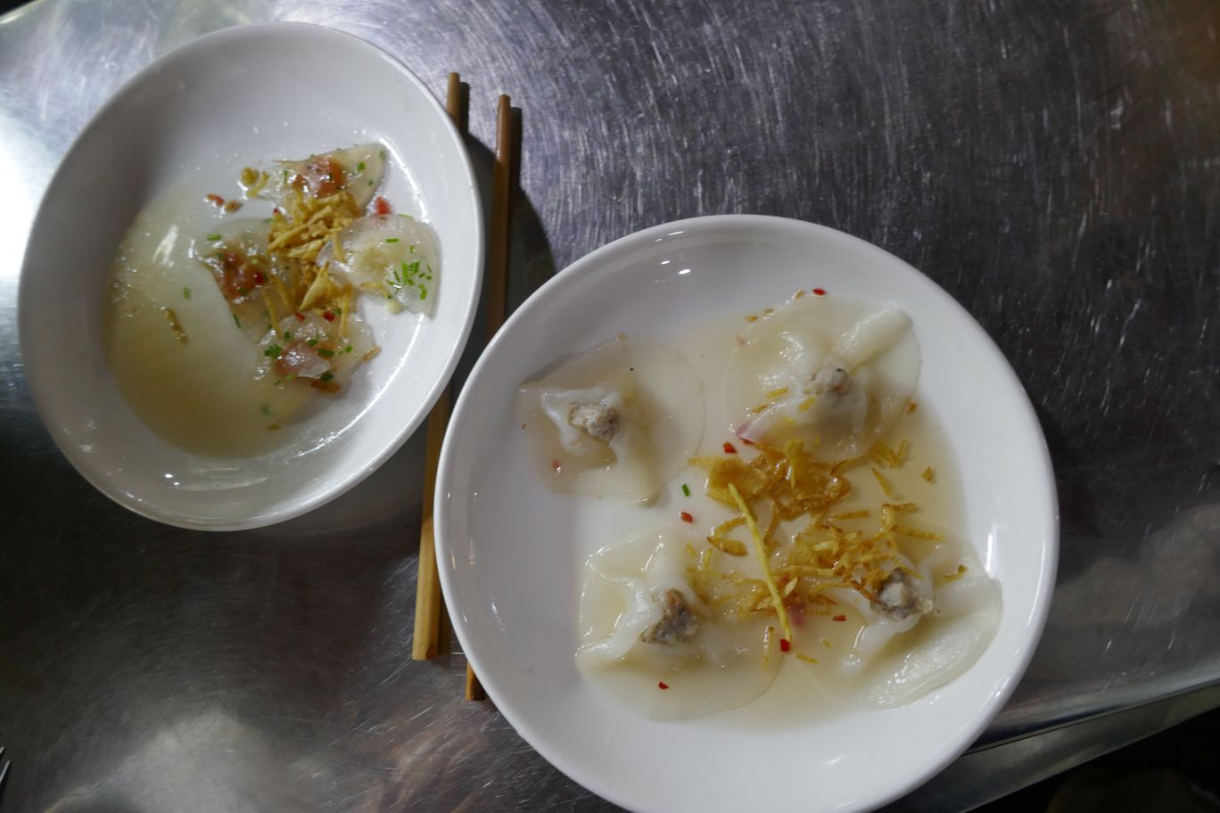 Zwischendrin ist ein Stand, an dem einige Einheimische essen – für uns Anlass, ein paar der gefüllten Teigtaschen, die in der Auslage stehen, zu probieren. Für unseren Geschmack nicht sonderlich begeisternd – Reispapier mit Shrimps-Schnippel oder ein wenig Fleisch, in süßlich-scharfer Soße und in Bananenblättern gedämpfter Reis.