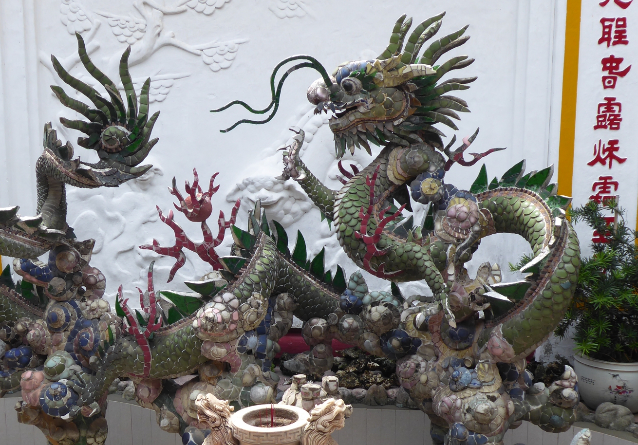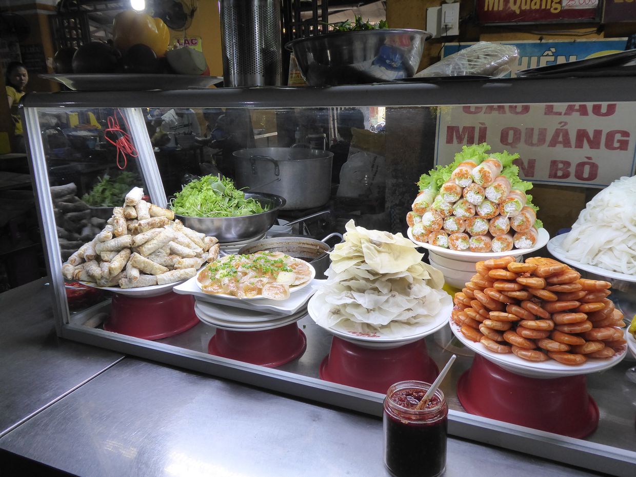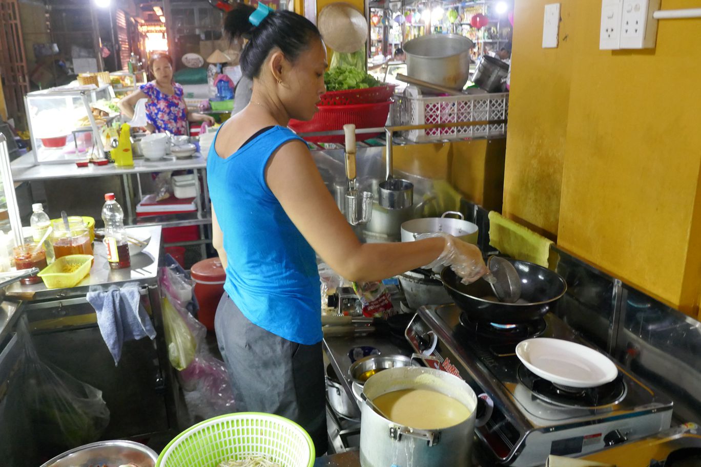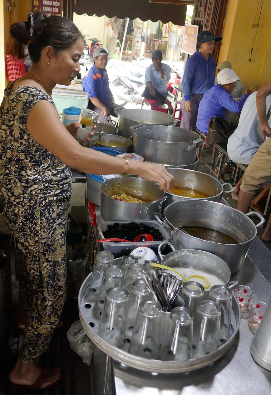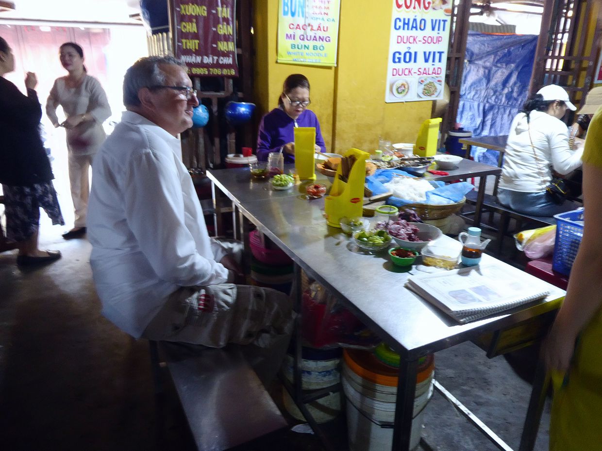 Das genießen wir mitten im Viertel, und interessanterweise erhalten wir tatsächlich in Zusammenstellung und Würze kein typisches Touristenmenü – ob Pilz-Tofu-Suppe, Reiskruste mit leckerer Gemüseauflage, Wasserspinat mit irgendetwas Geröstetem und viel Knoblauch, geschmortes Hühnchen mit Zwiebeln, Ingwer, Tomaten und einigem anderen, gegrillter Fisch in würzig-brauner Sauce oder Bananenblütensalat.