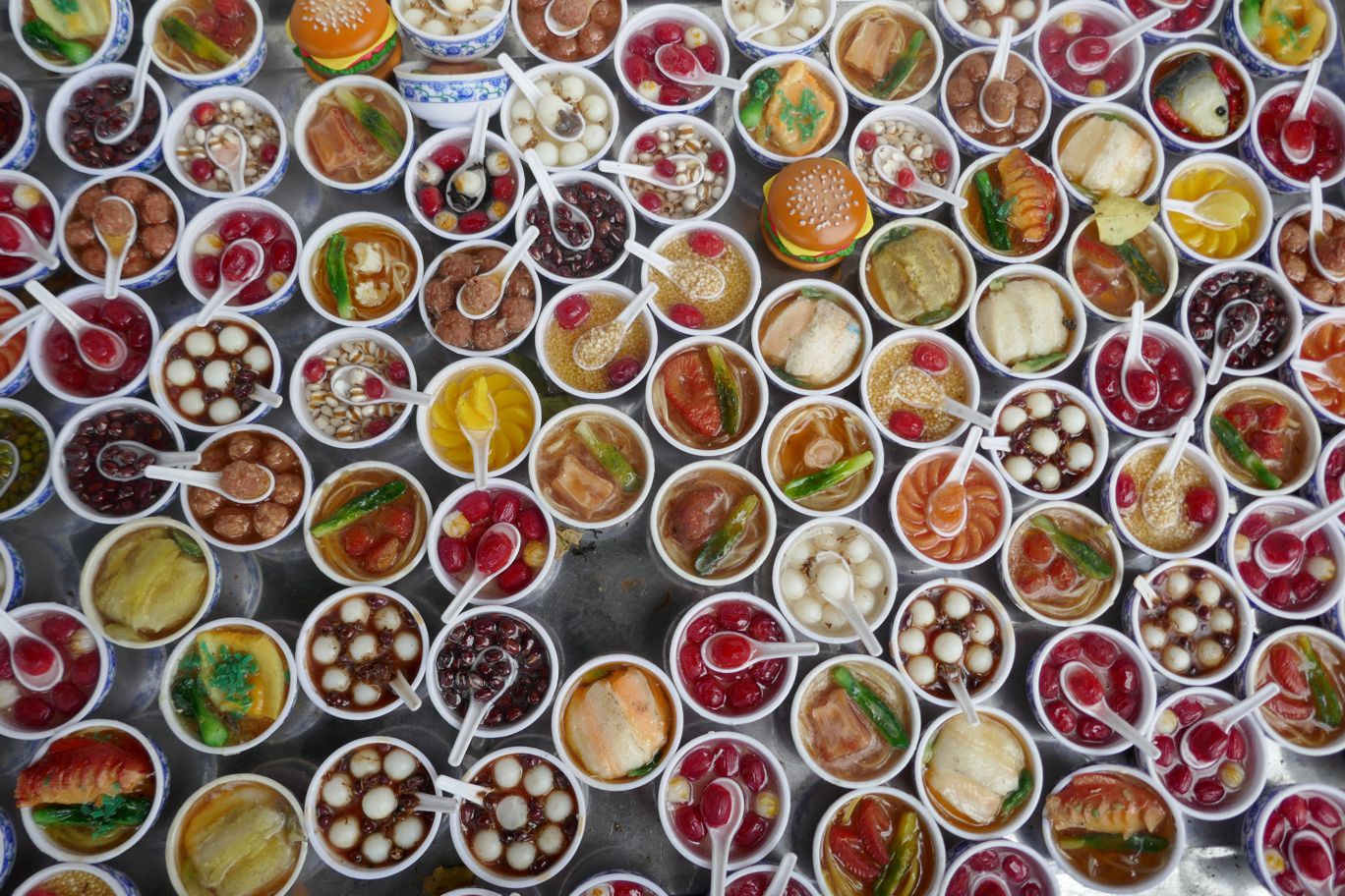 Ein paar Knabbernüsse, ein gebackenes Teilchen, ein Plastik-Flatter-Vogel, ein rasender blinkender Kreisel, Tiger-Balsam, eine Ledertasche, irgendwelche Keramikprodukte, und was alles mehr – und dazu noch diejenigen, die sich als Wegweiser zu irgendeinem Laden aufstellen.