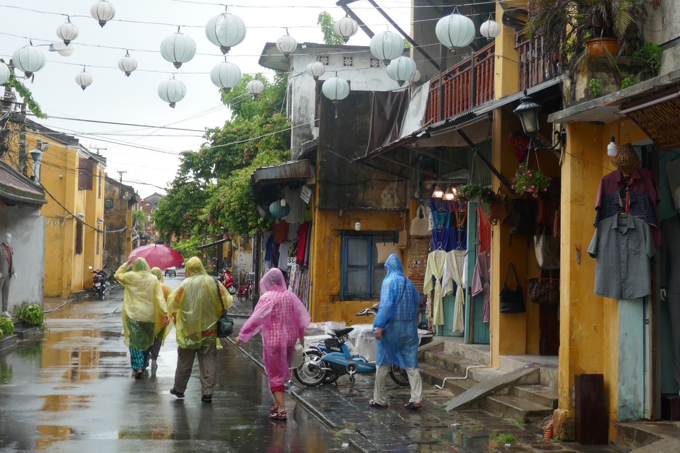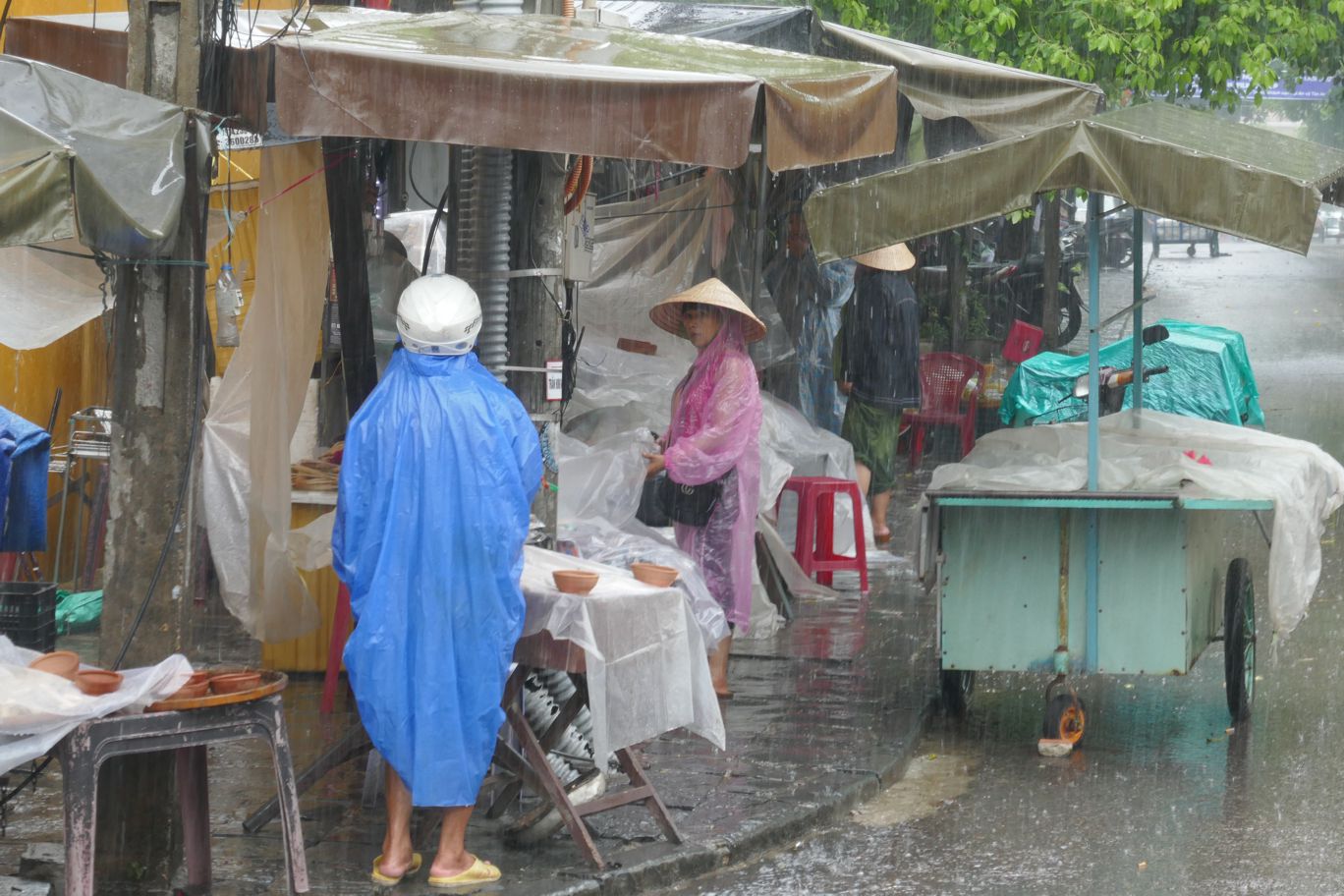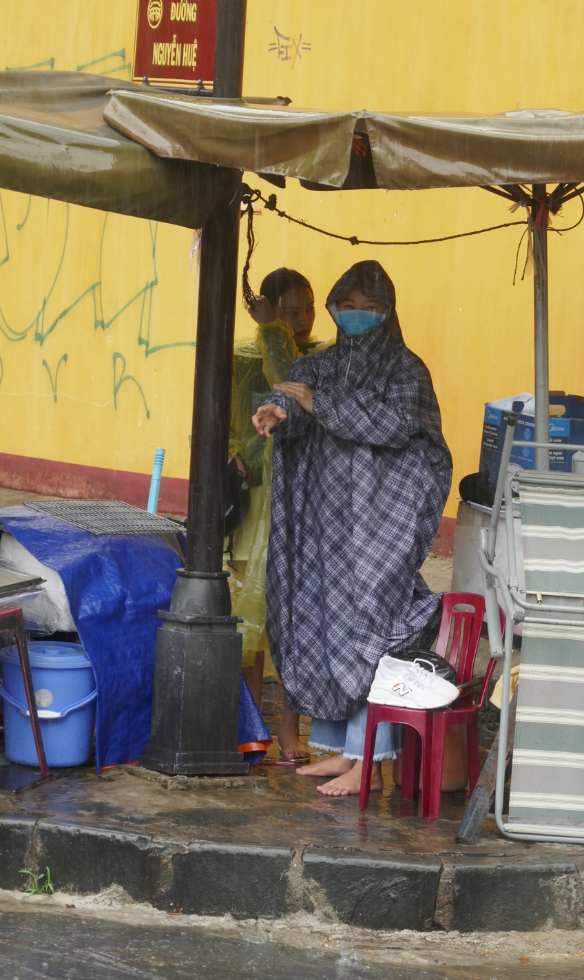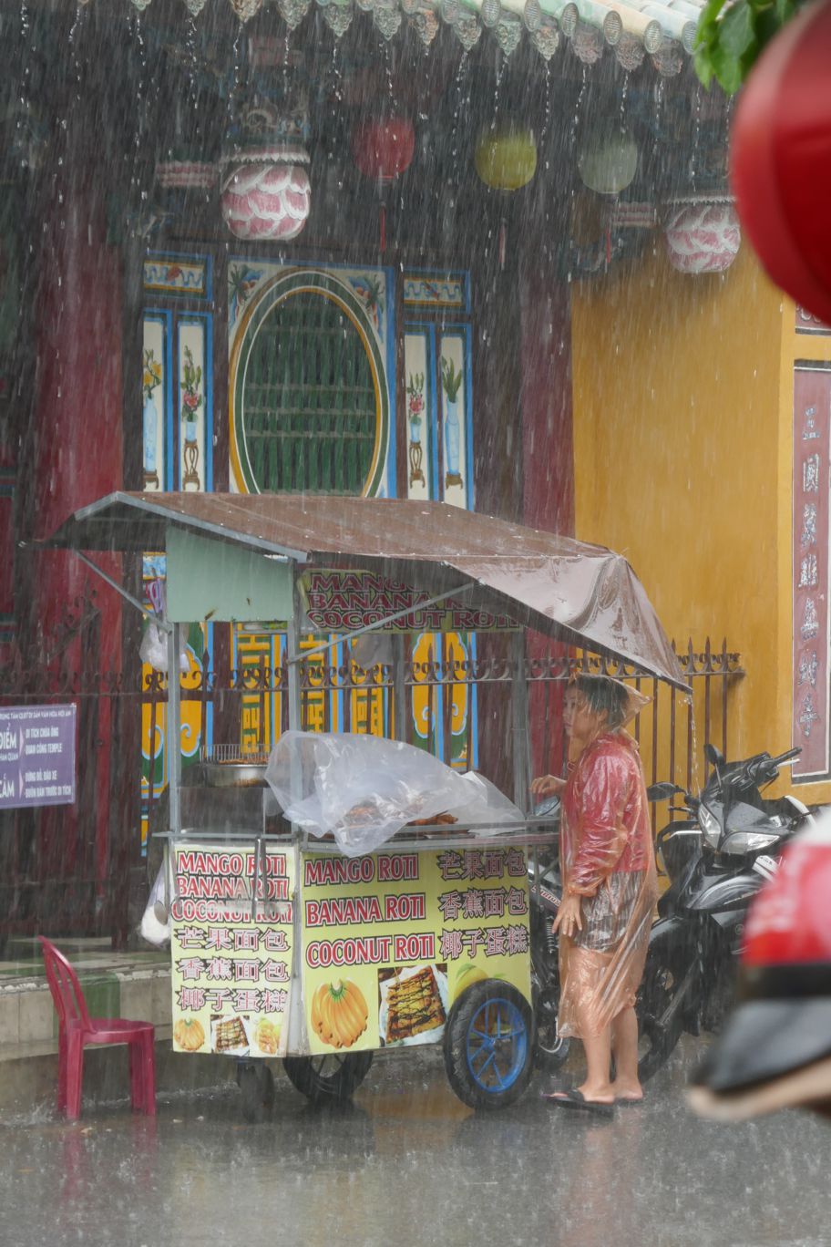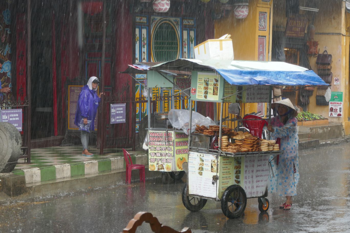 Längeres Warten. Um uns herum werden Verkaufsstände umgebaut, Fahrrad- und Mopedfahrer vermummen sich. Irgendwann entschließen wir uns auch, ein paar Plastik-Regenumhänge zu kaufen – schließlich wollen wir endlich hinsitzen und zu Mittag essen.
